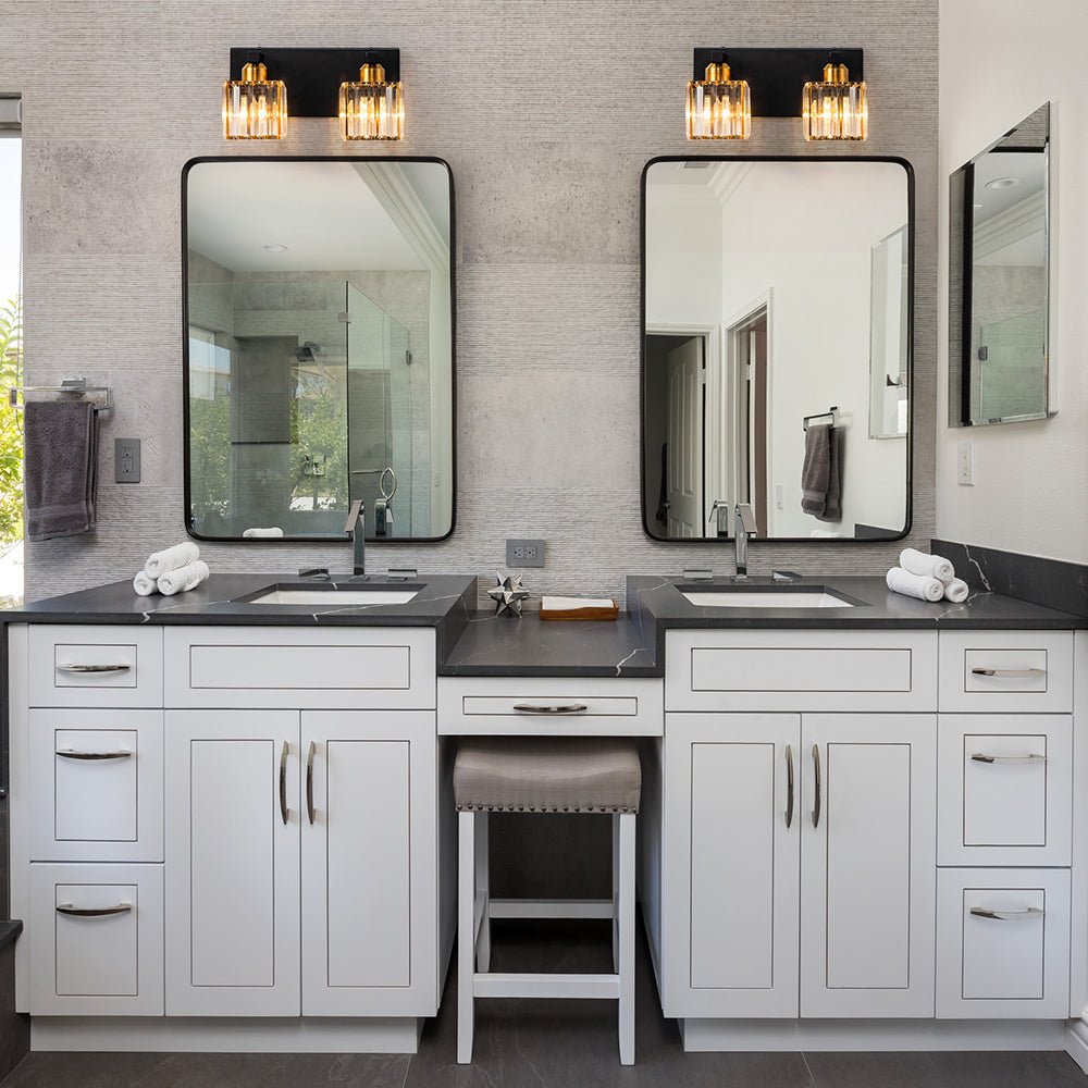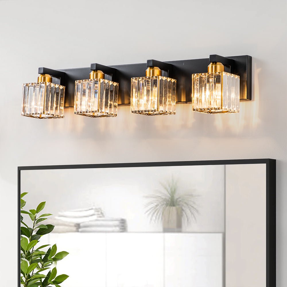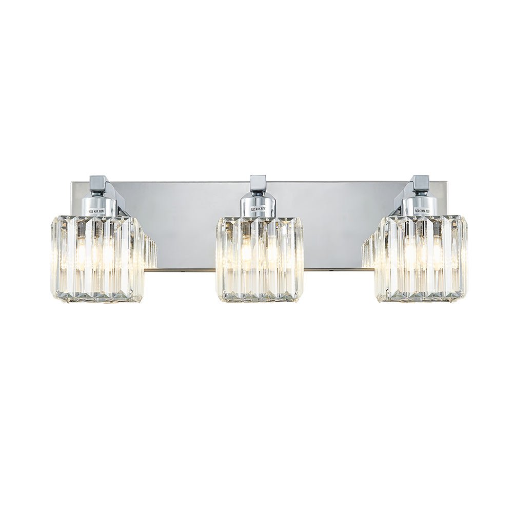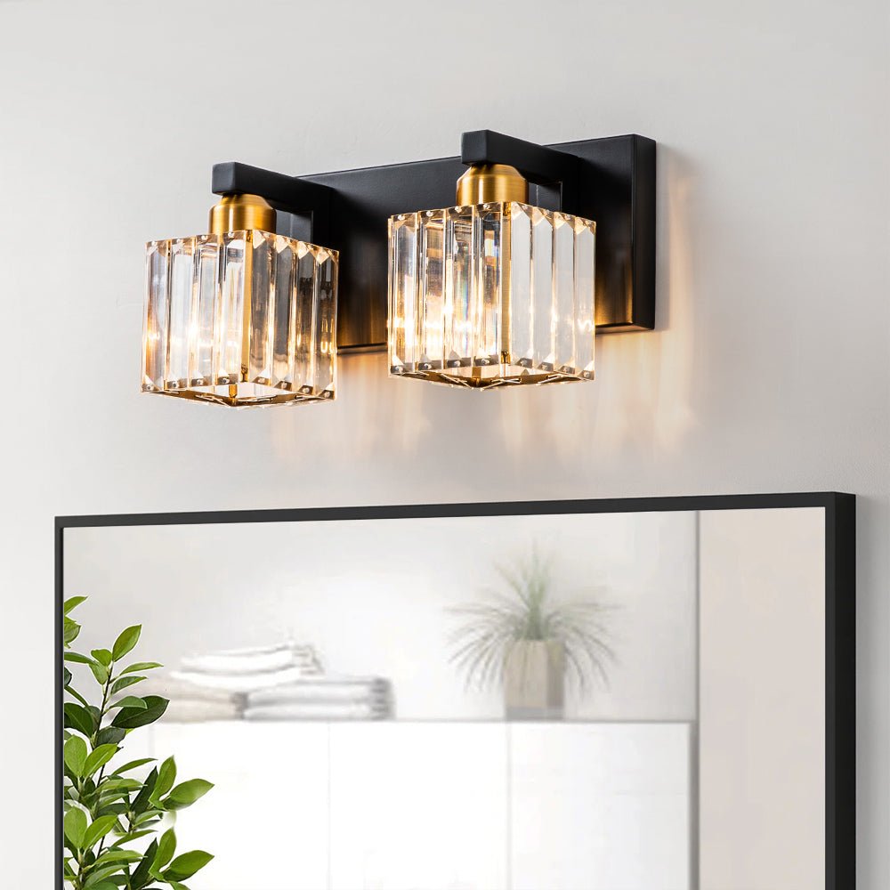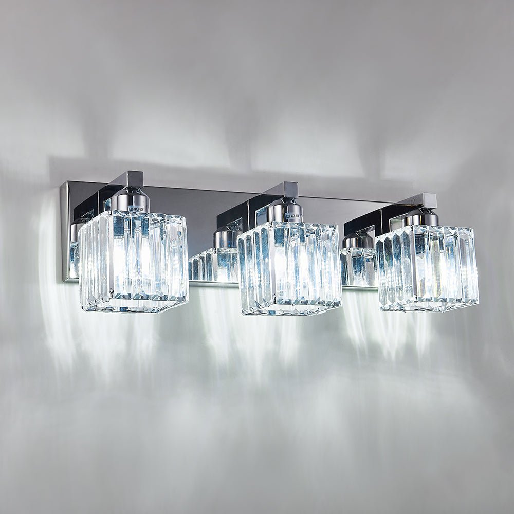 Timanttien tavoin kimalteleva kristalli-seinävalaisin on upea lisä kylpyhuoneeseen, pesualtaan, turhamaisuuteen, pukeutumistilaan tai olohuoneeseen. Suorakaiteen muotoisen taustalevyn ja kulmavarsien tukemana pyöritettävät neliömäiset varjostimet on valmistettu K9-kristallista. Kiillotettu kromiviimeistely lisää loistoa ja viehätysvoimaa tähän meikkivalaistukseen, kun taas musta ja kultainen viimeistely tuo ilmeeseen loistoa. Mukana E26-pohjaiset polttimot (ei sisällä), tämä kristallikylpyhuoneen meikkivalaisin näyttää tyylikkään ja loistavan tuloksen aina, kun käännät valokytkimen päälle.Detail