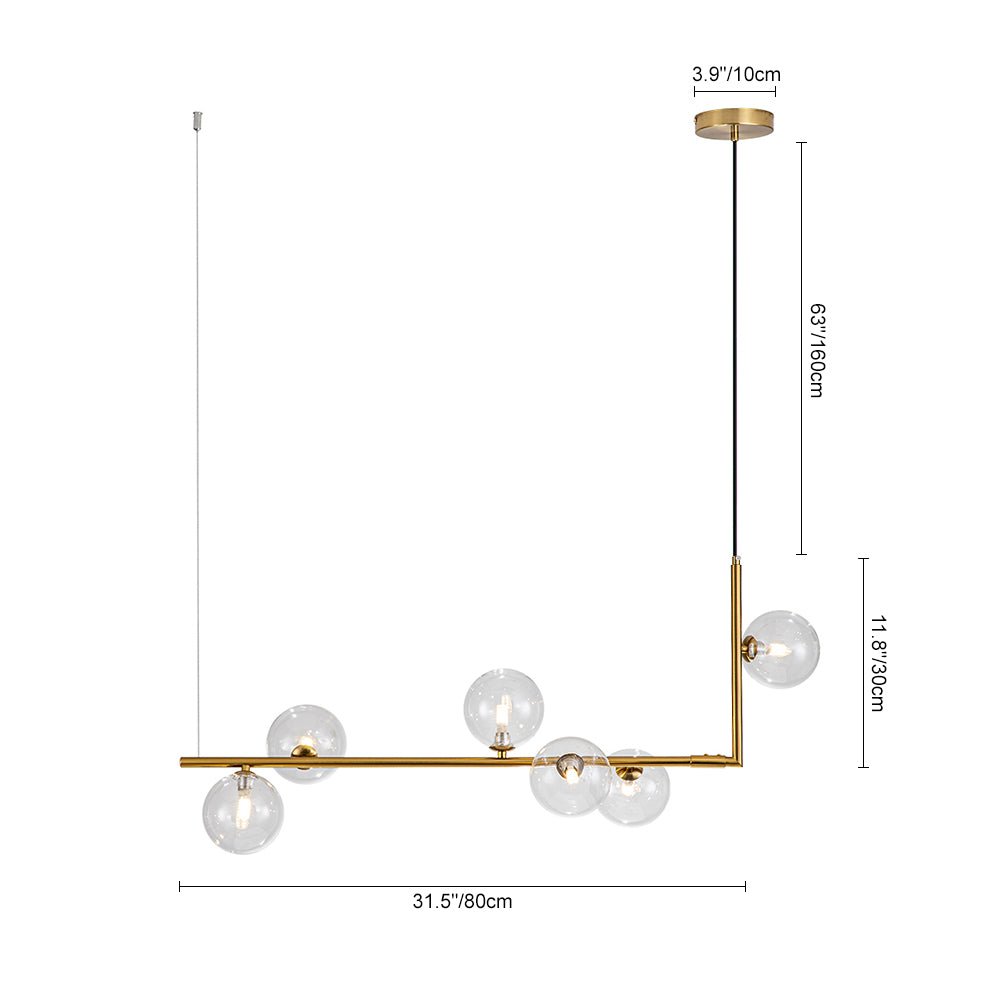 Sisustusten kirkastamisen lisäksi lasikupla-keittiön saarekeriipus tarjoaa modernin ja hienon tyylin, jossa yhdistyvät klassinen maku ja lineaarinen yksinkertaisuus. Ohut, suorakulmainen tanko kokoaa erilleen kuusi maapallon lasivarjostusta, jotka näyttävät ryhmältä söpöjä kuplia, jotka tanssivat oljella. Vanhentunut messinki tai musta viimeistely lisää vuosisadan puolivälin lasikuplakruunun kosketuksen. Kirkkaan lasin läpi valaisevat G9-polttimot (ei sisälly toimitukseen), joten voit nauttia tämän riippuvan keittiön valaisimen runsaasta hehkusta jokapäiväisessä elämässä. Kaksi säädettävää kaapelia varmistavat, että voit sijoittaa tämän riippuvalaisimen useimpiin korkeisiin kattoihin. Suosittelemme lisäämään tämän lasikupla-keittiösaarekkeen lineaaririipuksen keittiötason, pitkän ruokapöydän tai olohuoneen yläpuolelle.Tiedot