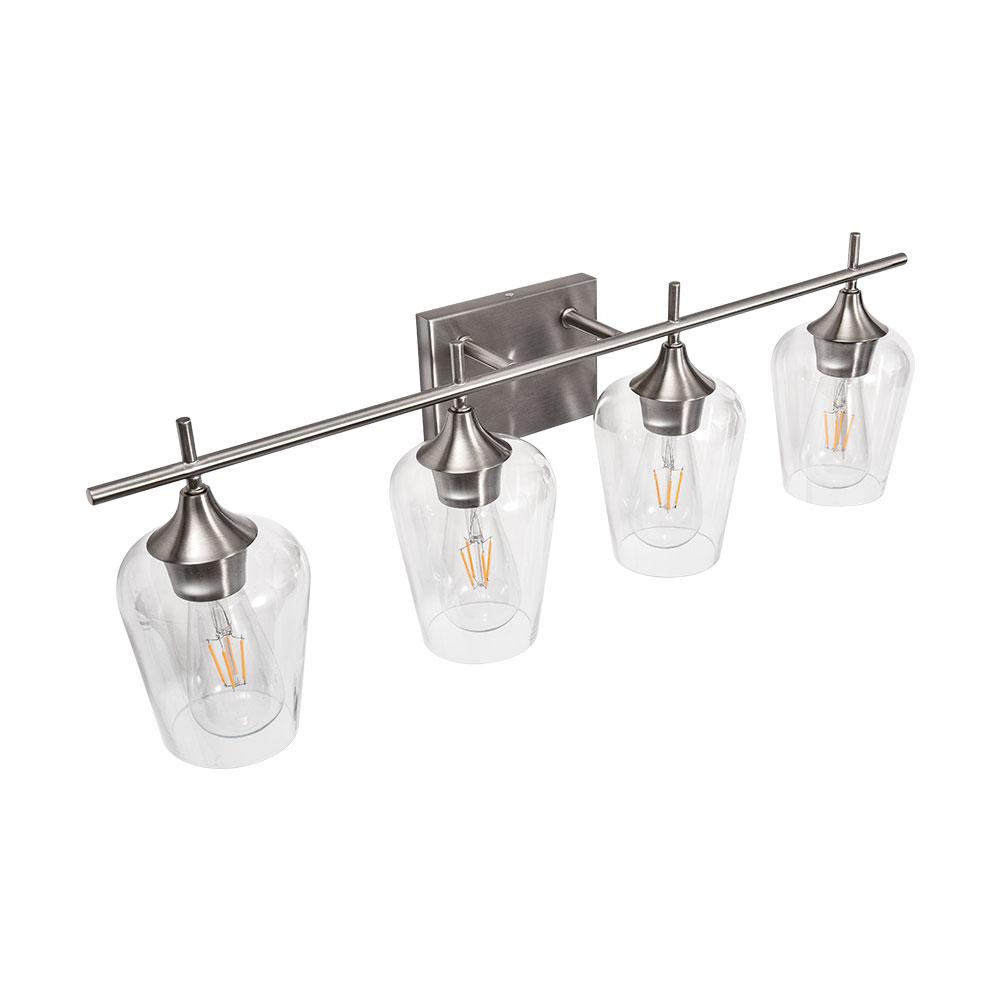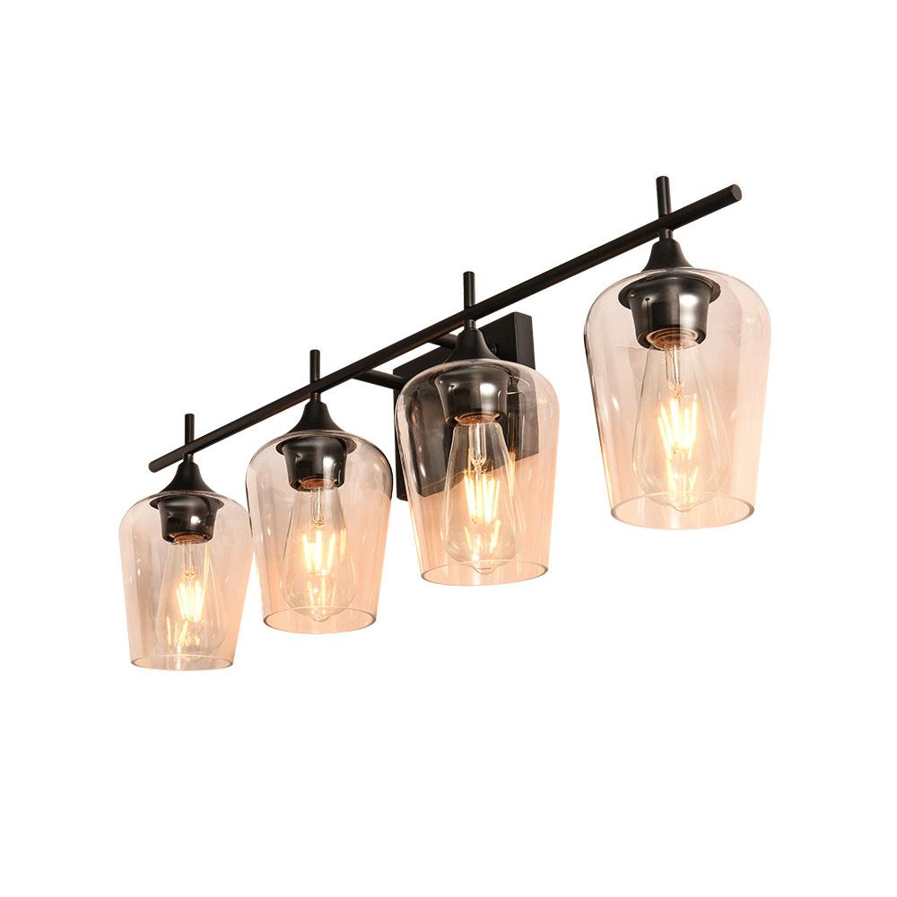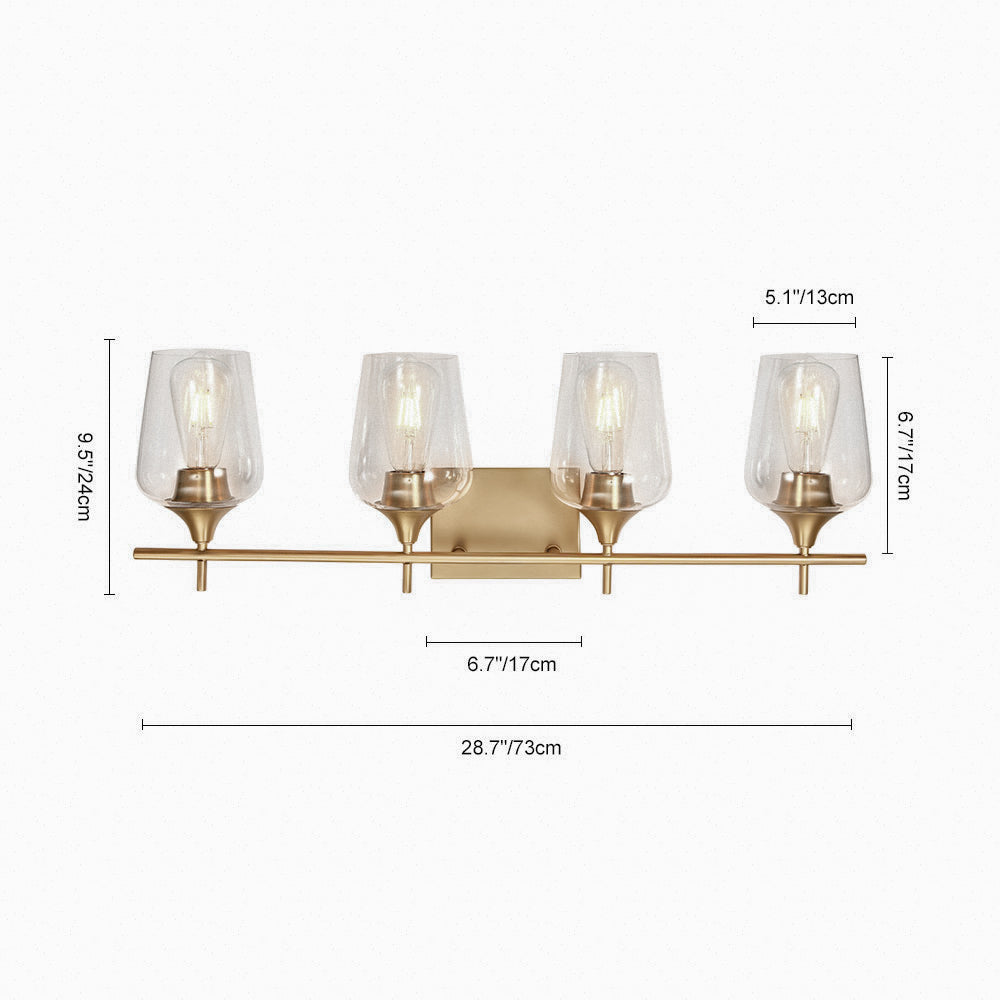 Näyttää neljältä tyylikkäältä viinilasilta, jotka istuvat vaakasuoran tangon päällä, ja tämä 4-valaisin valaisee seinäalueesi upeasti. Tämä lasiseinävalaisin, johon mahtuu neljä keskikokoista E26/E27-polttimoa (ei sisälly toimitukseen), lisää kirkkautta, mikä hyödyttää meikkiä, pukemista tai muuta jokapäiväistä elämää. Mukavuuden vuoksi tämä meikkivalaisin on saatavana joko ylä- tai alasvalaistukseen asennettavaksi. Tämä upean kokoinen (73 cm x 24 cm x 15 cm) tämä moderni 4-luvun puolivälin turhamaisuusvalaisin on kaunis ja hyödyllinen lisä isoon pukuhuoneeseen, käytävään, hotellin käytävään tai vierashuoneeseen. Hanki ILMAINEN toimitus tällä klassisella lasiseinävalaisimella nyt.Detail