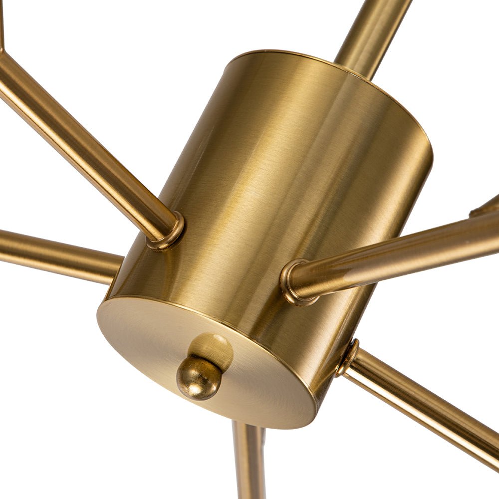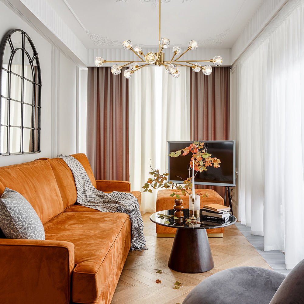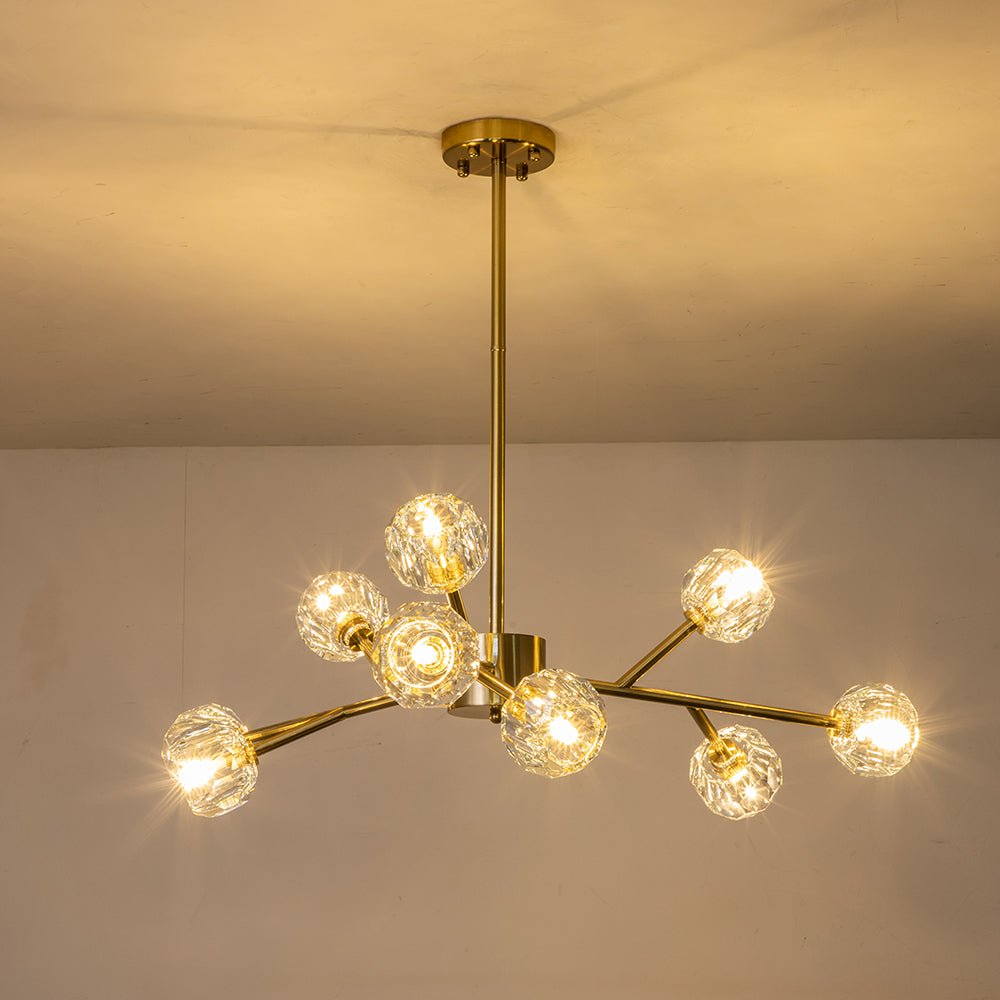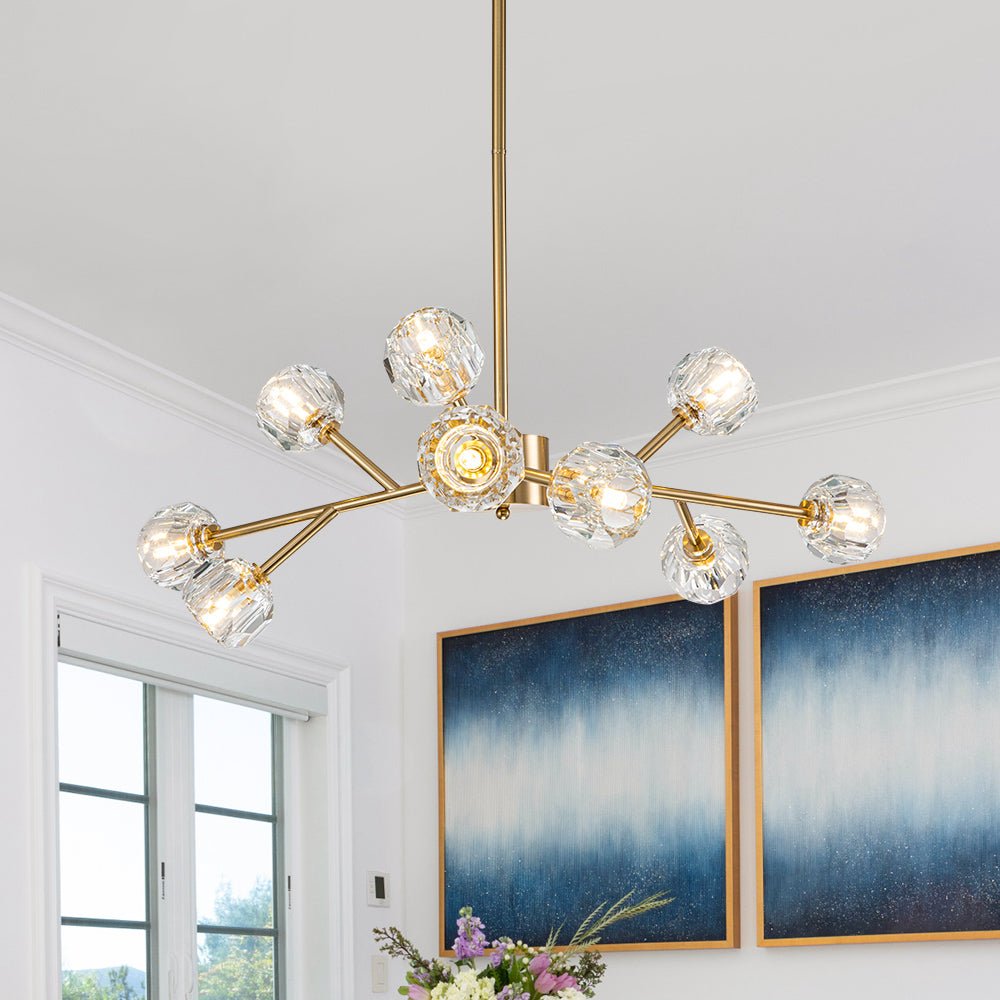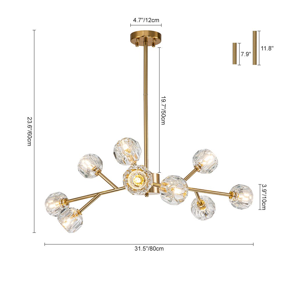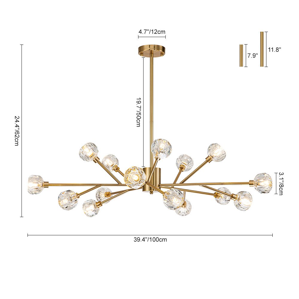 Tämä messinkinen kattokruunu on upea keskipiste, jossa yhdistyy upea käsityötaito ja moderni sputnik-design. Kun tämä kristallikruunu sytytetään, se säteilee kiehtovaa näytelmää loistavista kipinöistä, jotka hämmästyttävät sen näkeviä. Korosta olohuonettasi, ruokailuhuonettasi, eteistäsi, eteistäsi tai makuuhuoneesi tällä messinkikristallisella sputnik-kruunulla, jossa yhdistyvät taidokkaasti vuosisadan puolivälin elementit ja moderni hienostuneisuus.Tiedot