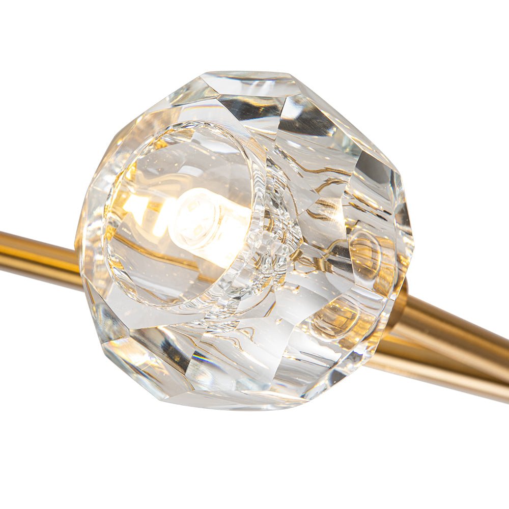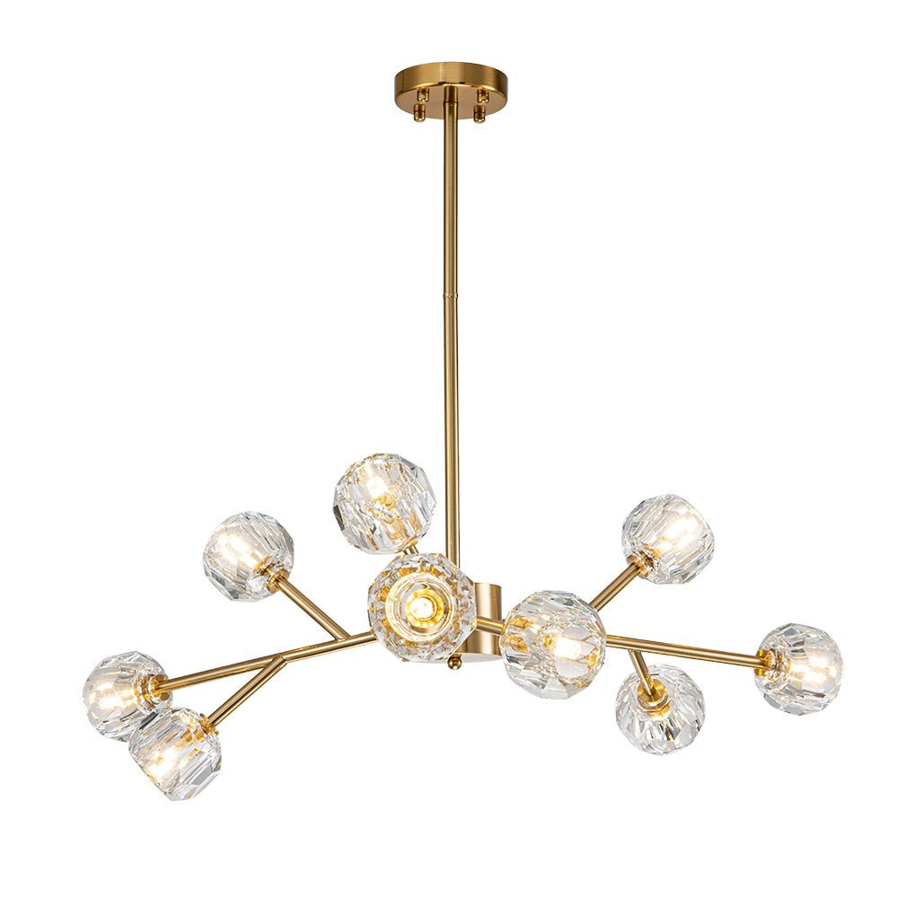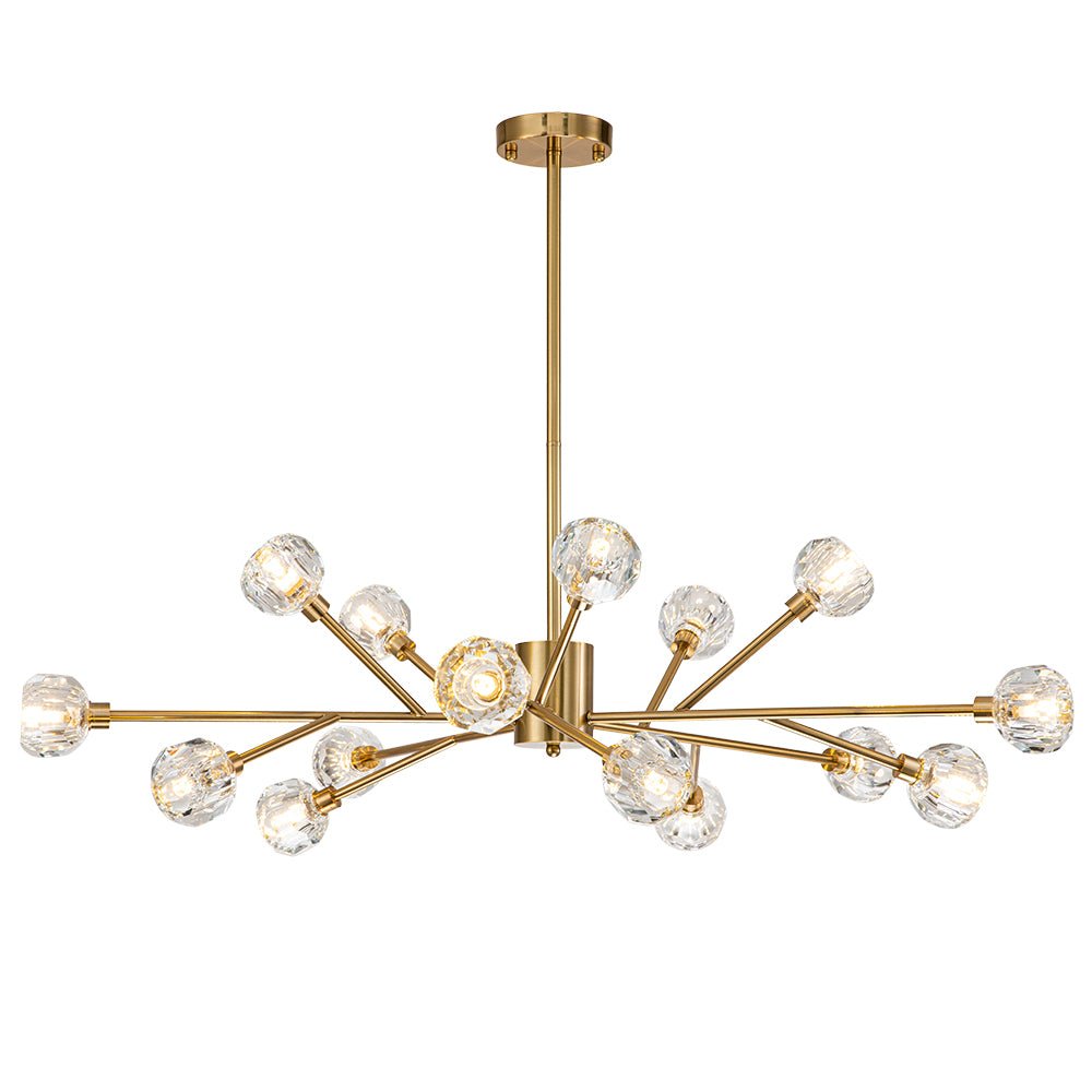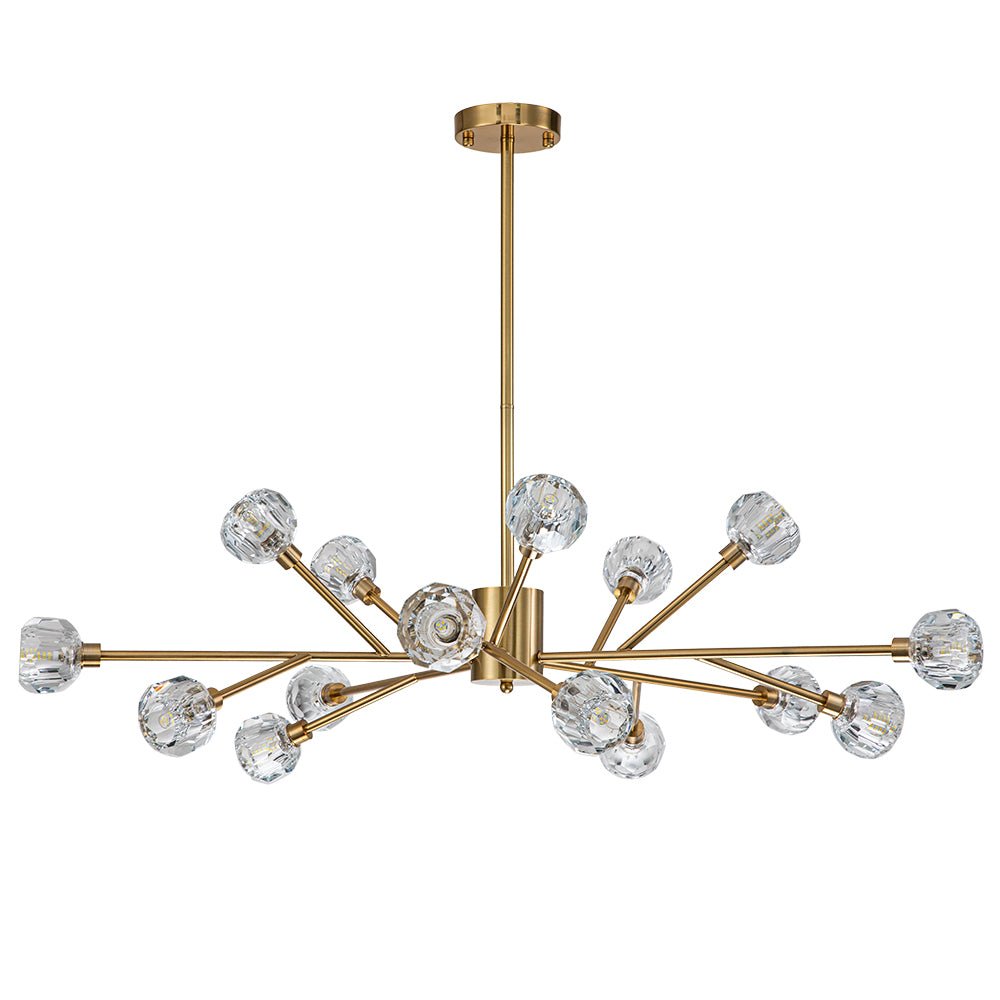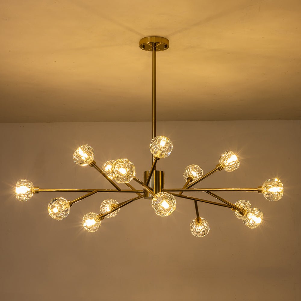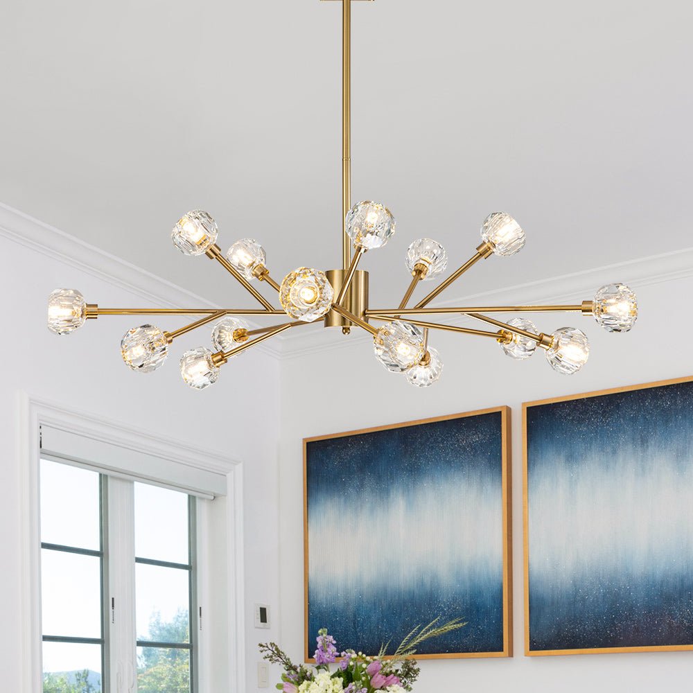 Yhdeksän/viisitoista valoa • Sävytetyt kristallikorostukset • Haaroittuvat varret • Sputnik-muotoilu • Messinkiviimeistely • G9-polttimot (ei sisälly) • Kiinteä • UL-listattu