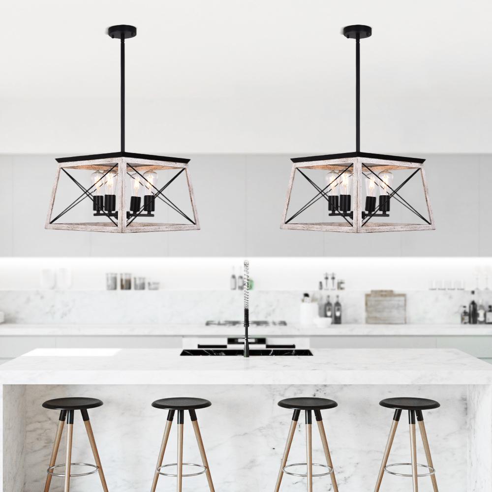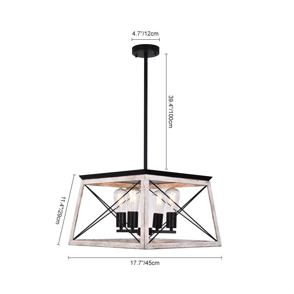 Maalaistalon suunnittelun innoittama moderni rustiikki suorakaiteen muotoinen lyhtykruunu sopii täydellisesti nykyaikaiseen tai siirtymäkauden sisustukseen. Tässä maalaismaisessa suorakaiteen muotoisessa lyhtykruunussa on metallista valmistettu tekopuinen häkkikehys. Ohut ristikkäiset linjat muodostavat suorakaiteen muotoisen lyhtykruunun retro-ilmeen. Neljän esillä olevan E26/E27-keskikantisen lampun sisällä (ei sisälly toimitukseen) maalaismainen lyhtykruunu on erinomainen työvalaisin. Säädettävällä kaapelilla ripustettuna voit säätää kattoon parhaan korkeuden. Tämä maalaismainen suorakaiteen muotoinen lyhtykruunu on kooltaan 17,7 tuumaa (45 cm) leveä x 29 cm korkea, ja se on erinomainen vaihtoehto ripustettavaksi ruokapöydän, eteisen, eteisen ja pienen asuintilan päälle.