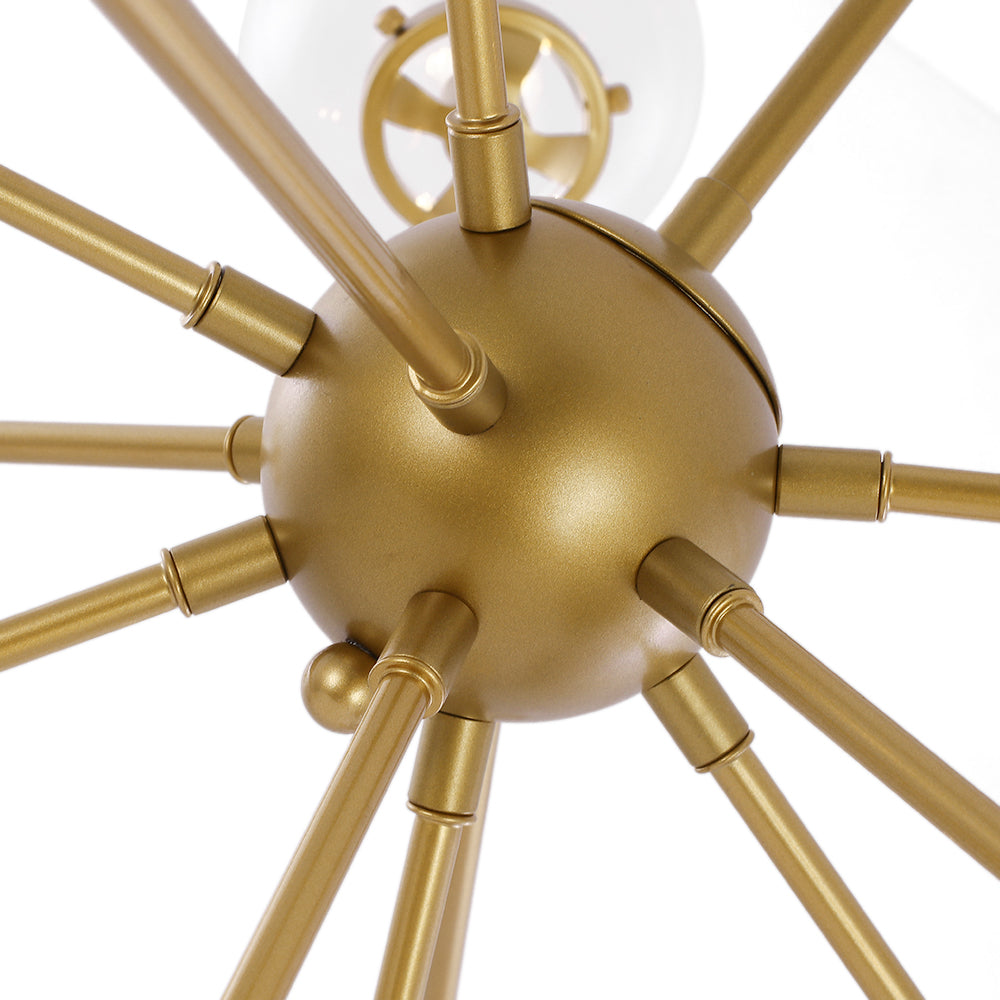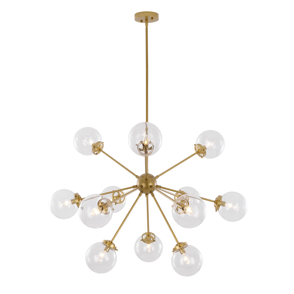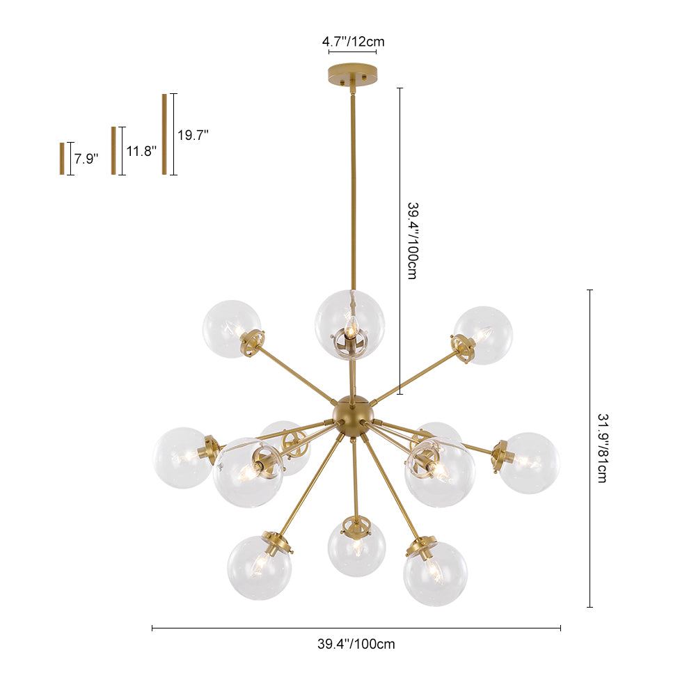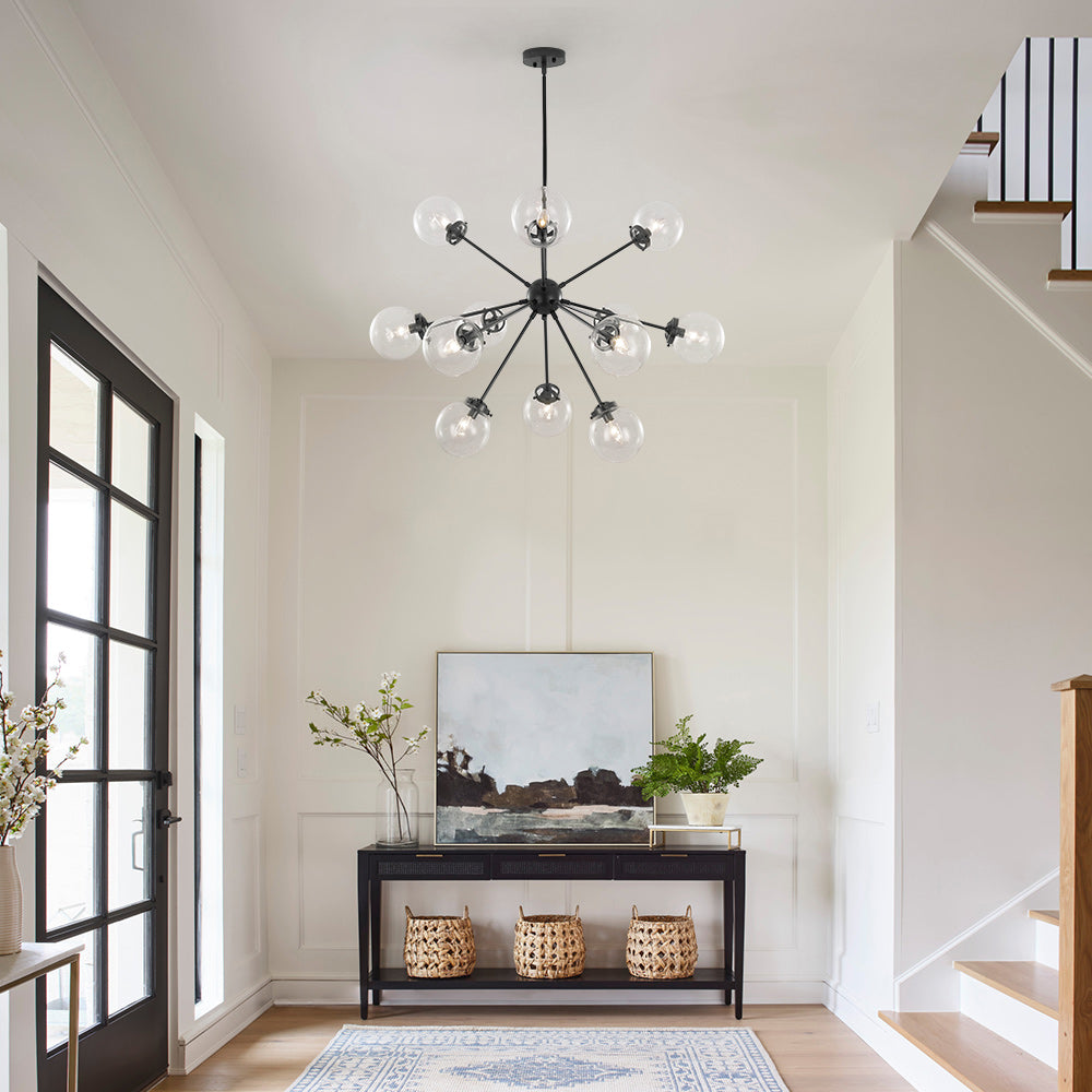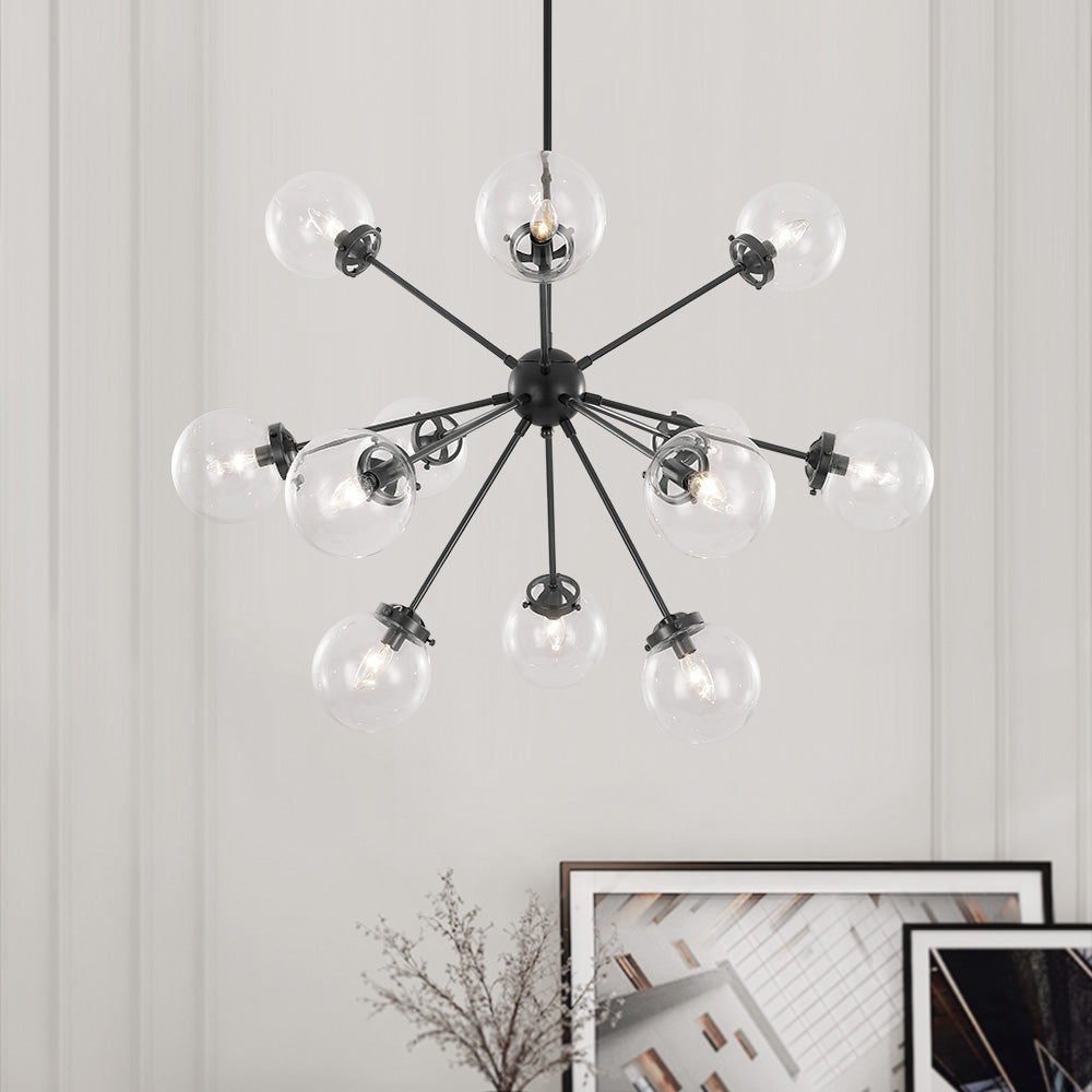 Tämä moderni pallomainen kattokruunu tarjoaa energisen sputnik-siluetin, jossa on pallomaisia sävyjä, jotka on rakennettu kirkkaasta lasista, joka antaa runsaasti valaistusta. Mattamusta tai tyylikäs messinkiviimeistely lisää upean korostuksen tähän lasimaapallon kattokruunuun. Lisäksi tämä lasimaallinen kattokruunu on saatavana himmentimellä ja himmennettävillä polttimoilla (molemmat eivät sisälly) oikean määrän valaistukseen aamusta iltaan. Säädettävällä sovittimella ja sovittimella ripustettu pallokattokruunu on yhteensopiva sekä tasaisen että viistokaton kanssa kattokorkeutesi mukaan. Lisää dramaattisuutta olohuoneeseen, ruokasaliin, eteiseen, eteiseen, hotelliin ja ravintolaan tällä pallomaisella 12-valoisella sputnik-kattokruunulla.