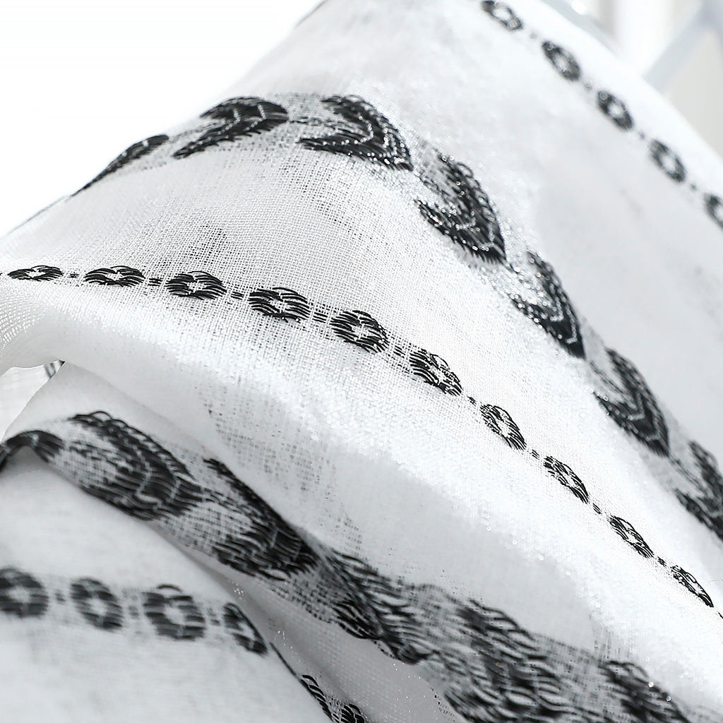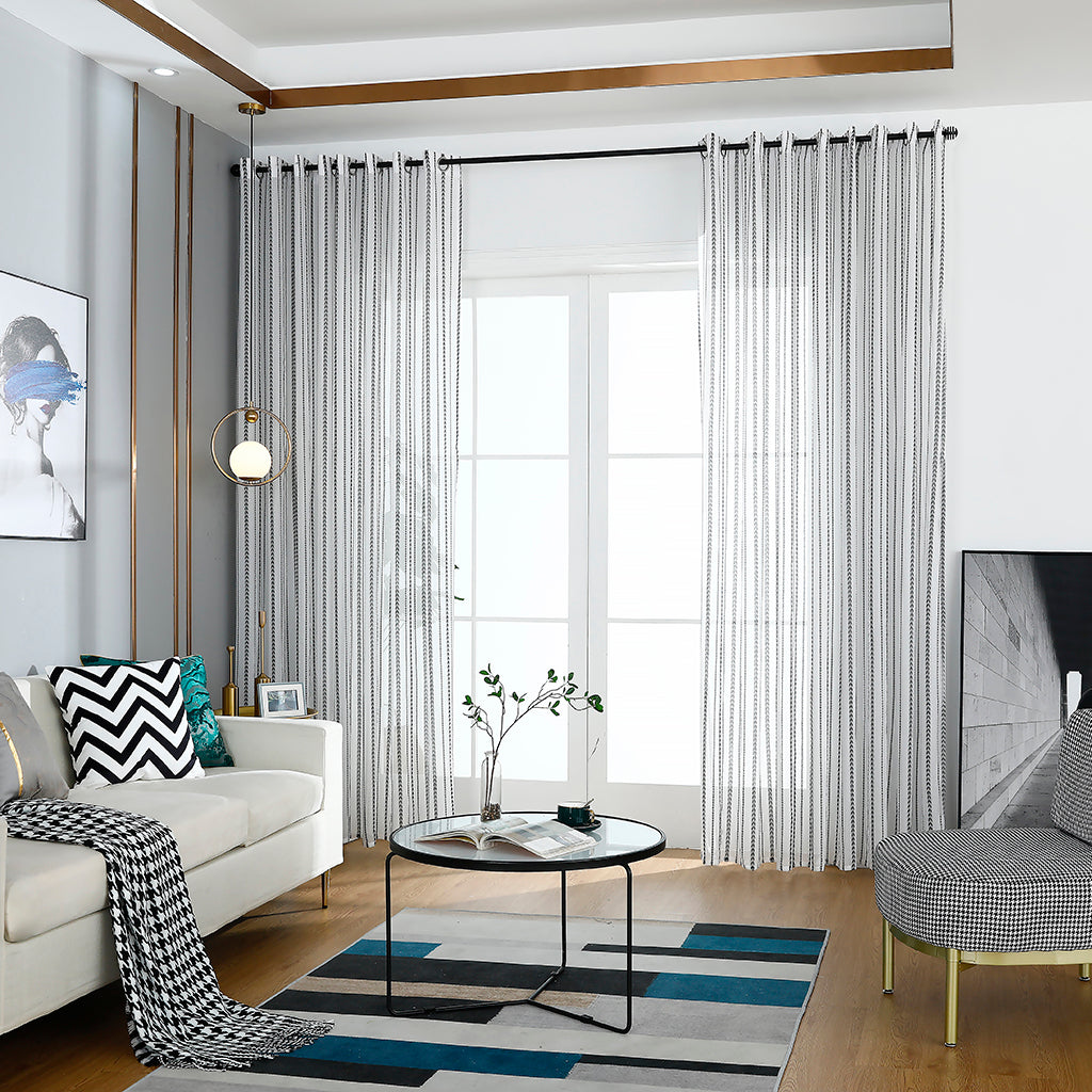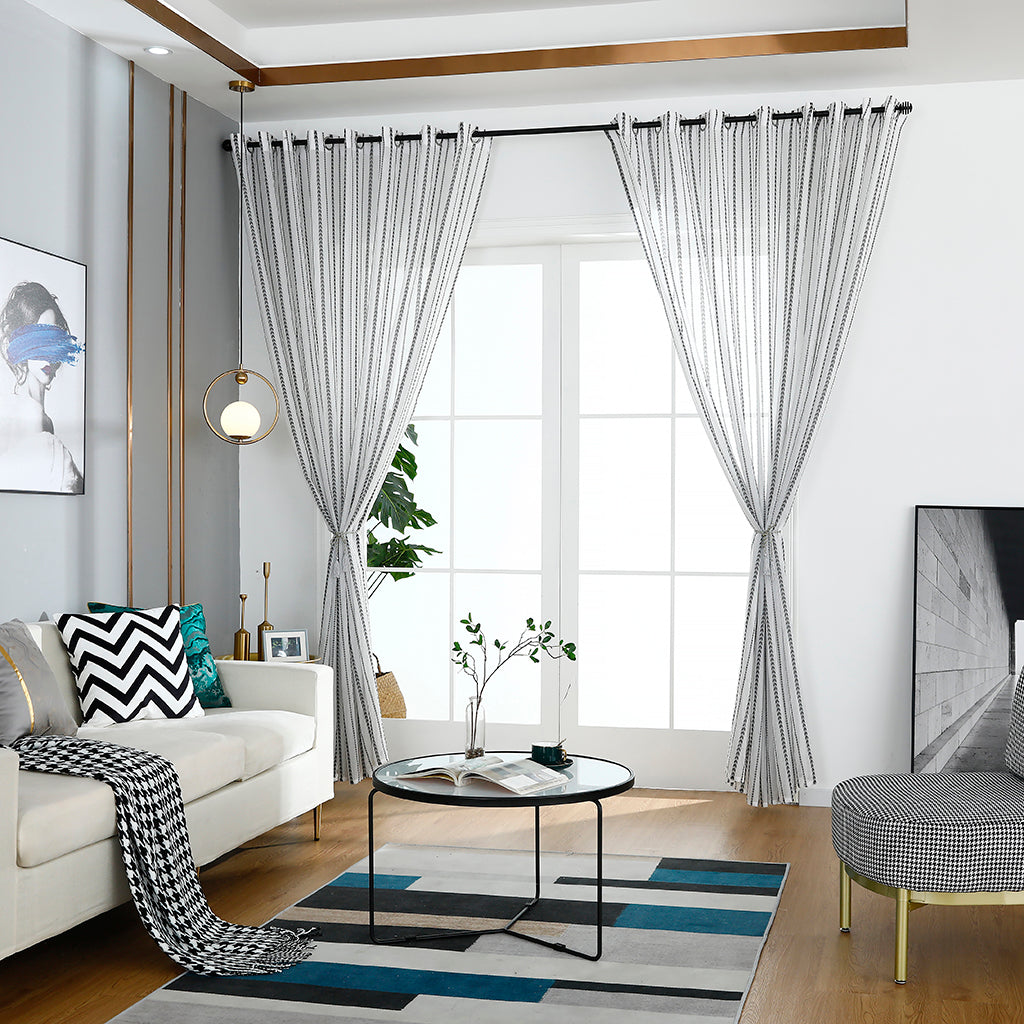 - Musta sydänkuvio näyttää erityisen hienostuneelta valkoisia verhoja vasten. Klassinen väriyhdistelmä tekee verhoista erittäin koristeellisia.