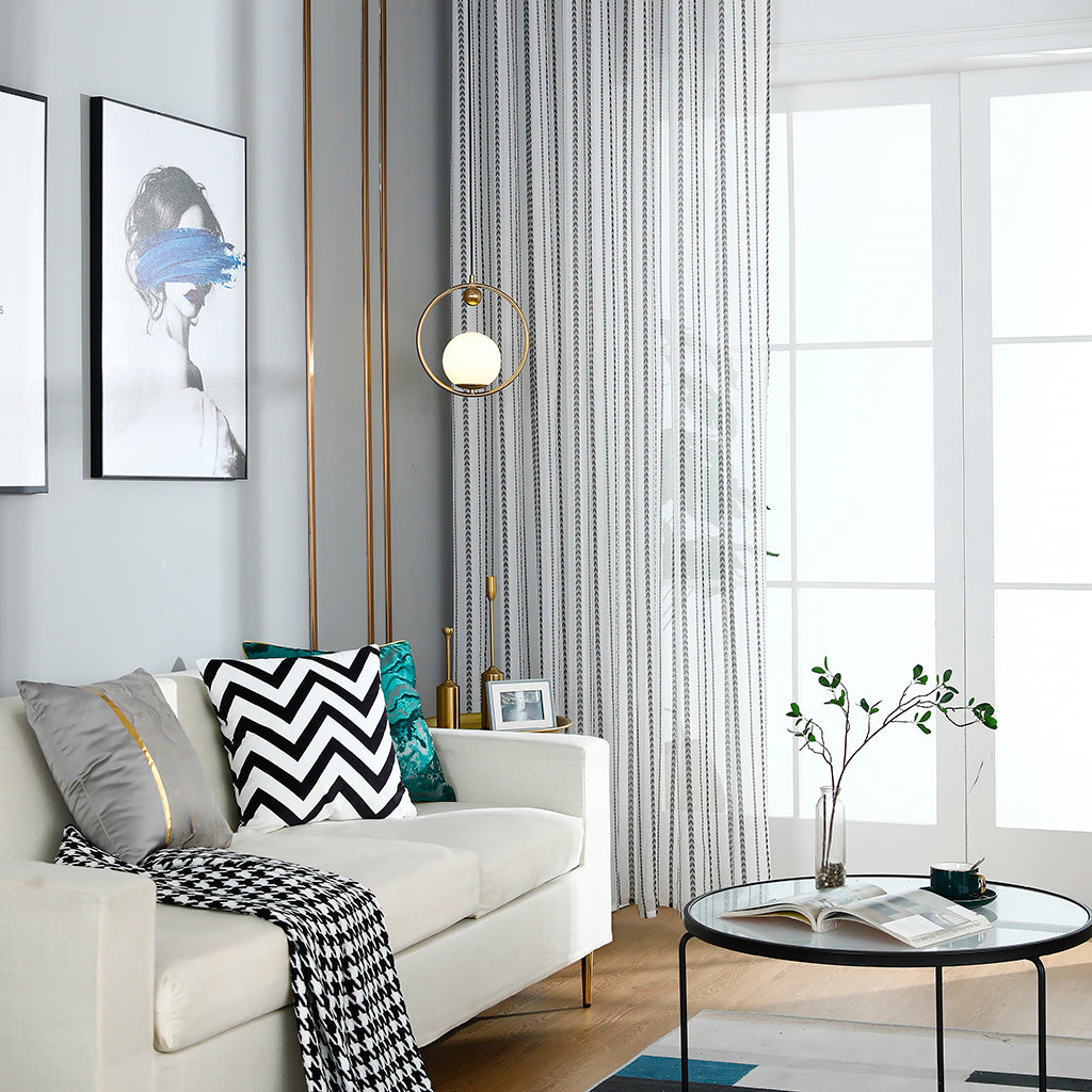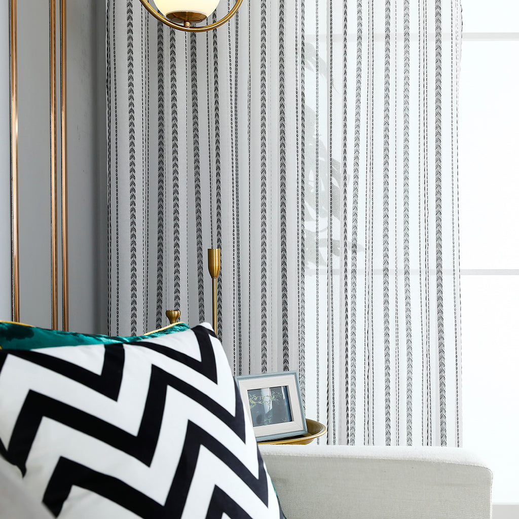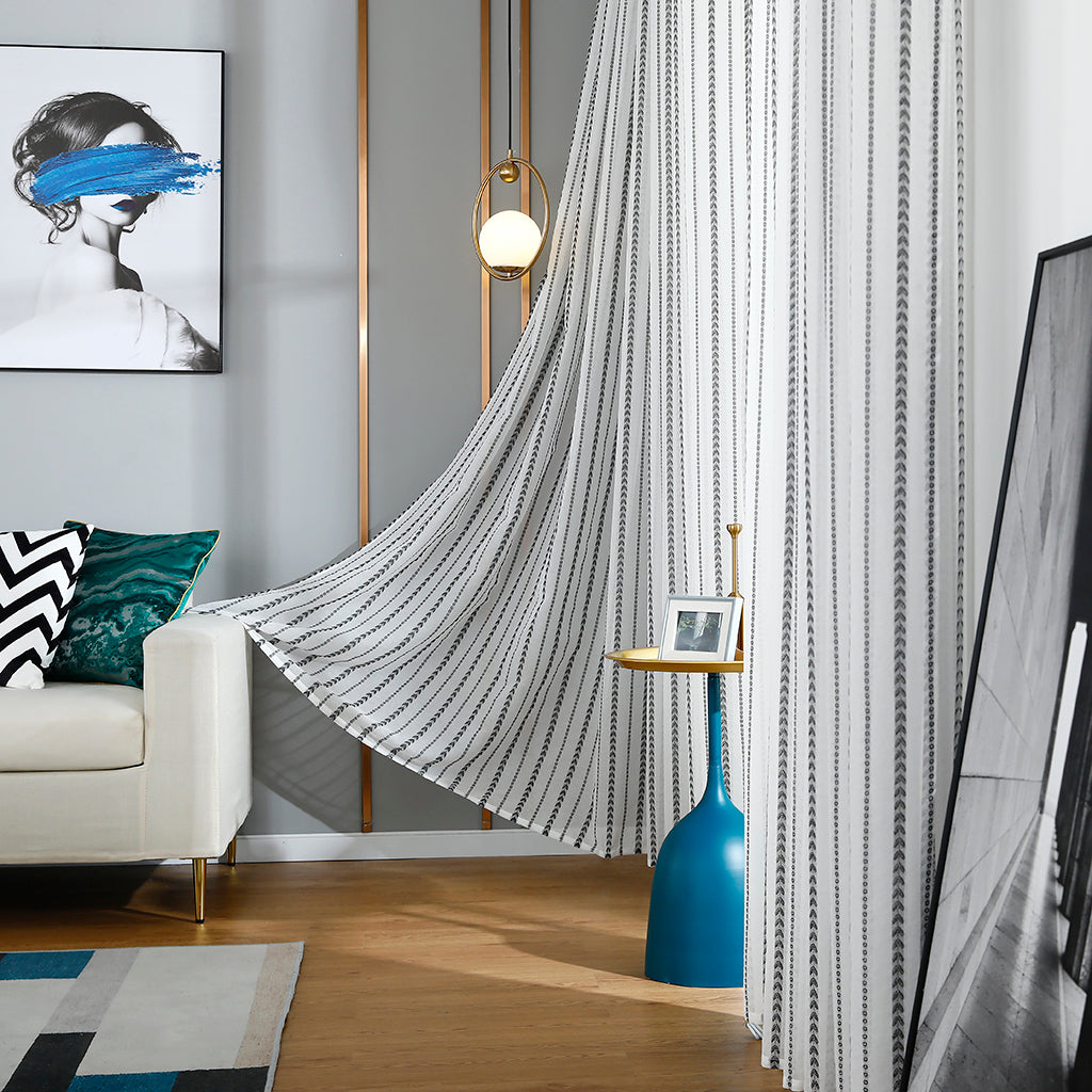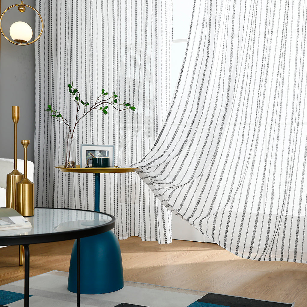 Modernit valkoiset läpinäkyvät verhot, mustat rakkausraidat, lastenhuone