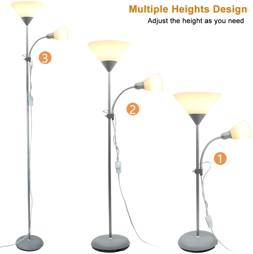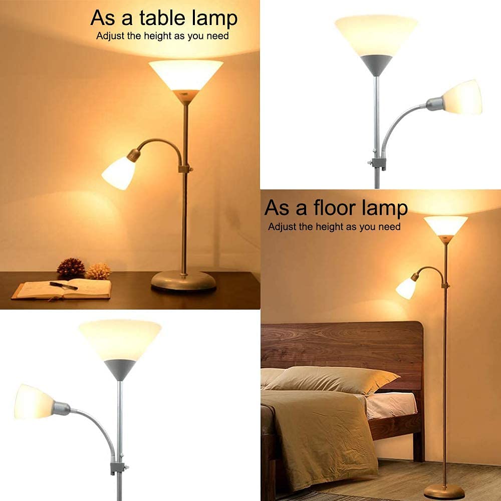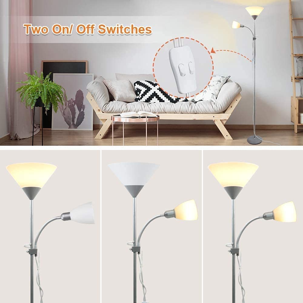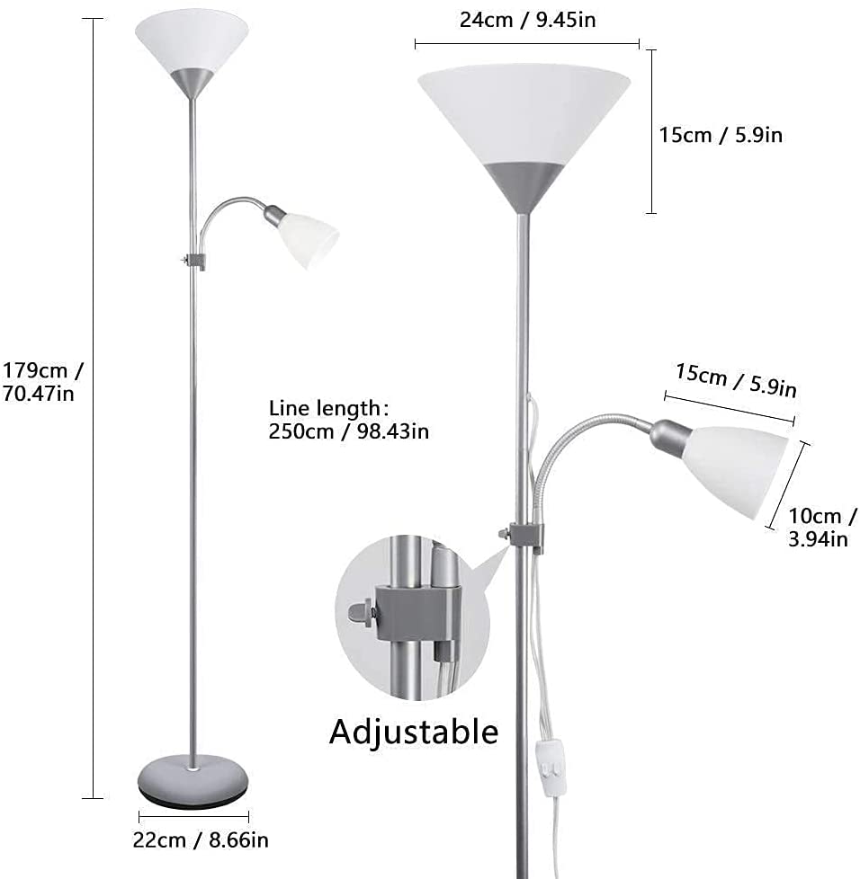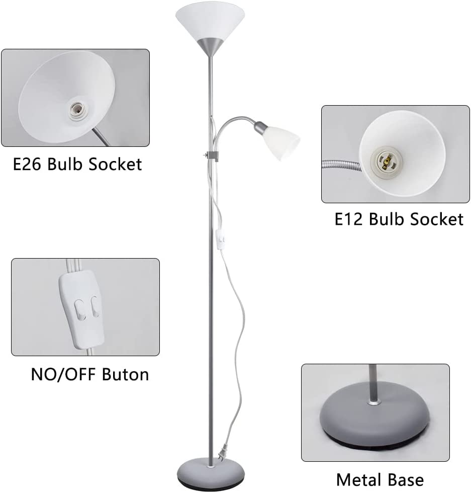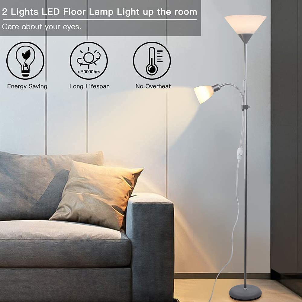- One Lamp Two Use: Tässä seisomavalaisimessa on kaksi lampun päätä, ylävalo voi toimia lattiavalaisimena valaisemaan huonettasi ja sivuvalaisin pöytävalaisimena lukemiseen tai opiskeluun. Korkeaa lukupylväslamppuamme käytetään itsenäisen johtoohjauksen kytkimen kanssa, ja se voi ohjata sivuvaloa ja päävaloa erikseen.