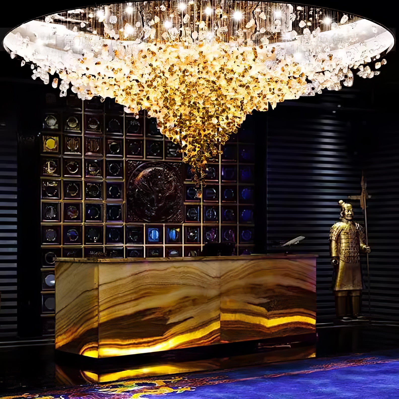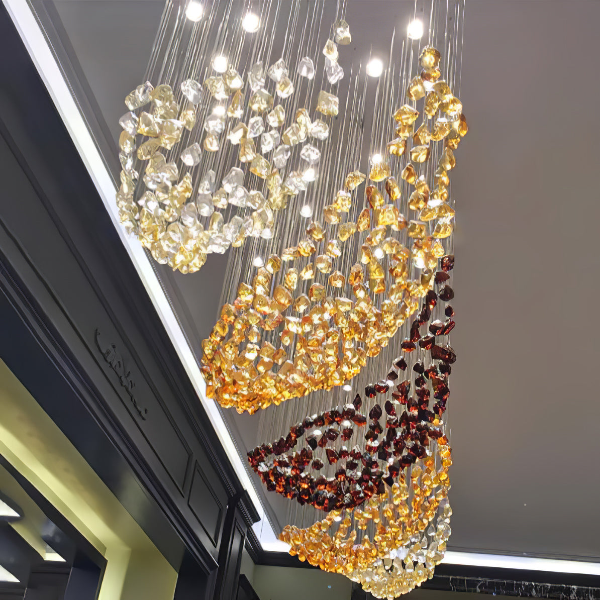 Tämä kristallikruunu, jossa on korkealaatuisia ja tarkasti valmistettuja monivärisiä kiviä, on täydellinen tapa lisätä eleganssia ja hienostuneisuutta mihin tahansa tilaan. Monimutkainen muotoilu kimaltelee valaistuna ja valaisee minkä tahansa huoneen hohtavan kauneudellaan. Tämä monilla prosesseilla käsintehty kattokruunu on hienon suunnittelun ruumiillistuma.