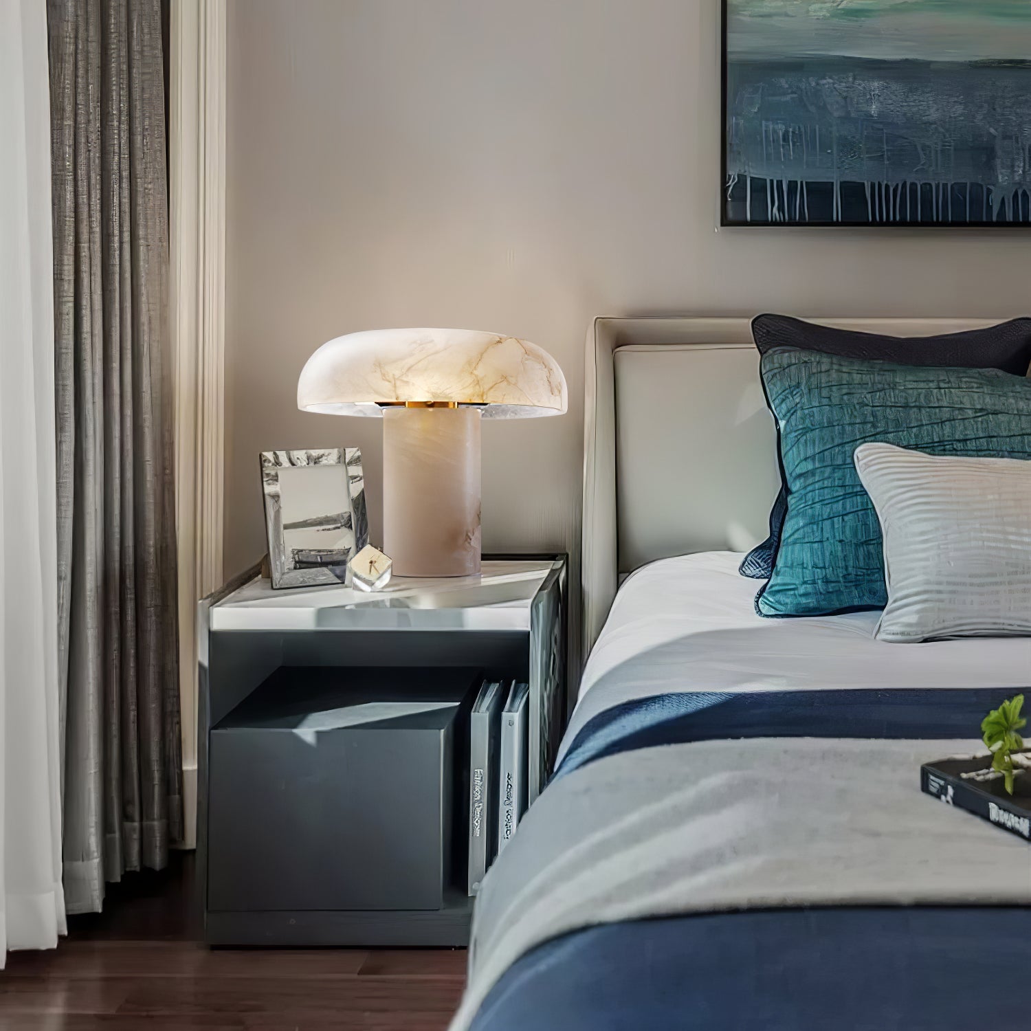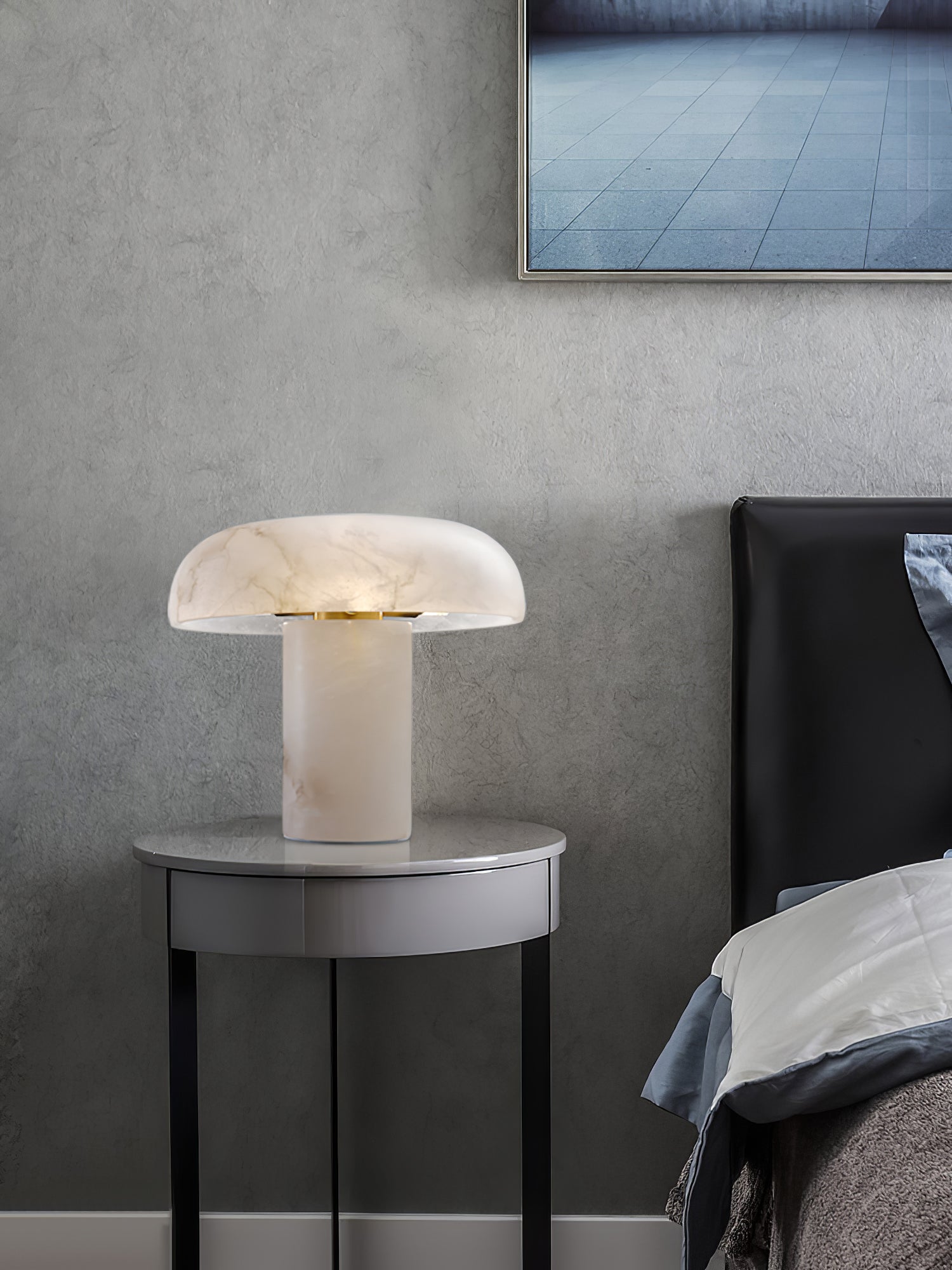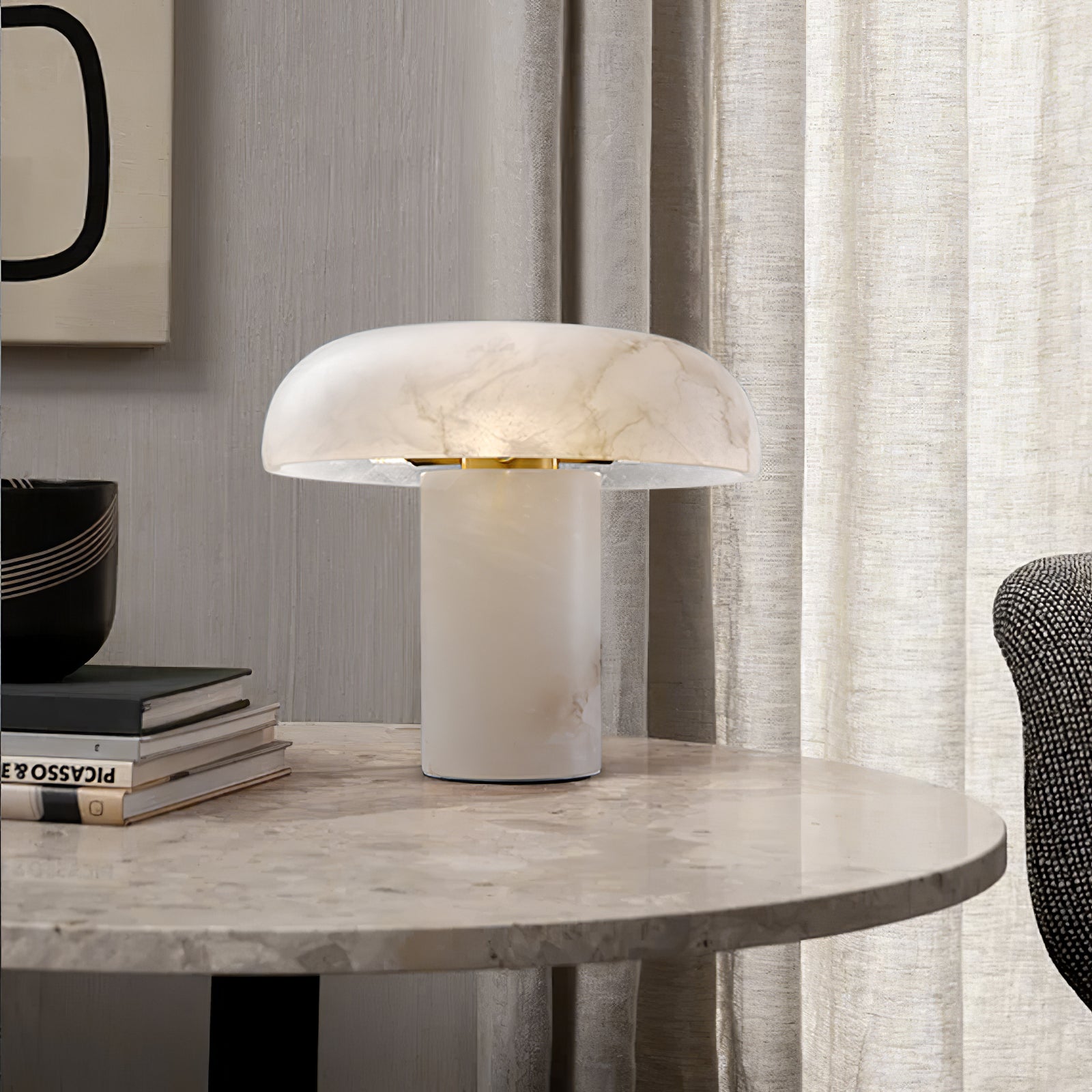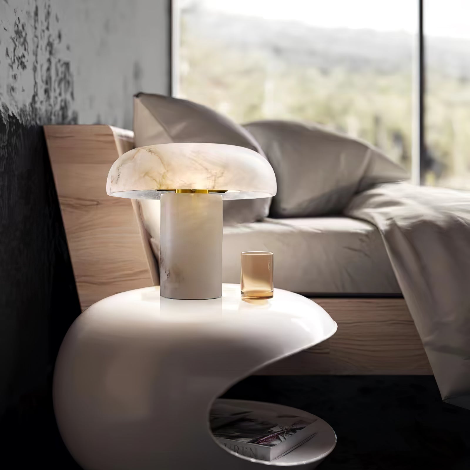 Tämä ylellinen Mushroom-pöytävalaisin, jossa on valkoinen alabasterijalusta, on täydellinen kodin tai toimiston lisävaruste, joka voi muuttaa tylsät ja elottomat tilat tyylikkääksi, korkealaatuiseksi sisustukseksi. Luo moderni makuuhuone tai olohuone tällä tyylikkäällä pöytävalaisimella, joka sopii kaikkiin sisätiloihin – kuten olohuoneisiin, eteisiin, kotitoimistoihin ja makuuhuoneisiin.