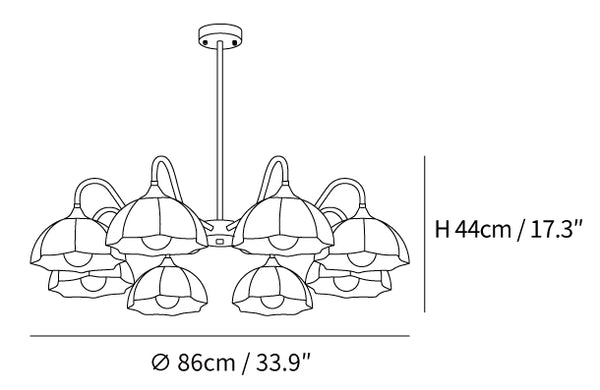 8 pään koko: Halkaisija 86 cm x K 44cm / Φ 33,9″ x K 17,3″