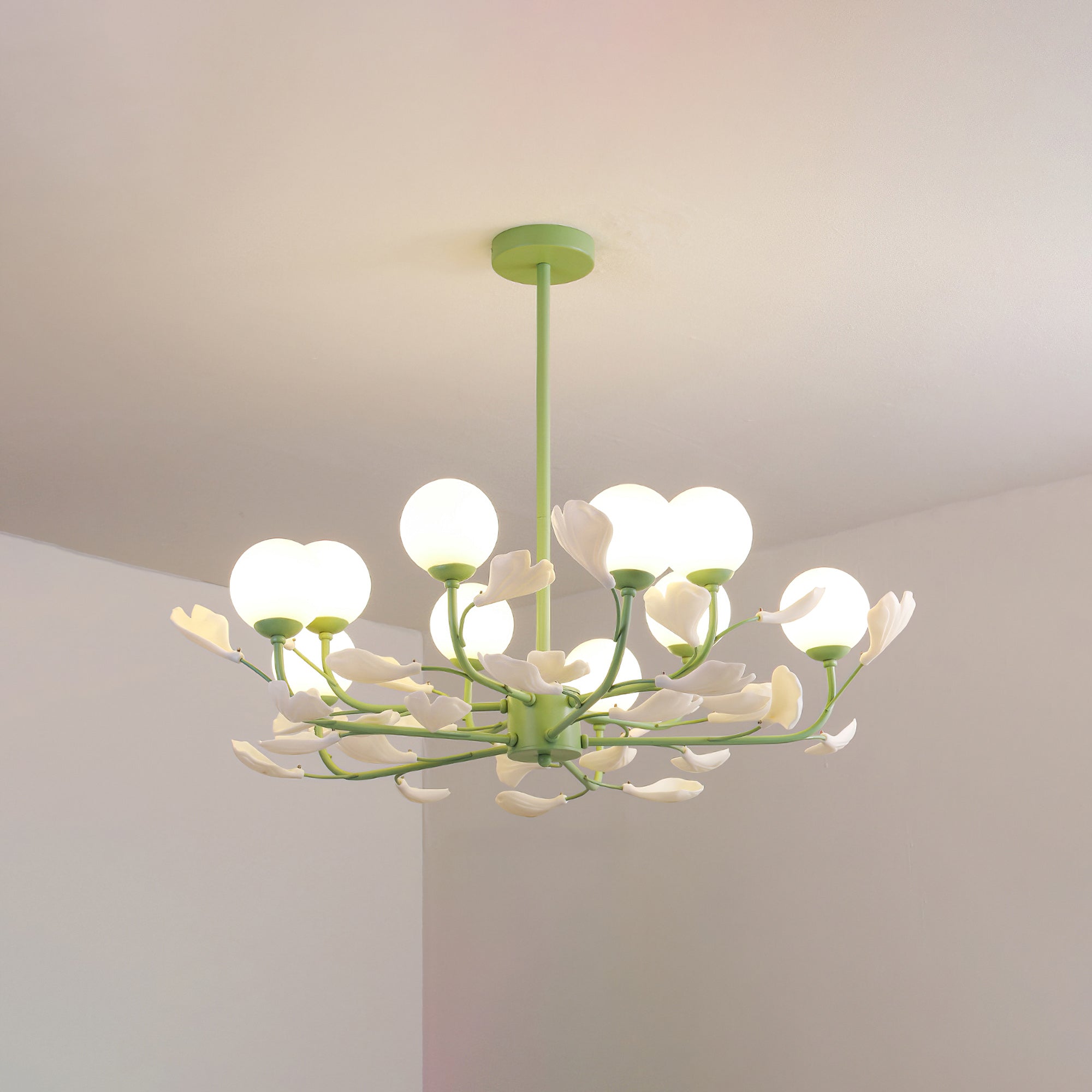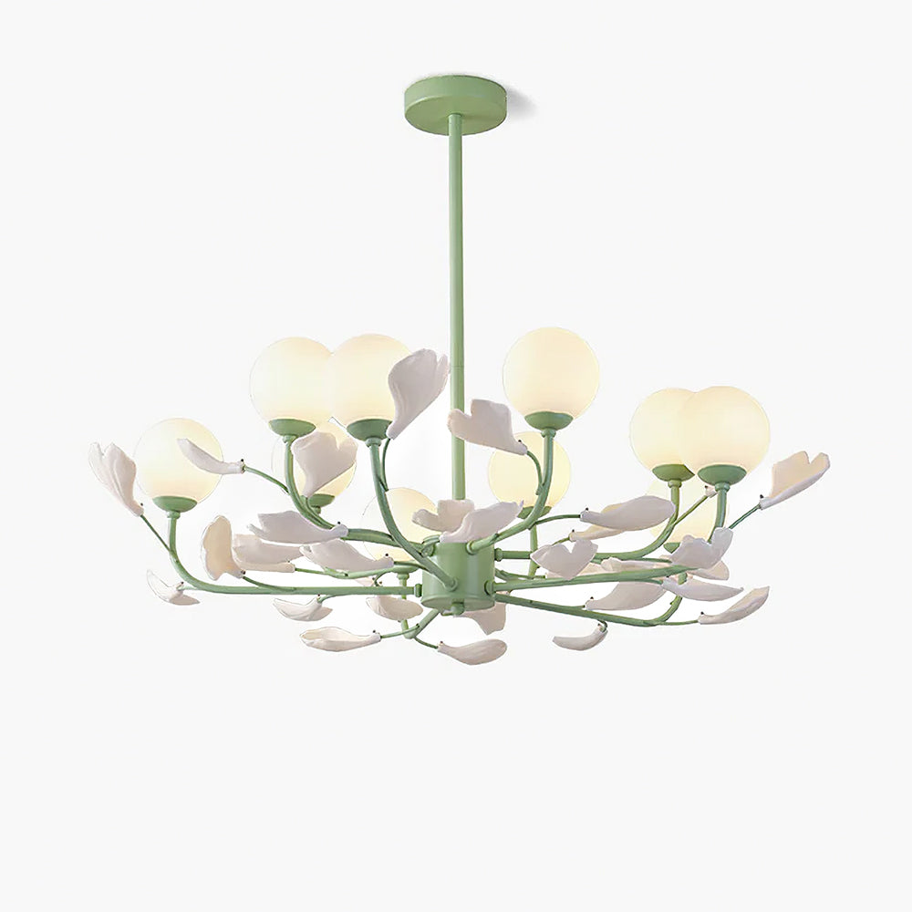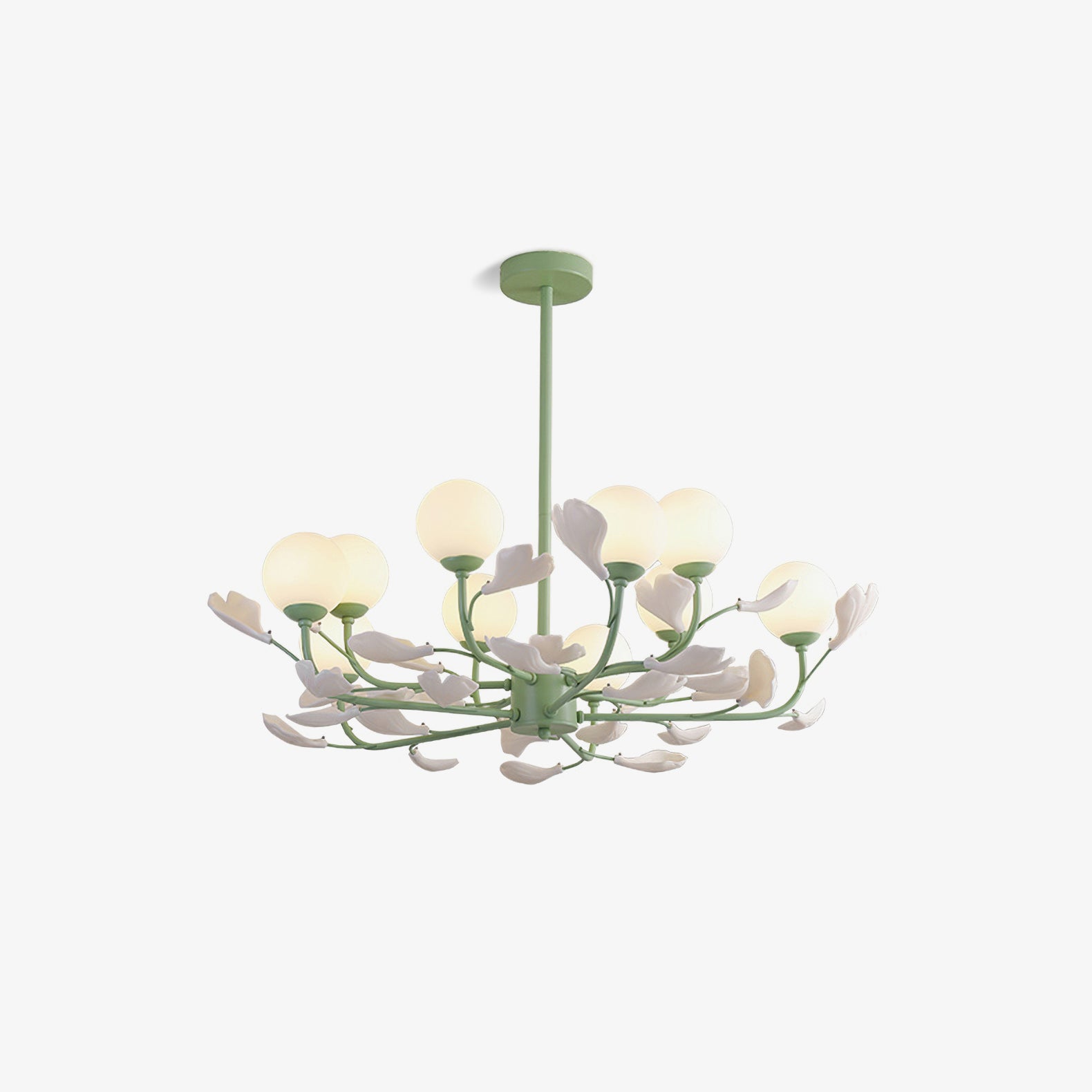 Opal Glass -kattokruunu on suunniteltu vaikuttamaan ainutlaatuisella värimaailmallaan. Vihreä sävyinen runko lisää rikkautta ja ylellisyyttä luoden visuaalisesti silmiinpistävän keskipisteen huoneeseesi. Valkoiset lampunvarjostimet täydentävät kauniisti vihreää sävyä tarjoten pehmeän ja hajavalon, joka luo lämpimän ja kutsuvan tunnelman.
