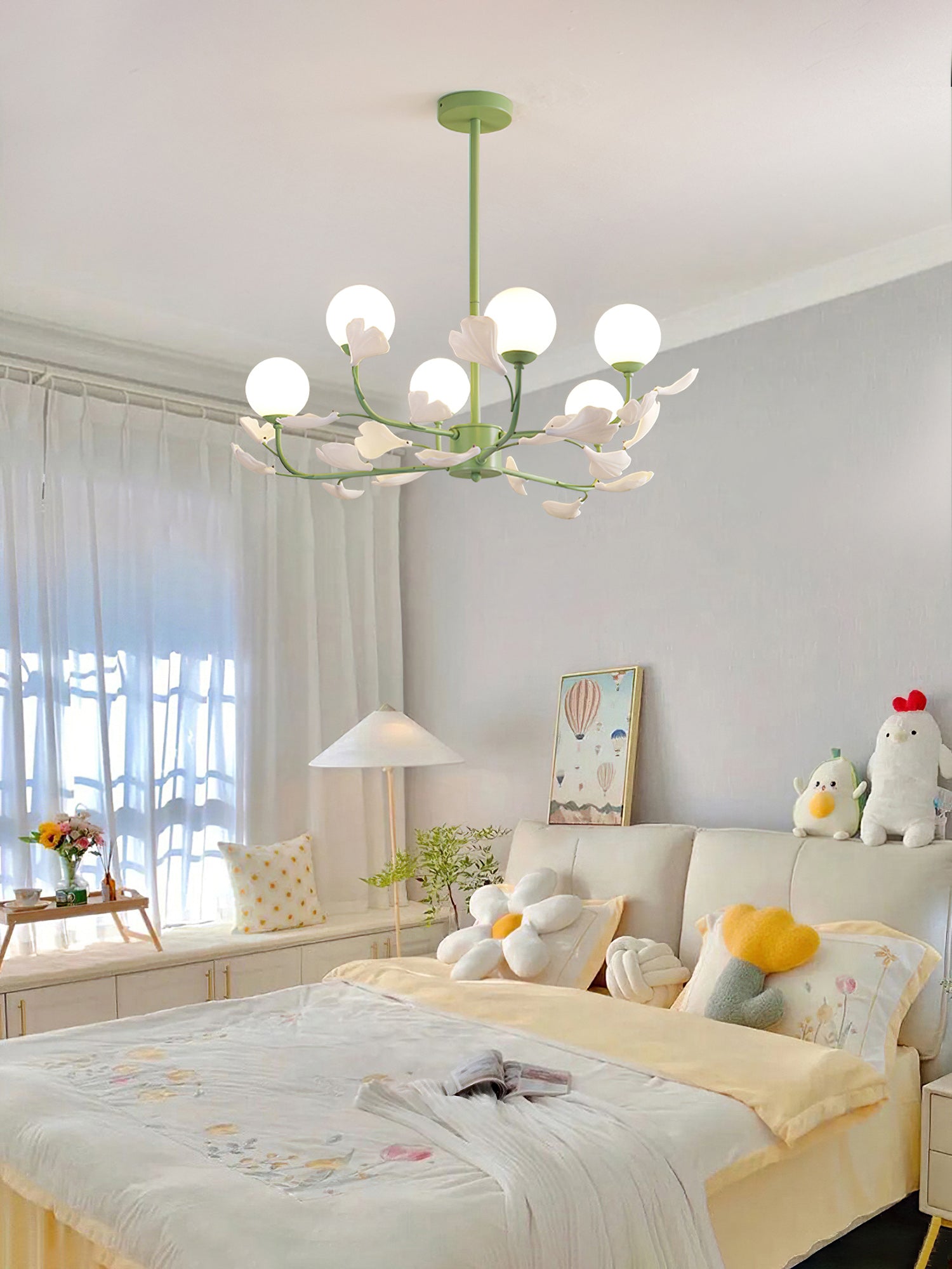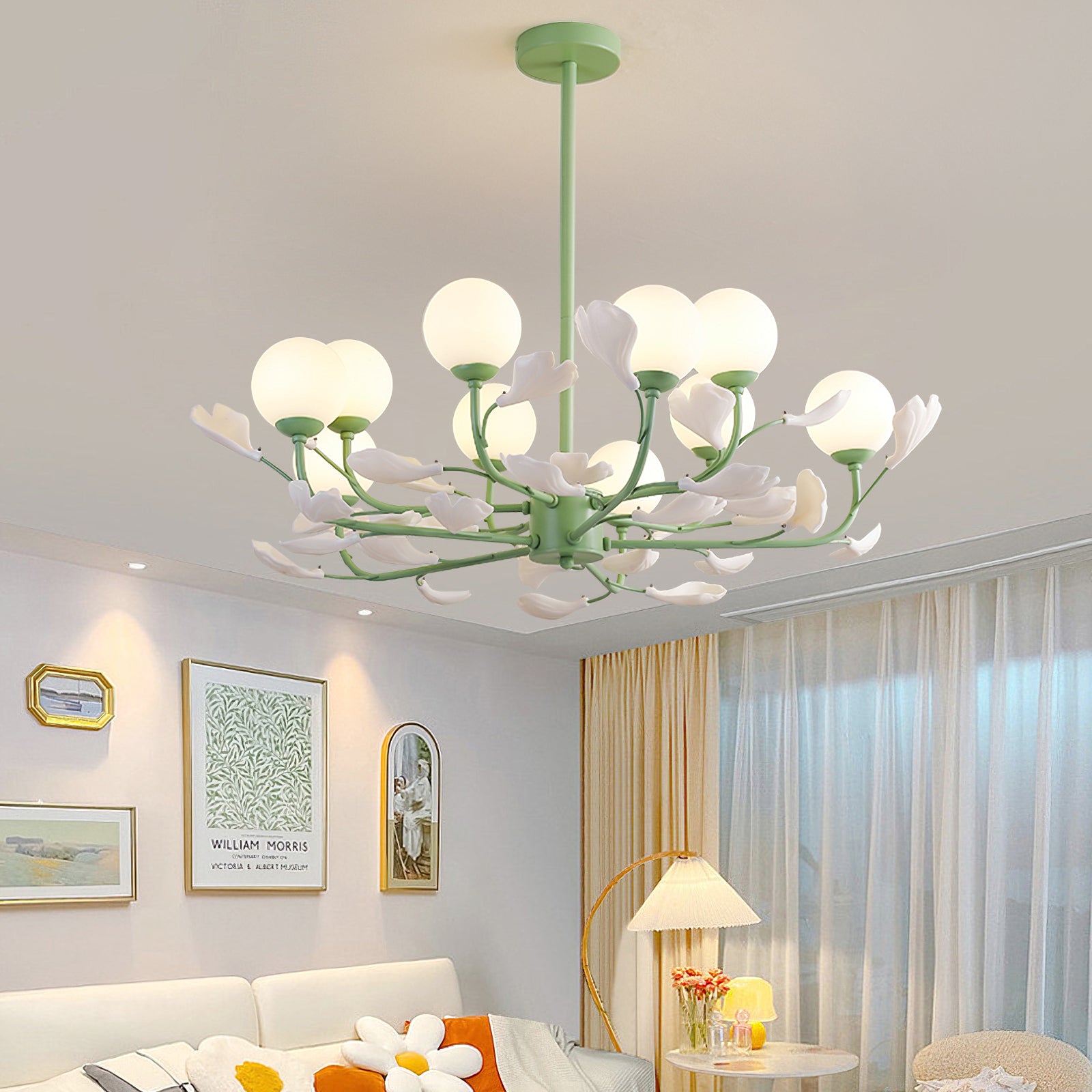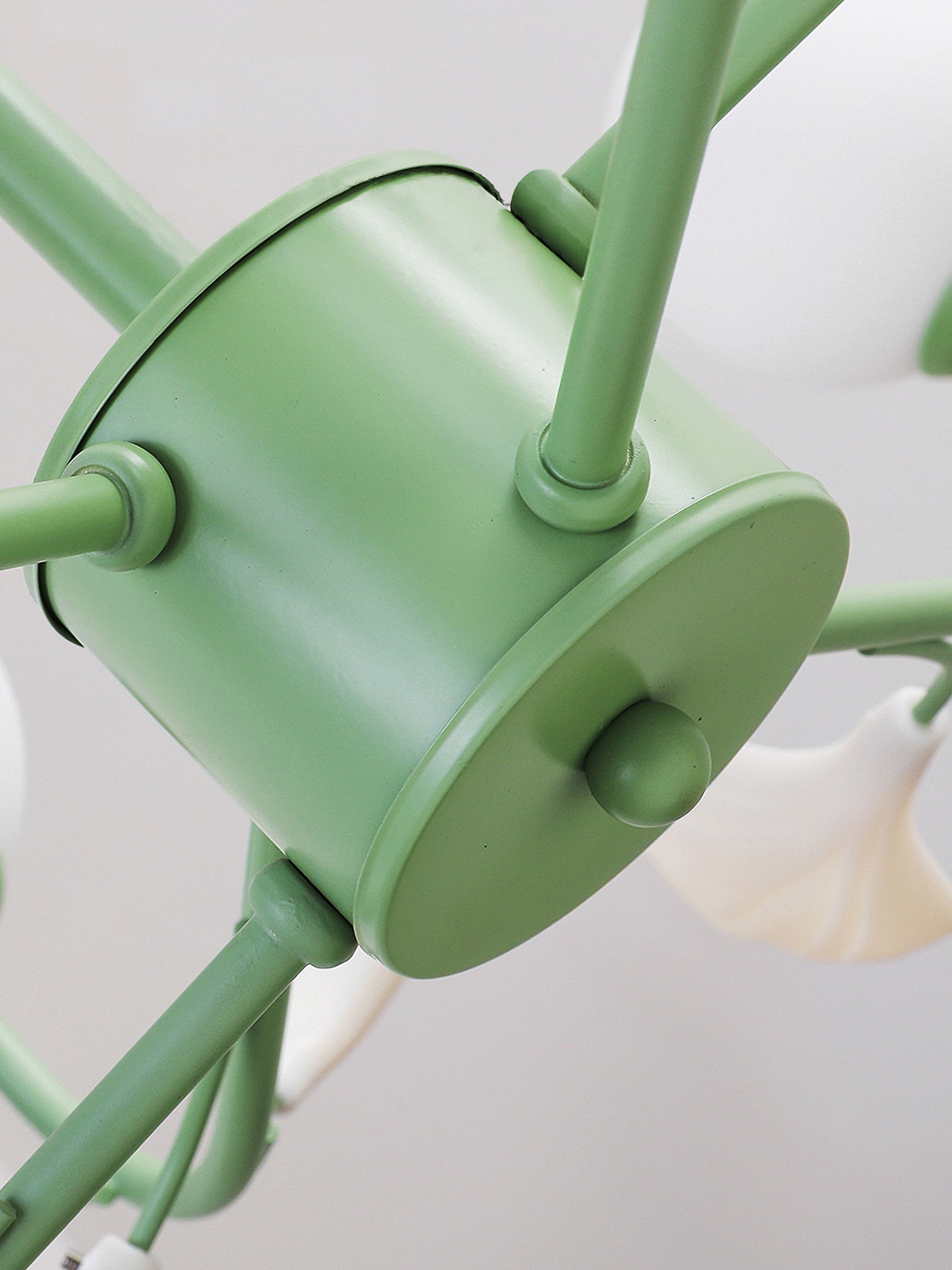 Opal Glass -kattokruunu on suunniteltu vaikuttamaan ainutlaatuisella värimaailmallaan. Vihreä sävyinen runko lisää rikkautta ja ylellisyyttä luoden visuaalisesti silmiinpistävän keskipisteen huoneeseesi. Valkoiset lampunvarjostimet täydentävät kauniisti vihreää sävyä tarjoten pehmeän ja hajavalon, joka luo lämpimän ja kutsuvan tunnelman.