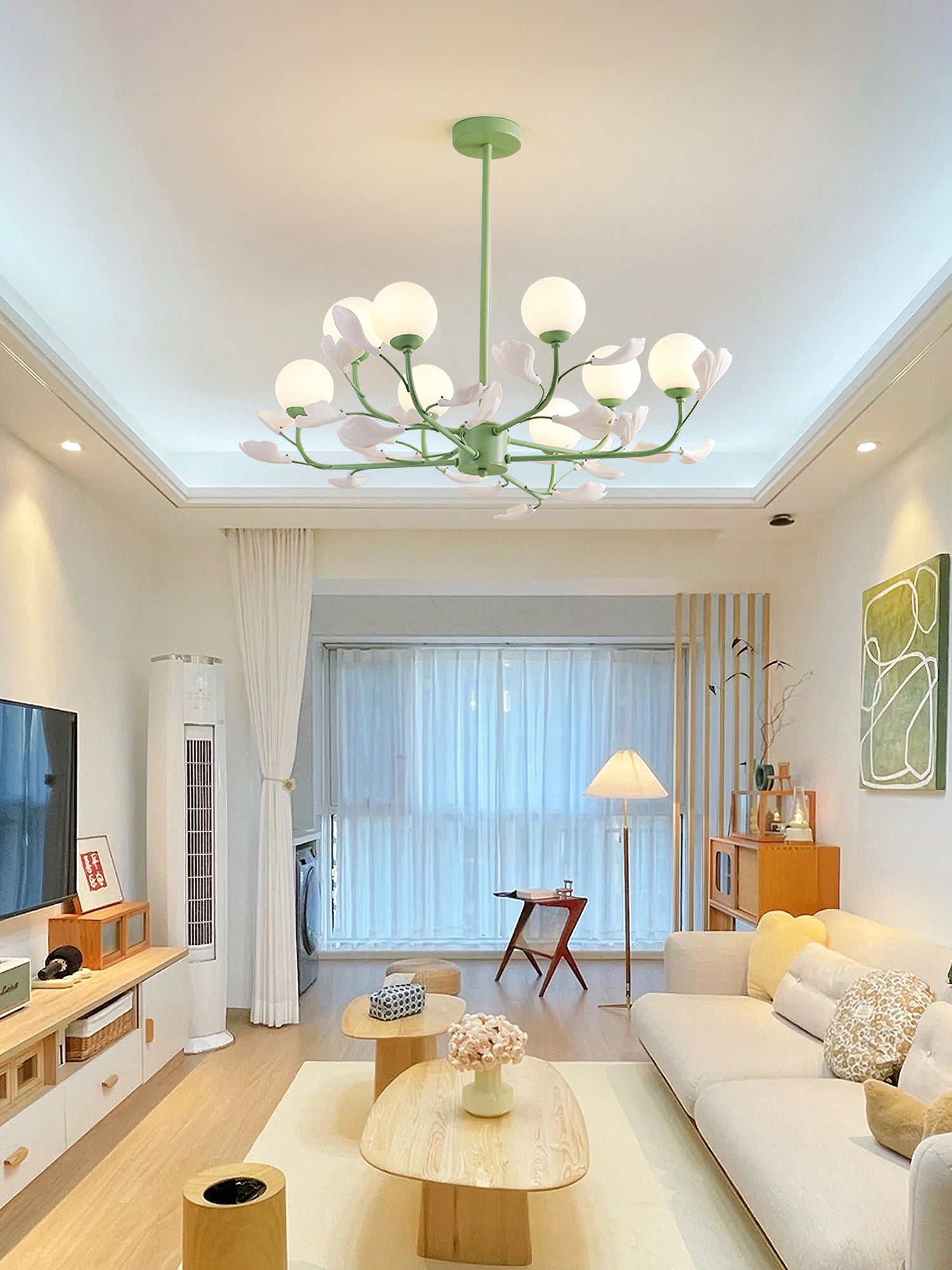 Vanilla Ball -kattokruunussa on kaunis järjestely kermanvärisiä vaniljapalloja, jotka on ripustettu tyylikkääseen metallirunkoon. Laadukas kuvioiden ja kuvioiden yhdistelmä luo visuaalisesti houkuttelevan estetiikan, joka herättää viehätyksen ja armon tunteen. Herkät vaniljapallot huokuvat lämmintä ja kutsuvaa hehkua luoden pehmeää, ympäröivää valoa, joka muuttaa minkä tahansa huoneen tunnelman.