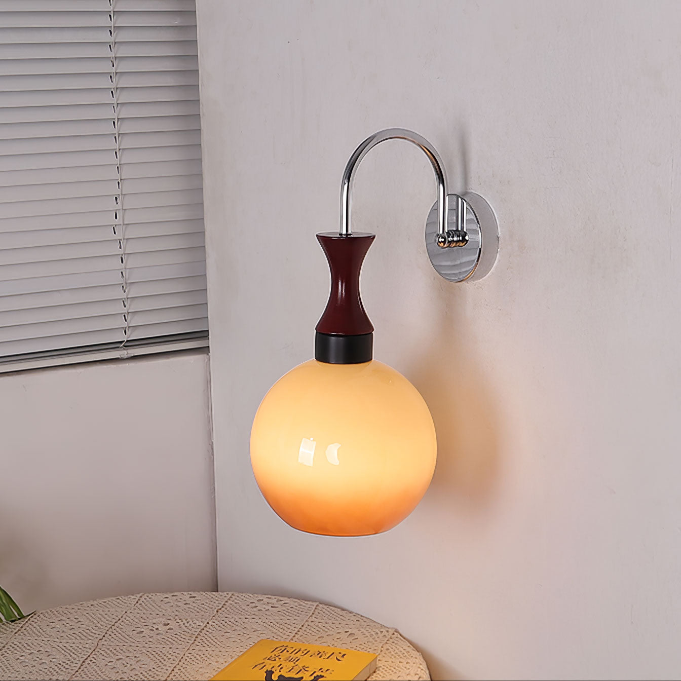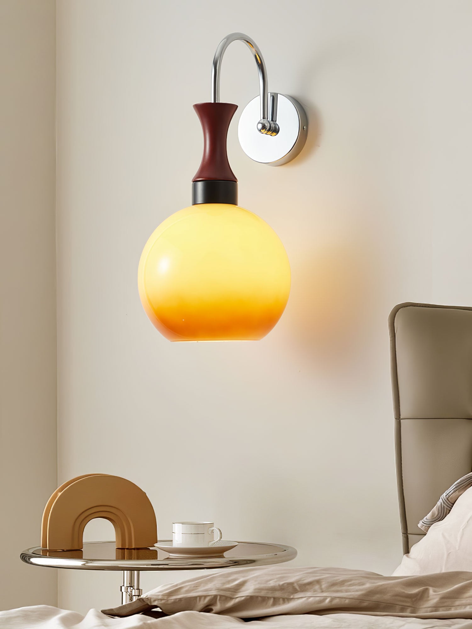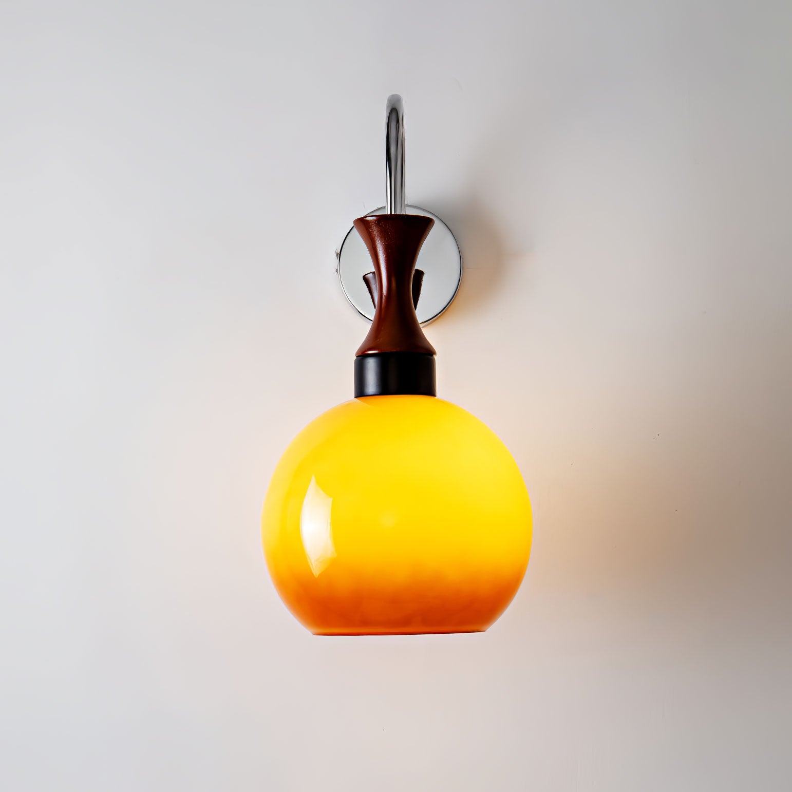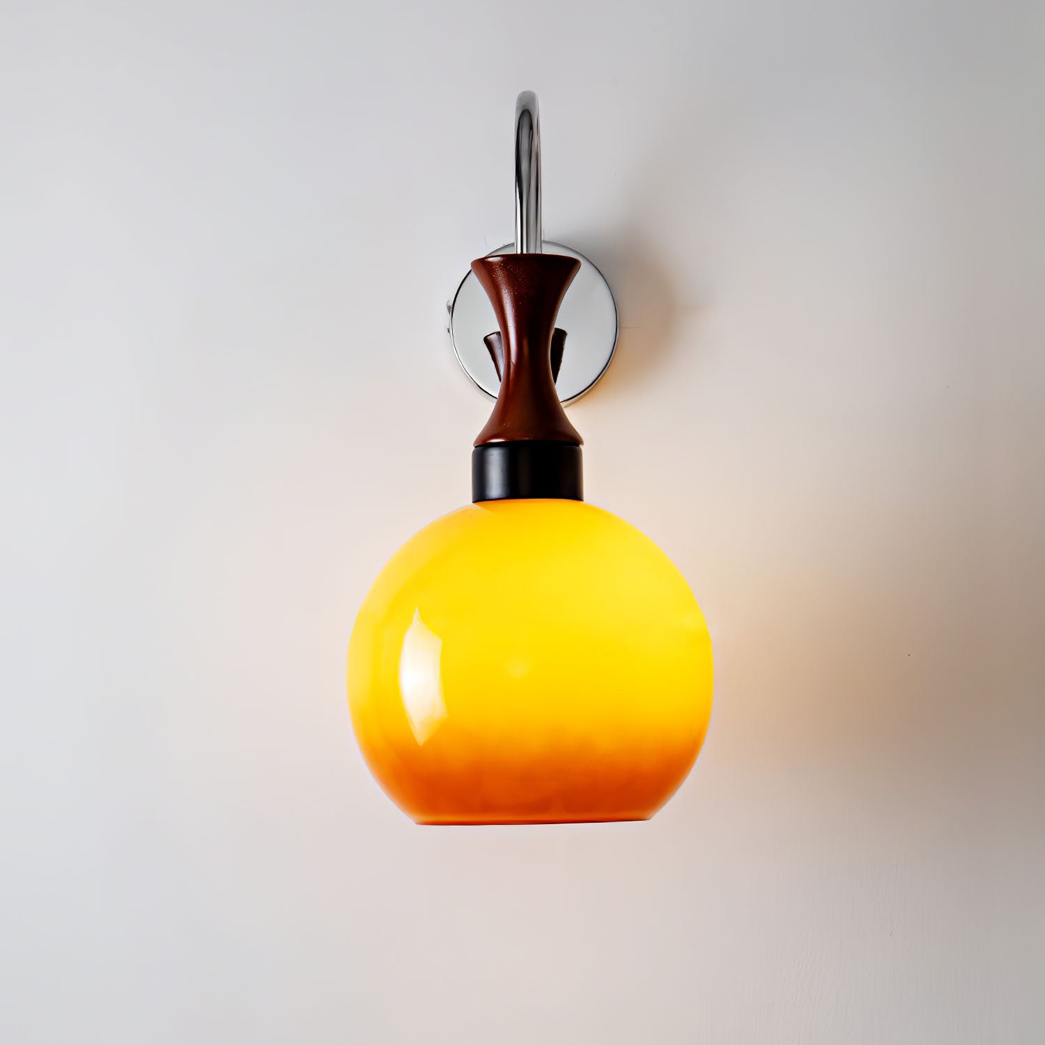 Varjostin on tyylikkään, tummansävyisen metallisen varren päällä, joka irtoaa tyylikkäästi seinätelineestä ja muistuttaa modernistista veistosta. Käsivarren puhtaat linjat ja metallinen viimeistely luovat silmiinpistävän kontrastin lasin pehmeyttä vastaan.