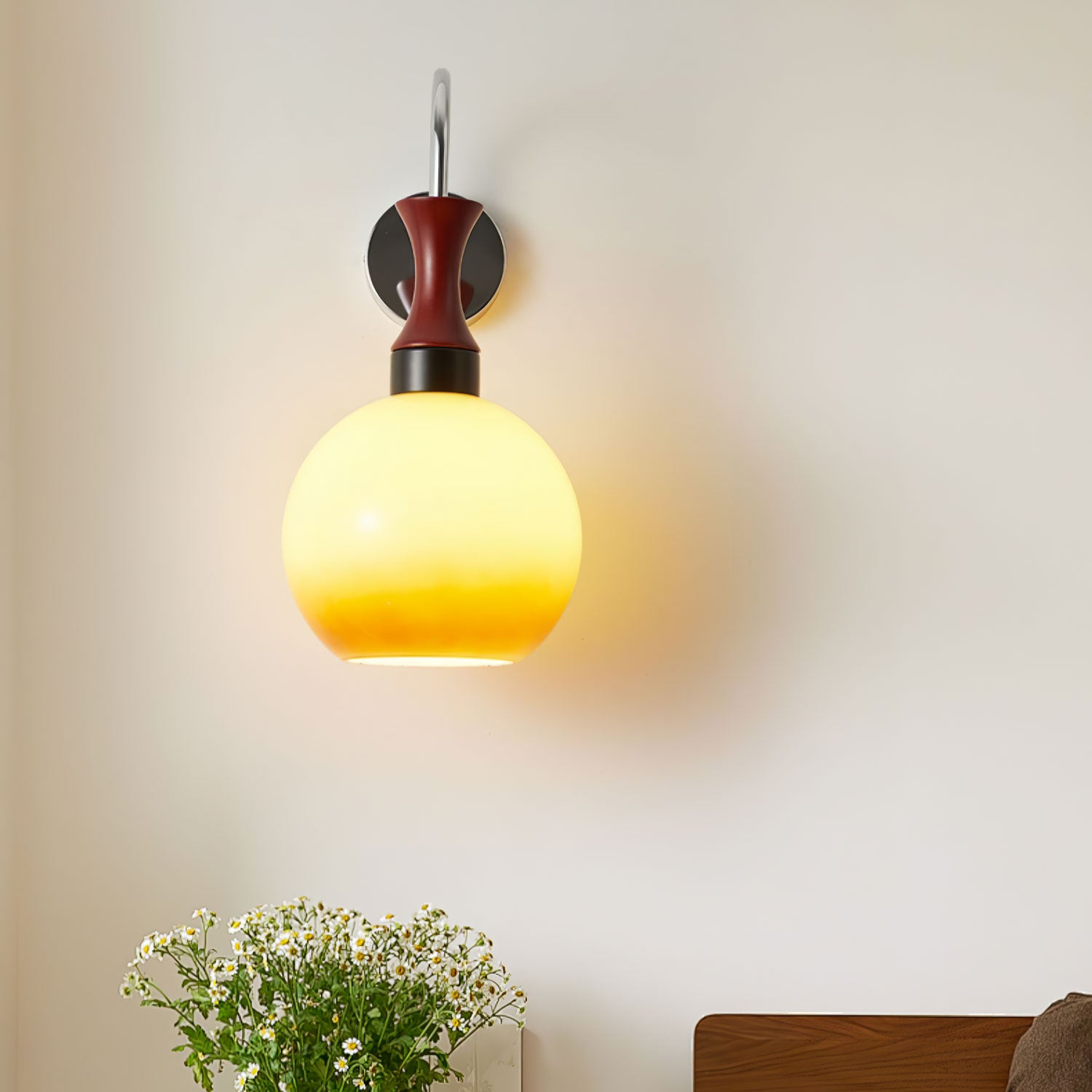 Valokeessa on pallomainen lasivarjostin, joka säteilee lämpimällä, kultaisella sävyllä ja tarjoaa pehmeän valon diffuusion, joka ympäröi huoneen kodikkaassa ilmapiirissä.