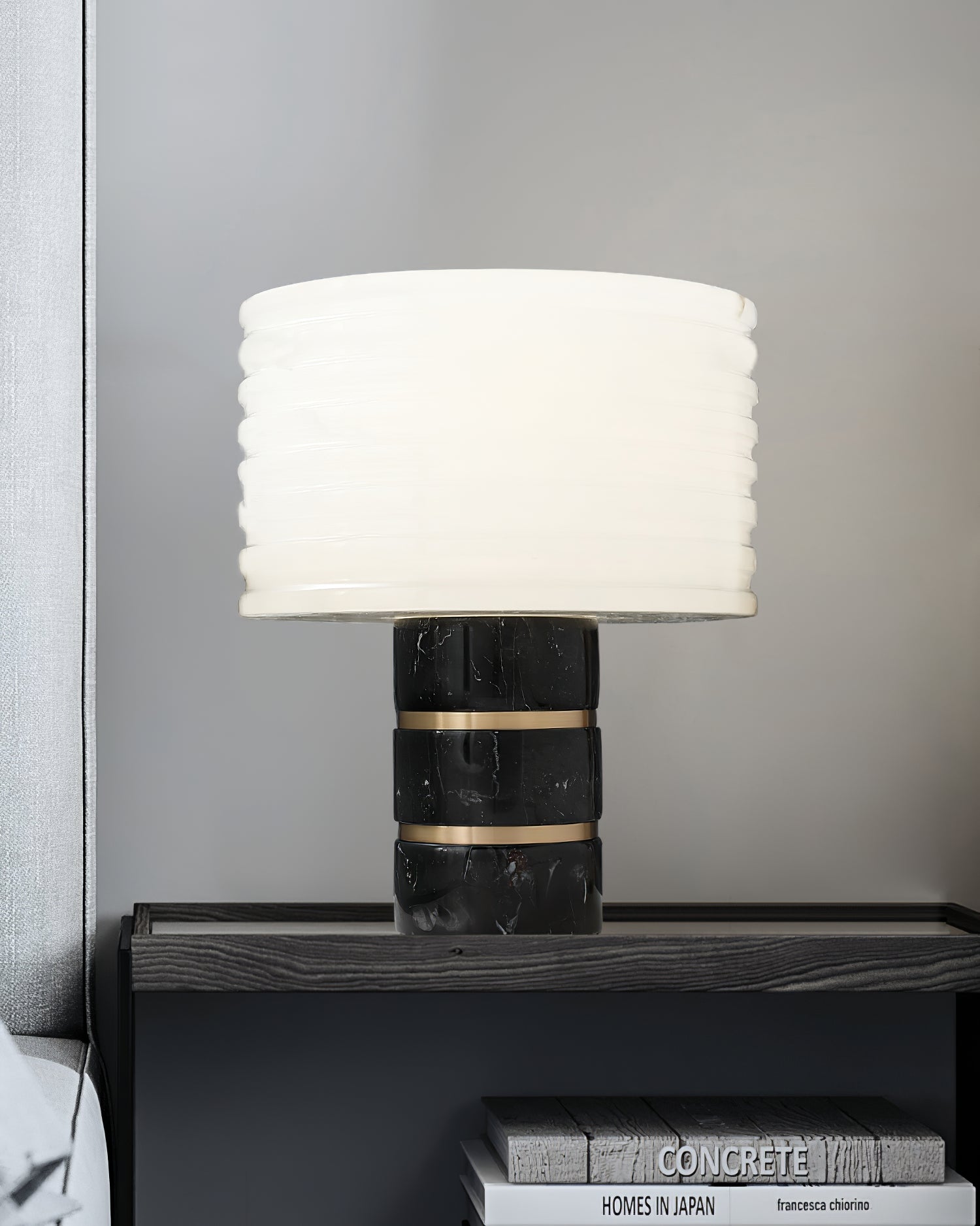 Myymäläsuunnittelijamme hienostunut ja flirttaileva pöytävalaisin messinkiä ja marmoria käsin leikatulla alabasterivarjostimella.