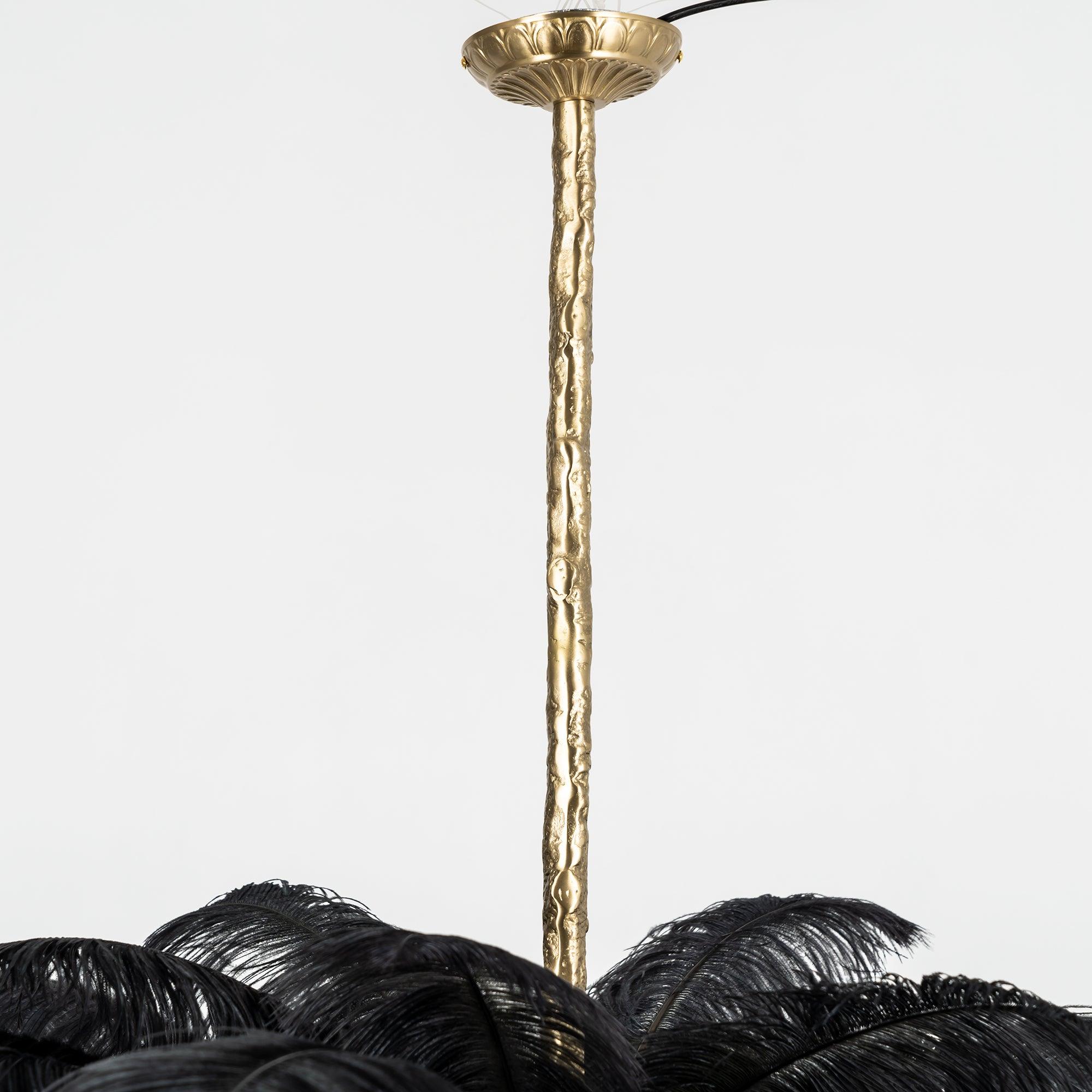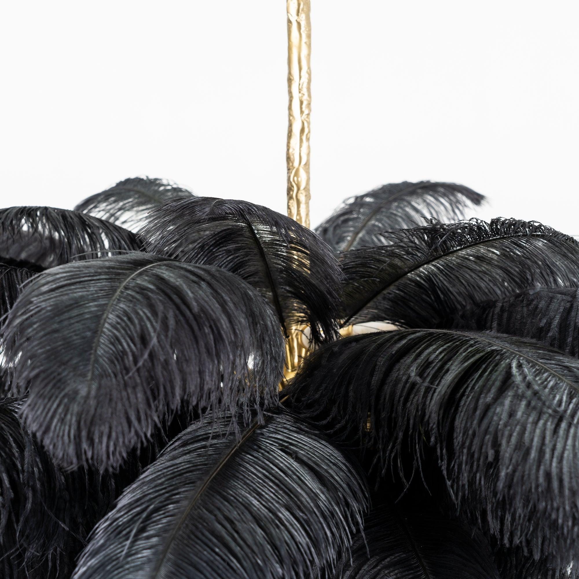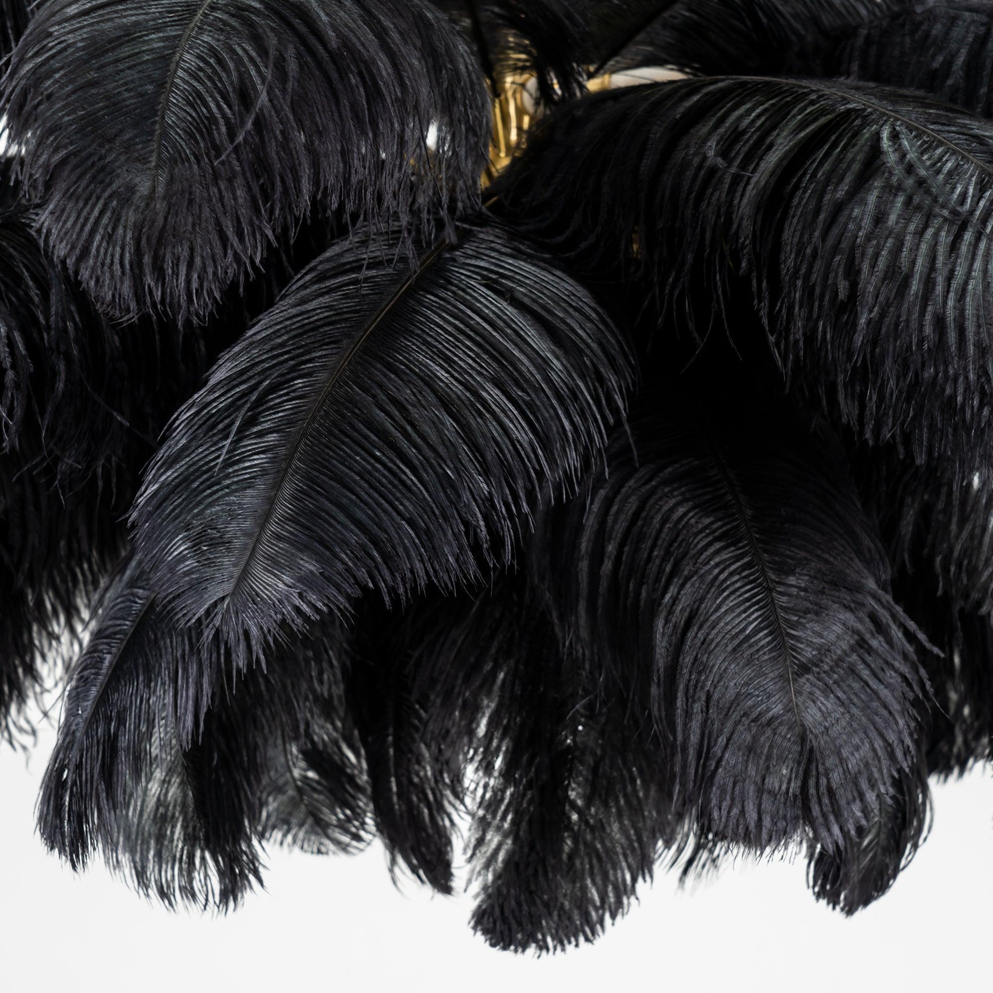 Osana eksklusiivista höyhenlamppusarjaamme höyhenkattokruunumme on viimeistelty strutsin höyhenillä ja messingisellä metallijalalla.