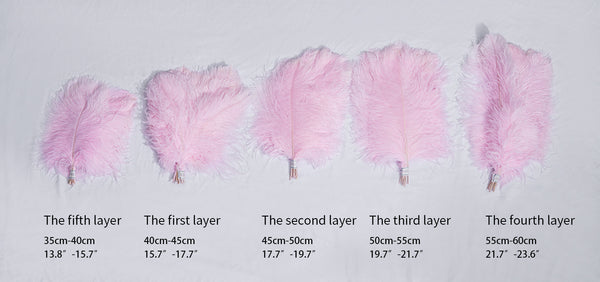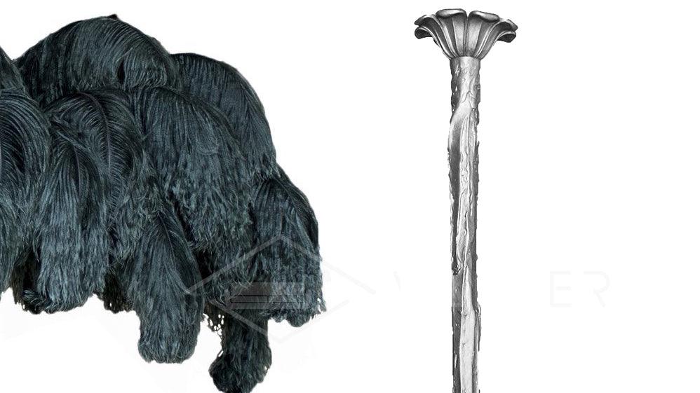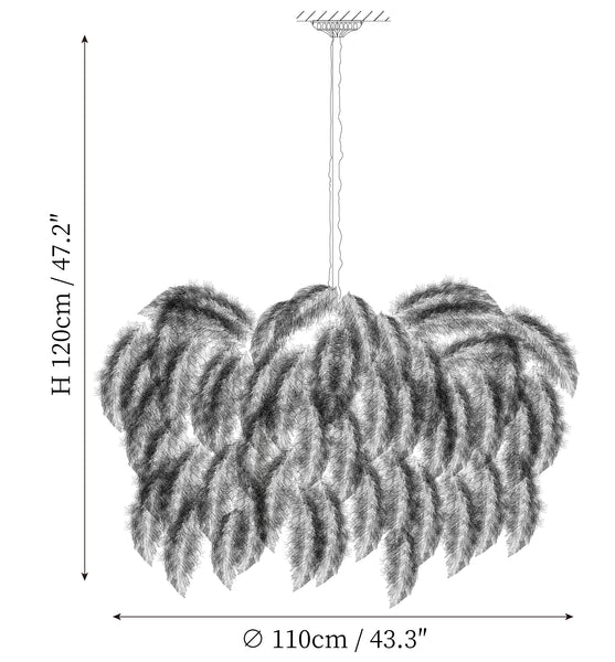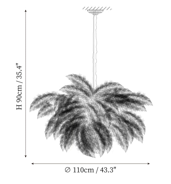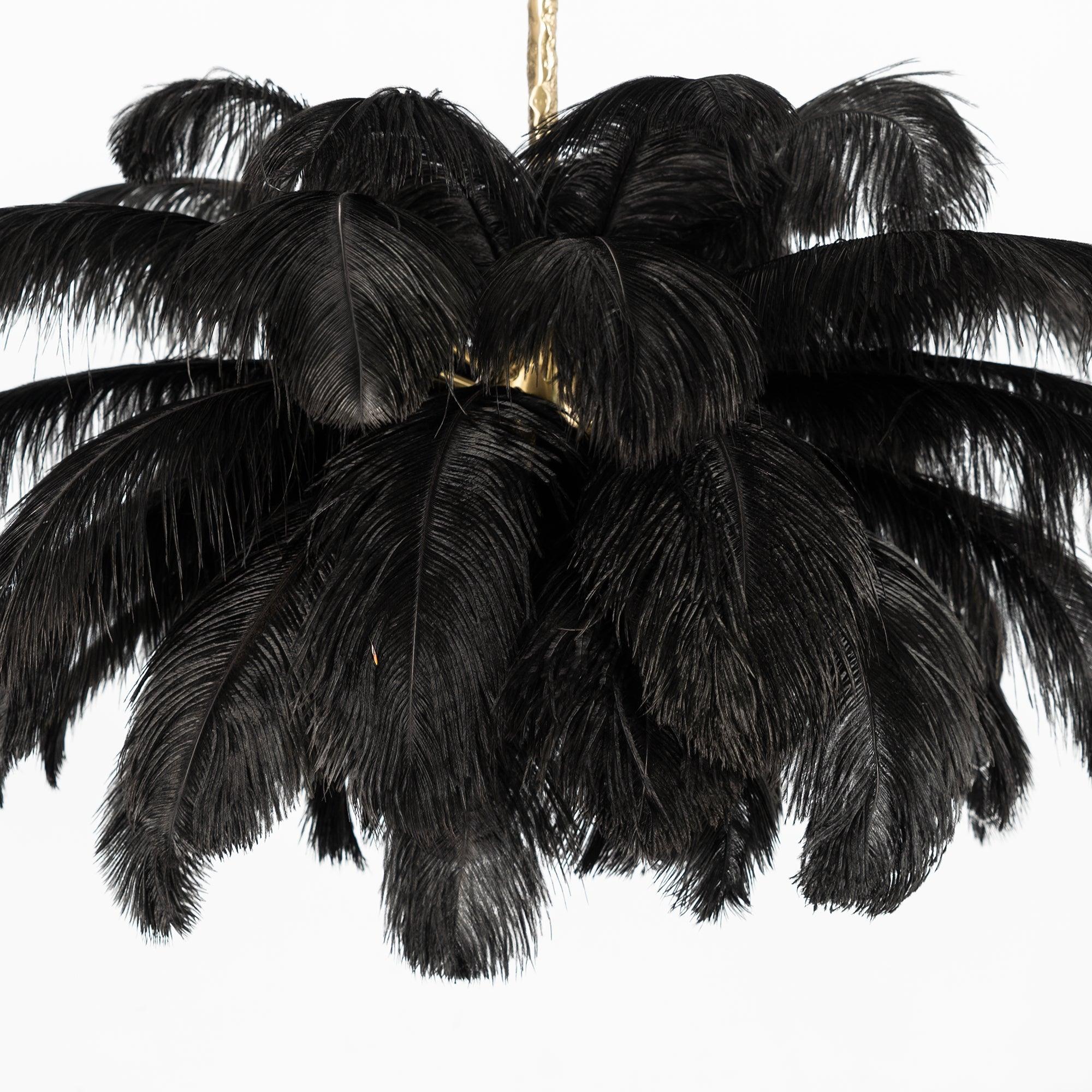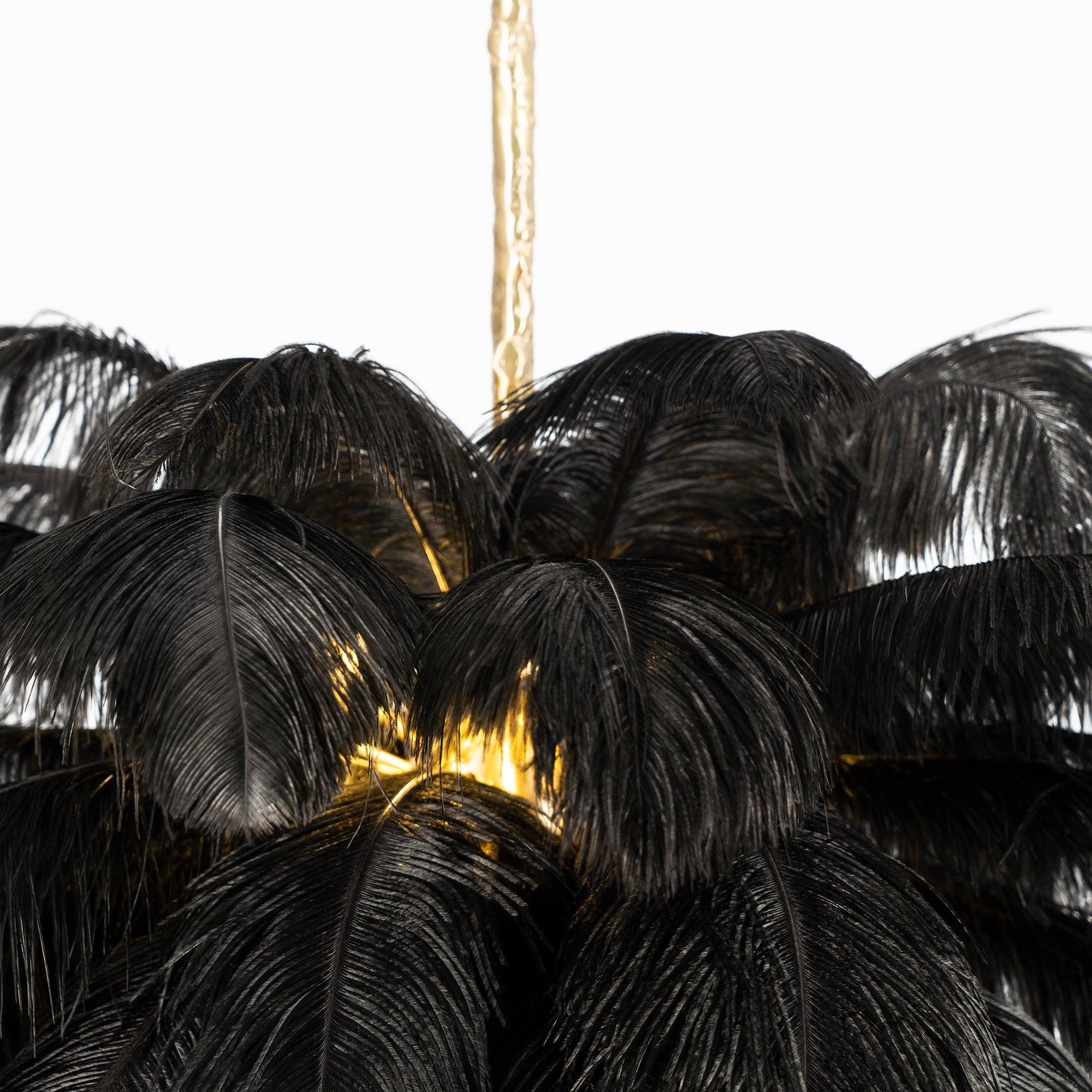 Osana eksklusiivista höyhenlamppusarjaamme höyhenkattokruunumme on viimeistelty strutsin höyhenillä ja messingisellä metallijalalla.