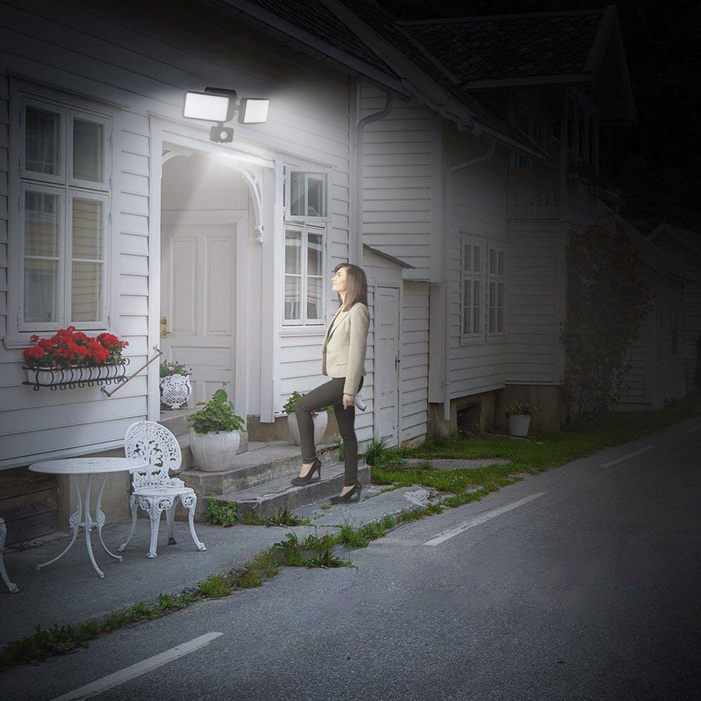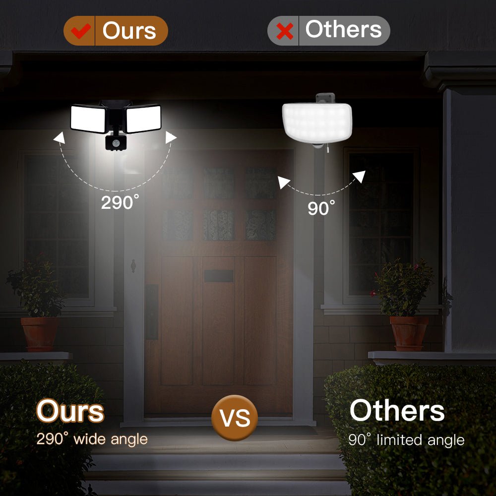 - Joustava ja säädettävä rakenne: Valopäät voidaan säätää 160° ja 120°, anturia voi kiertää 180° vasemmalle ja oikealle, ylös ja alas. voit säätää kulman valaistuksen haluamaasi paikkaan ja se voi luoda täydellisen valaistuskulman ja liiketunnistimen tarpeisiisi.