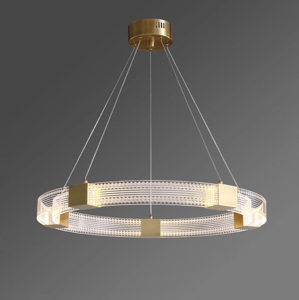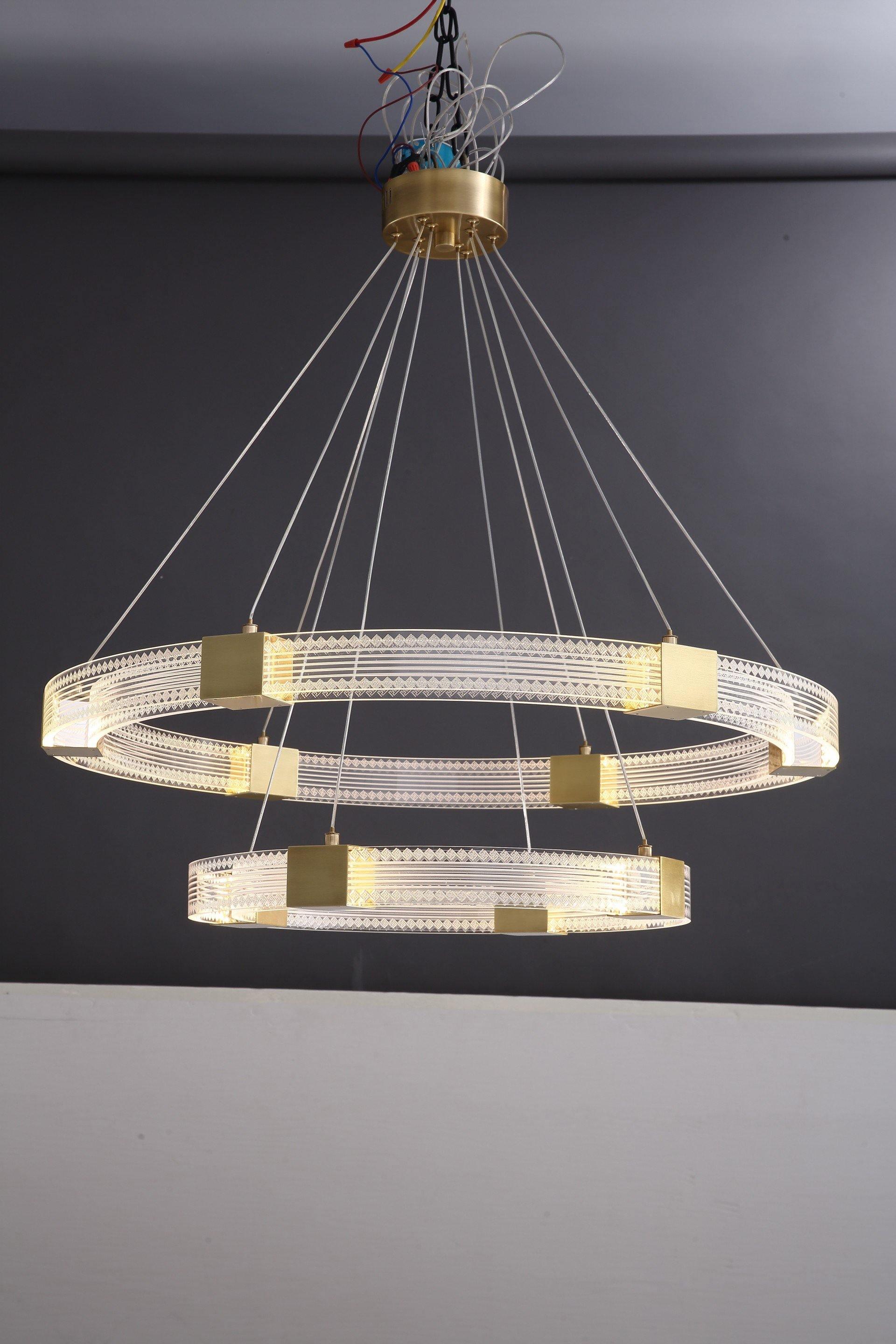 Artisanaalinen ylellisyys yhdistyy nykyaikaiseen muotoiluun Parallel Ring LED -kattokruunussa. Sen rengasmainen siluetti koostuu rinnakkaisista käsintehdyistä, teksturoiduista akryylipaneeleista, jotka on yhdistetty valmiilla messinkiinserteillä. Nämä messinkiset sisäosat sisältävät integroidut LED-valot, jotka asettuvat tasaisesti huurteisten akryylihajottajien taakse ja osoittavat sekä alas- että sivusuunnassa häikäisevän näytön syttymisen jälkeen.