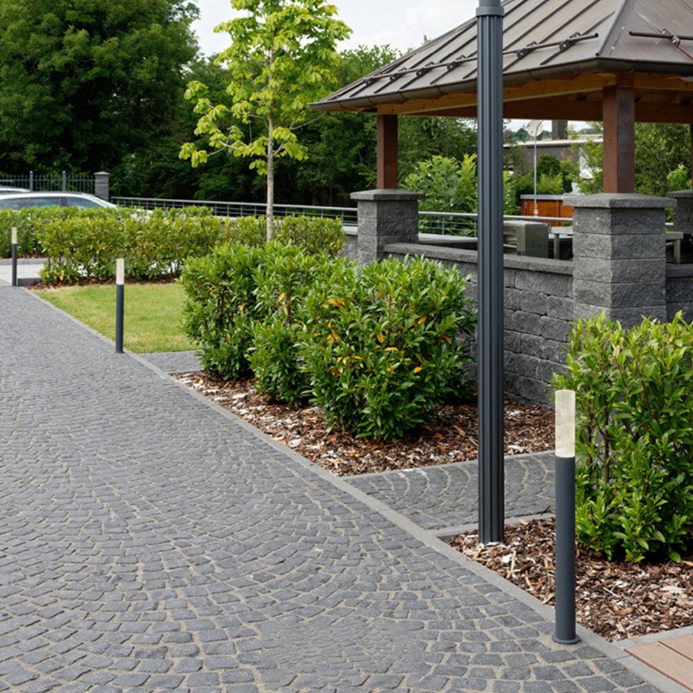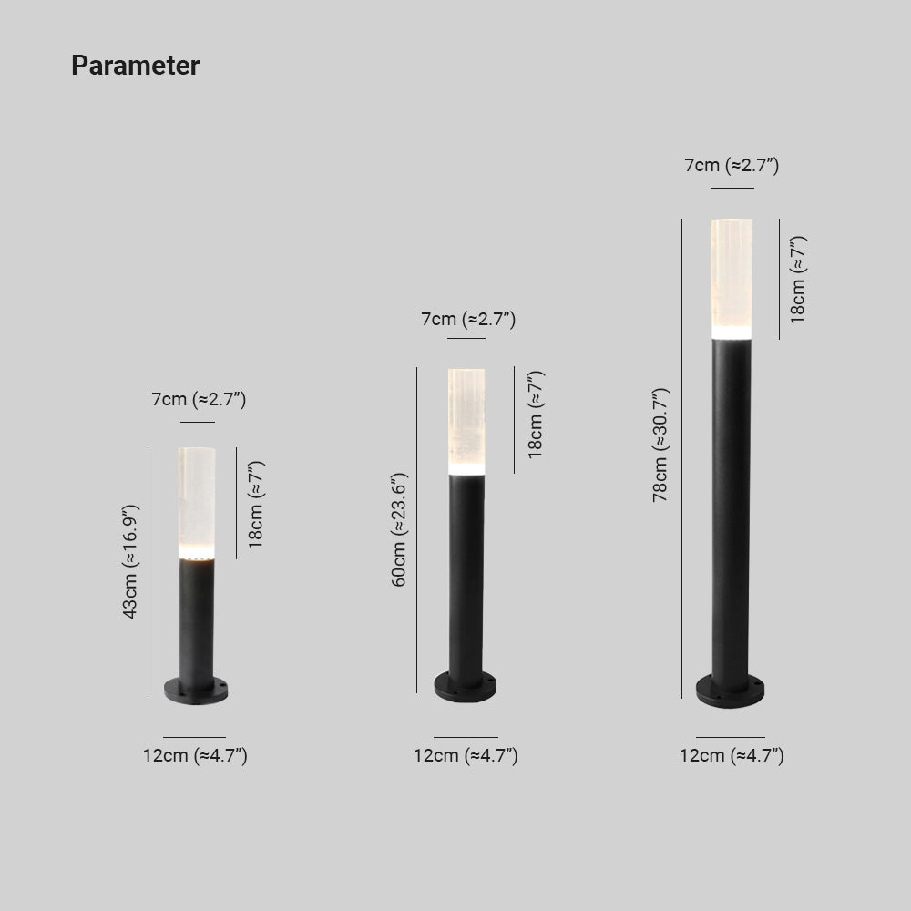 - Valaisinpylväs on muodoltaan lieriömäinen, yhdistettynä sylinterimäiseen läpinäkyvään lampunvarjostimeen, mikä luo pehmeän ja tasaisen valaistuksen.