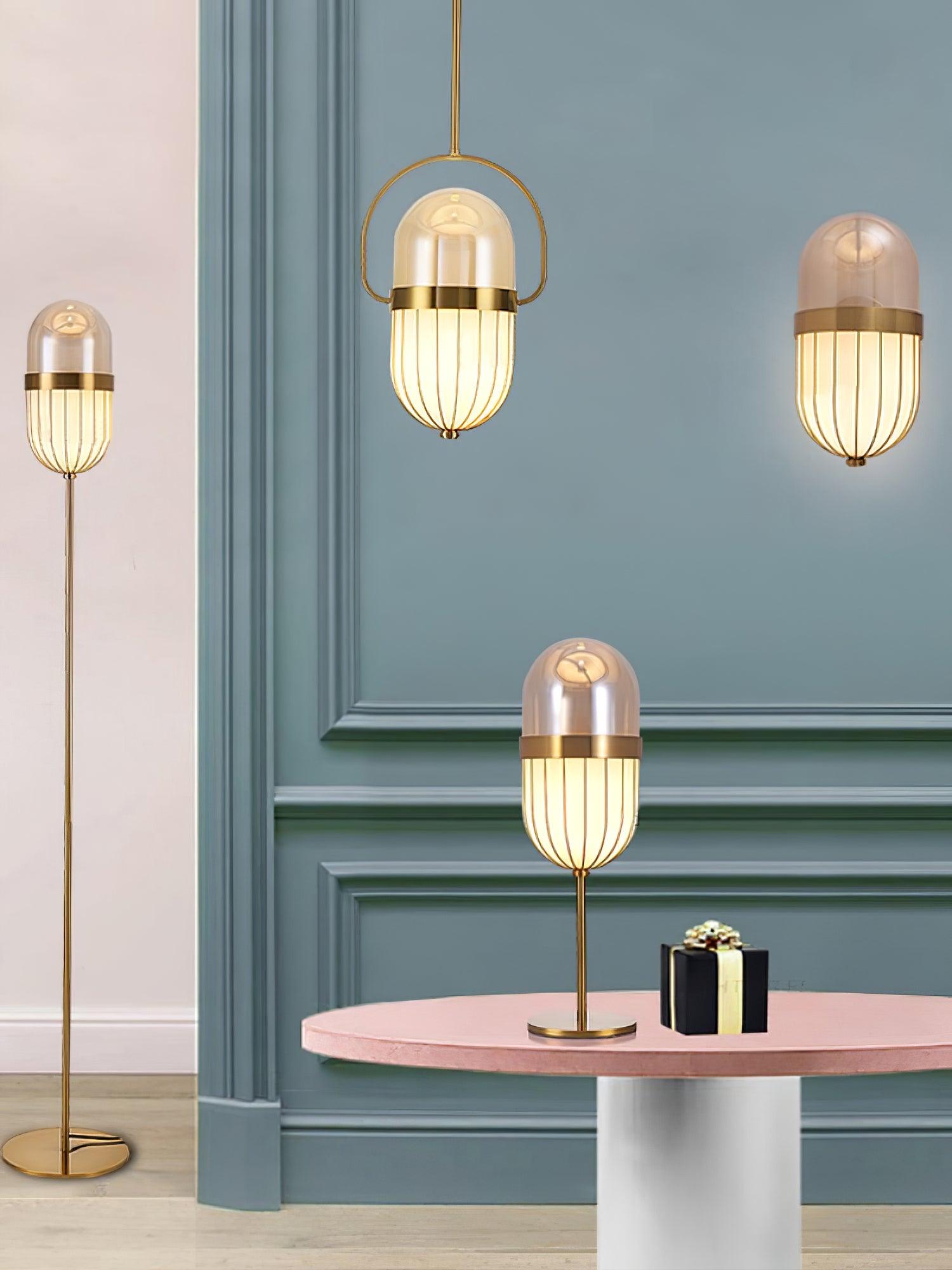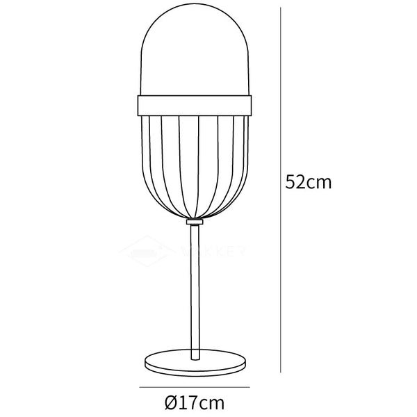 Yksittäistä valoa hajauttaa lasista valmistettu varjostin, joka puhallettiin suoraan sen kaarevaan metallirunkoon, jolloin syntyy ainutlaatuinen syleily, joka yhdistää erottamattomasti nämä kaksi elementtiä. Tämä pöytävalaisin luo lähes loungemaisen tunnelman.