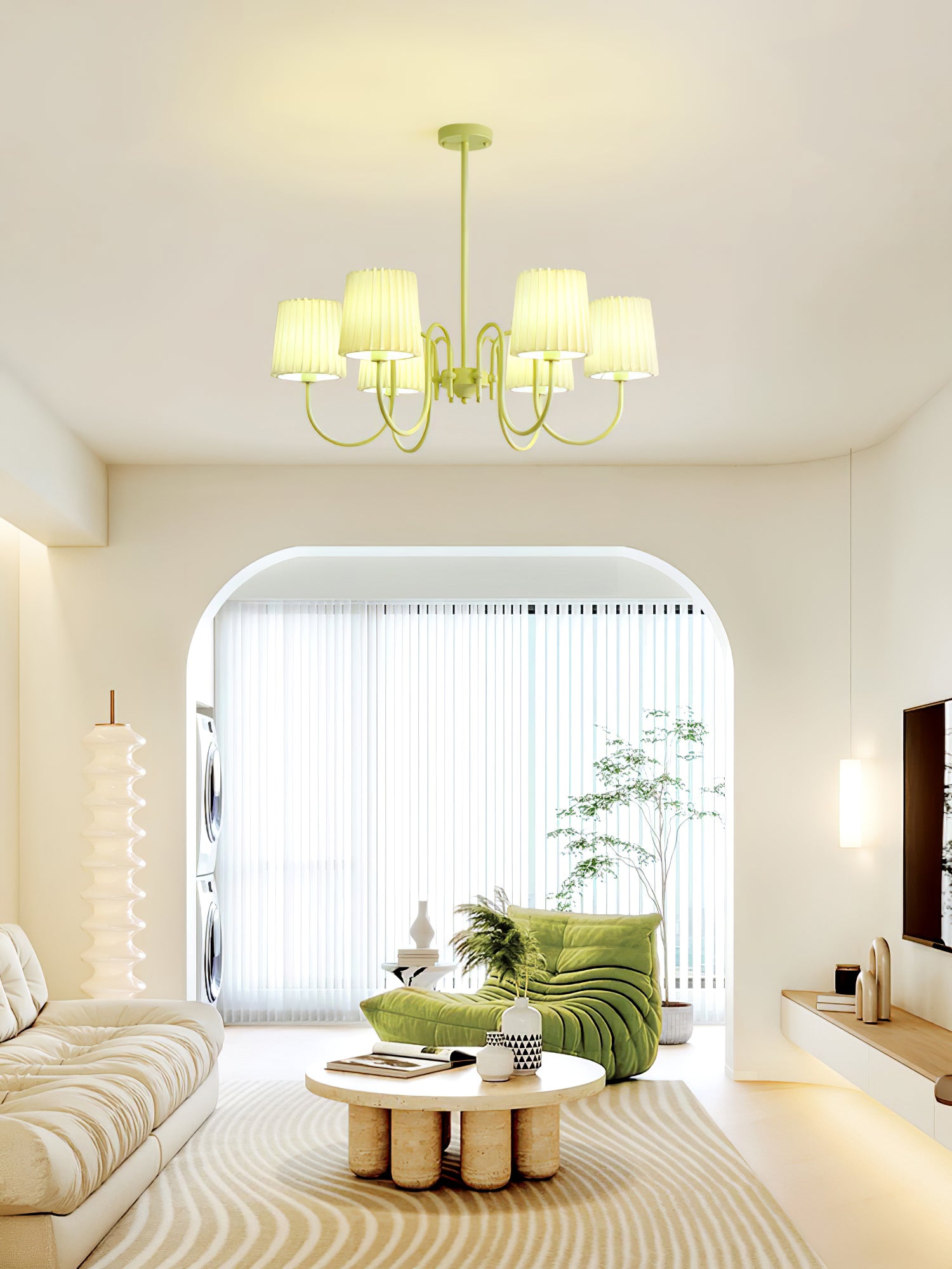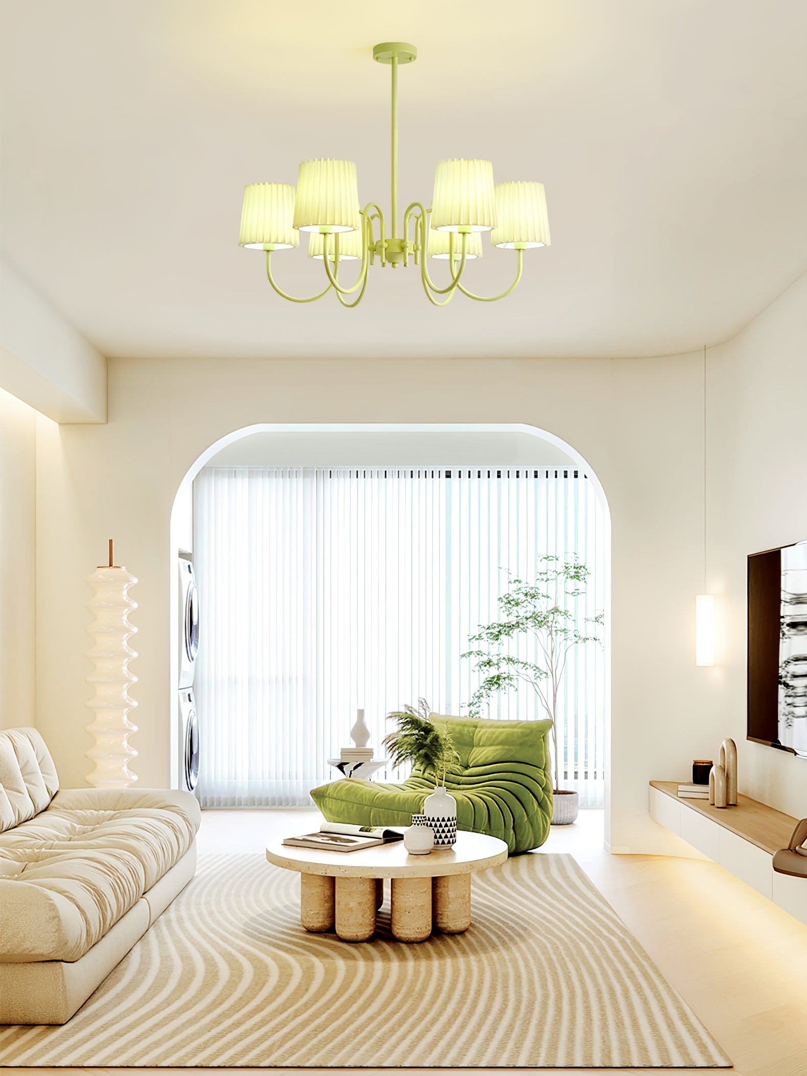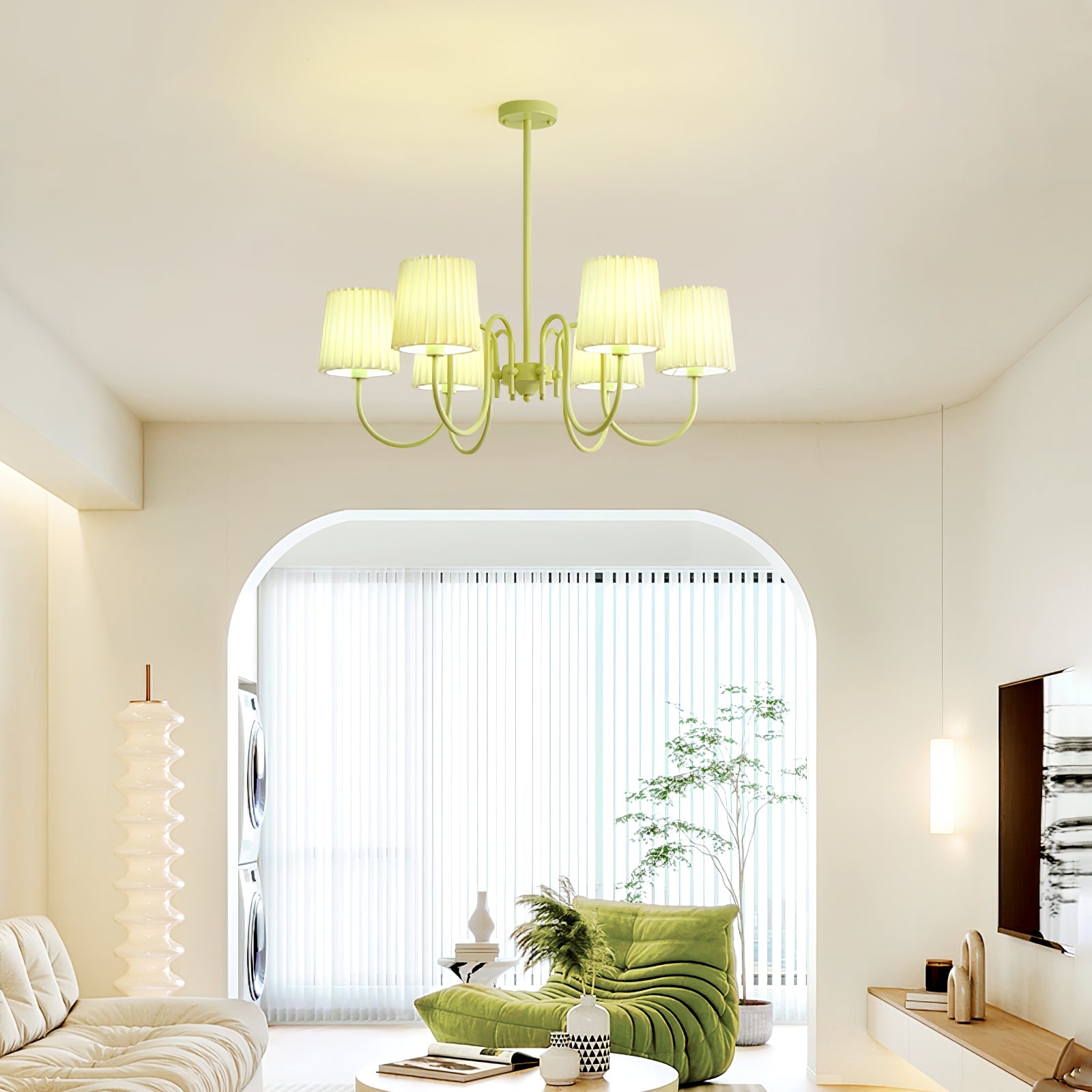 Pissoitu kangas Matcha-kattokruunu on upea valaistus jokaiseen huoneeseen. Sen laskostettu kangasvarjostin on valmistettu valkoisena, jossa on matcha-sävyinen aksentti, mikä luo kermanvärisen estetiikan modernilla, mutta herkällä otteella.