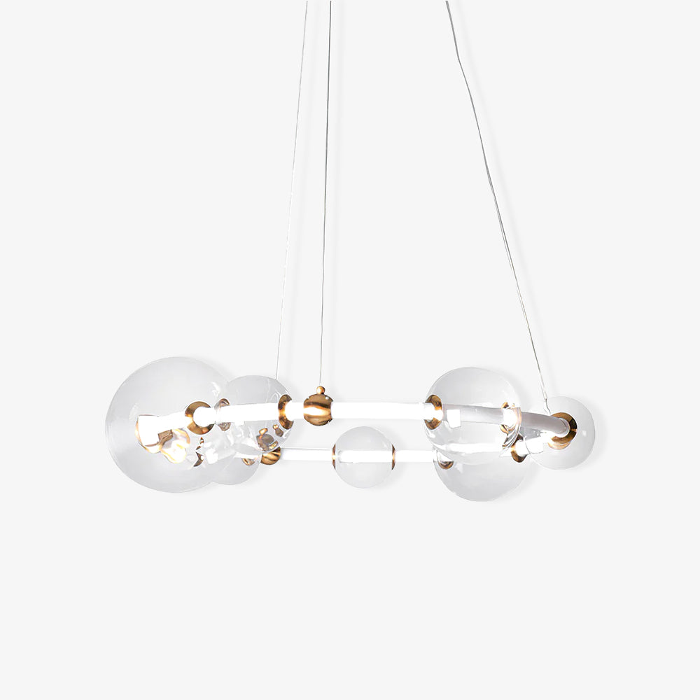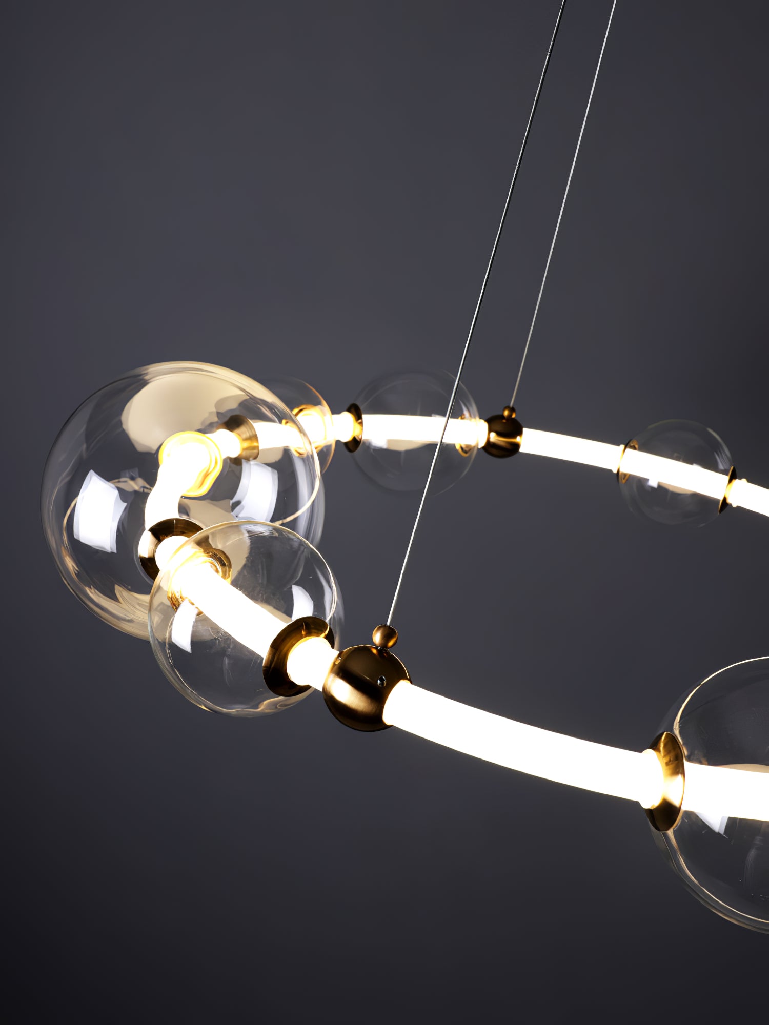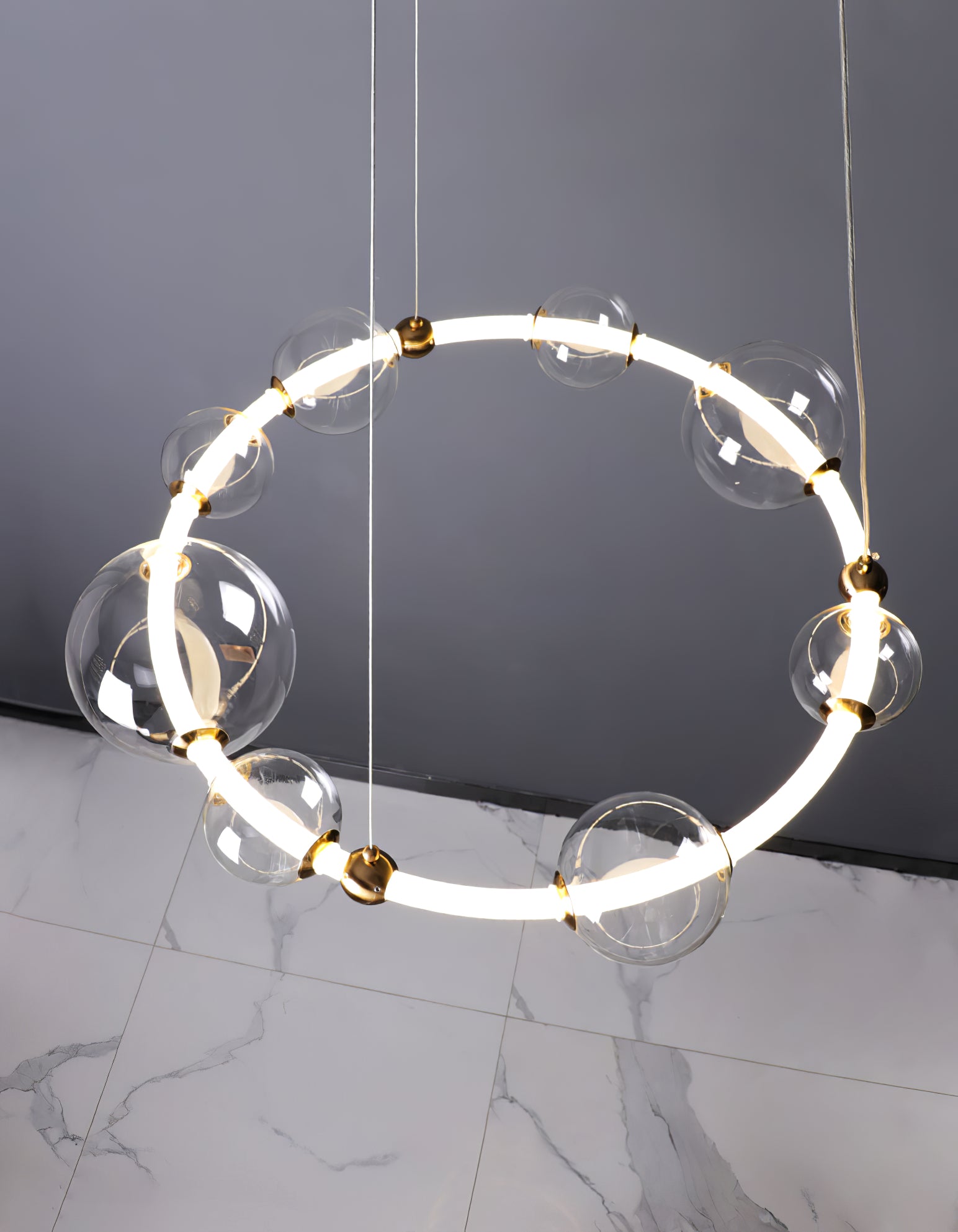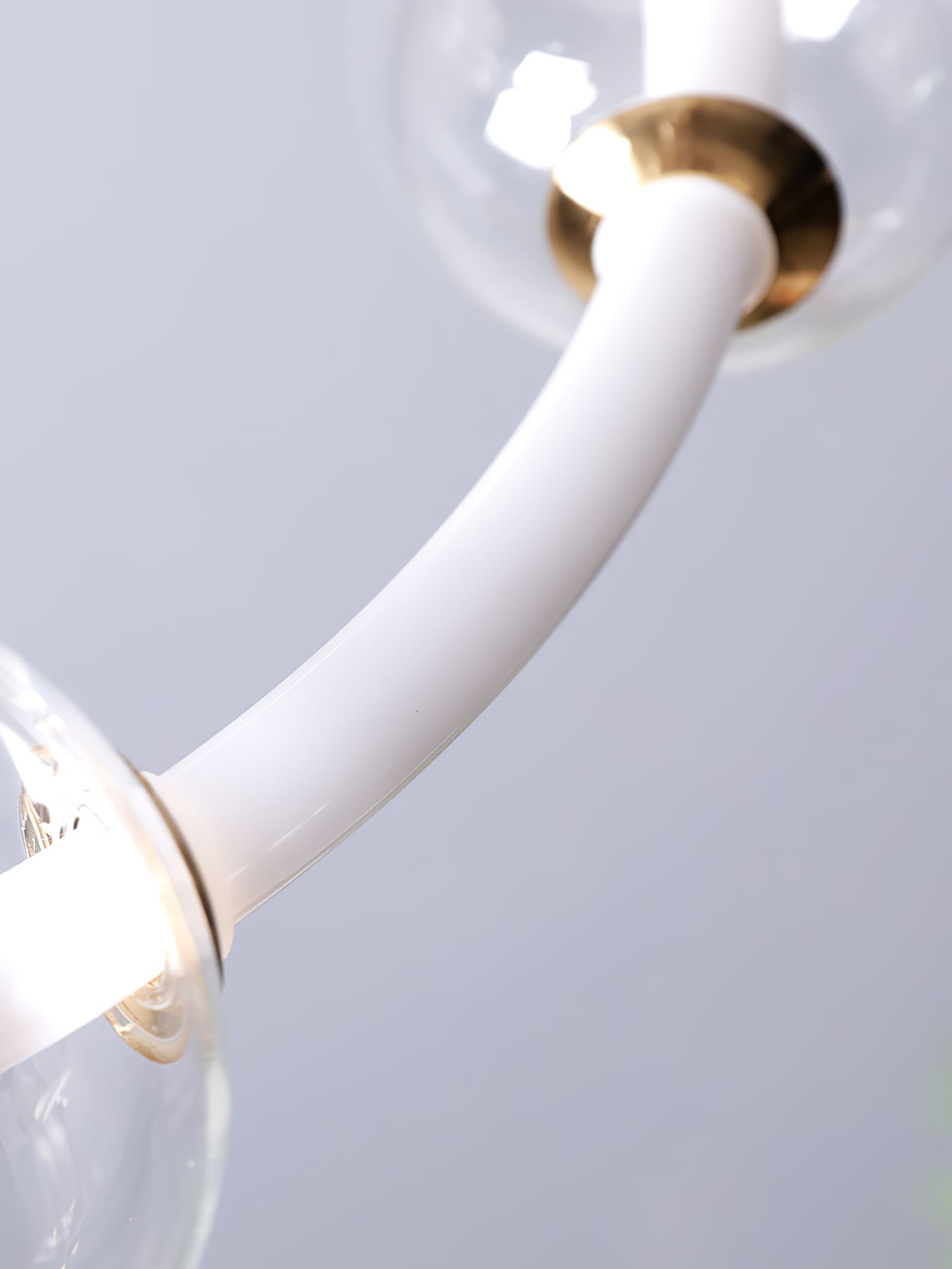 Nukkerengas on valmistettu suupuhalletusta lasista ja rengasmaisesta kehyksestä, joka luo nykyaikaista eleganssia. Kehys on valkoista akryylia ja lasivarjostimet kirkkaita.