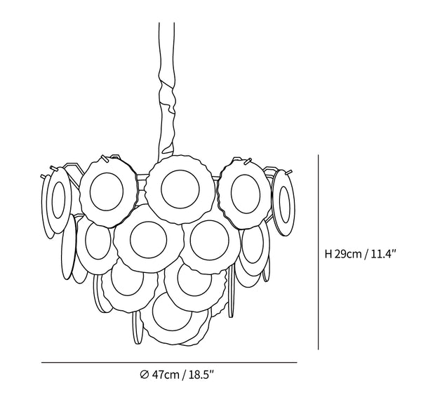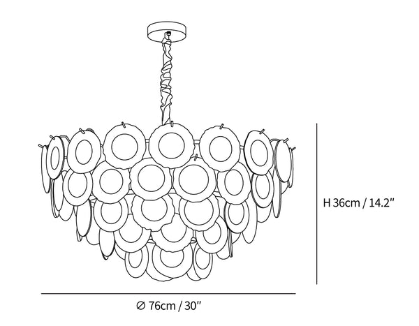 Koko: ∅ 30″ x K 14,2″ / Halkaisija 76 cm x K 36 cm (E14*12)