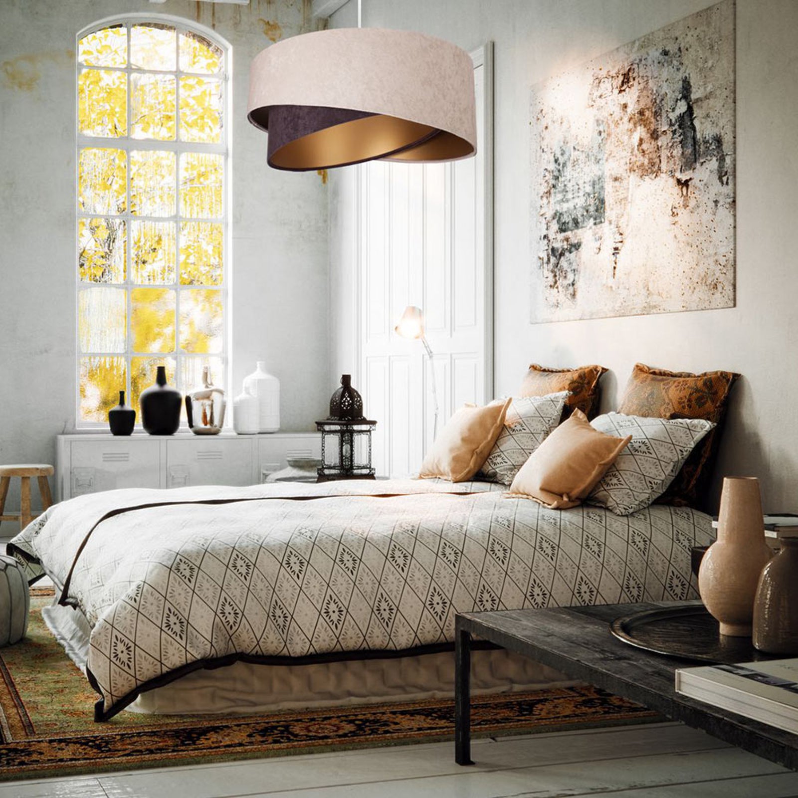 - Riippuvalaisin on valmistettu metallista ja kankaasta. Vahva metallikiinnike on korroosion- ja ruosteenesto. Kangasvarjostin, jossa on korkea valonläpäisy, tekee valosta pehmeän.