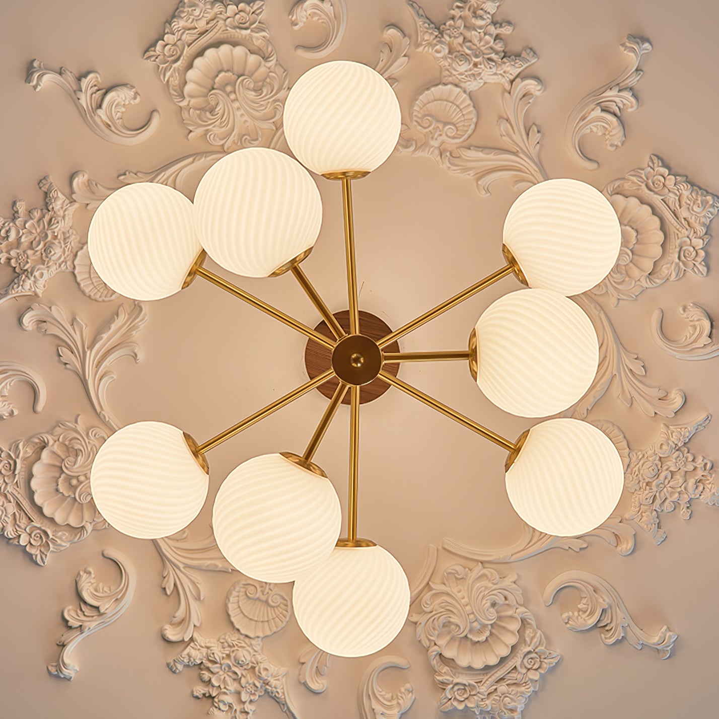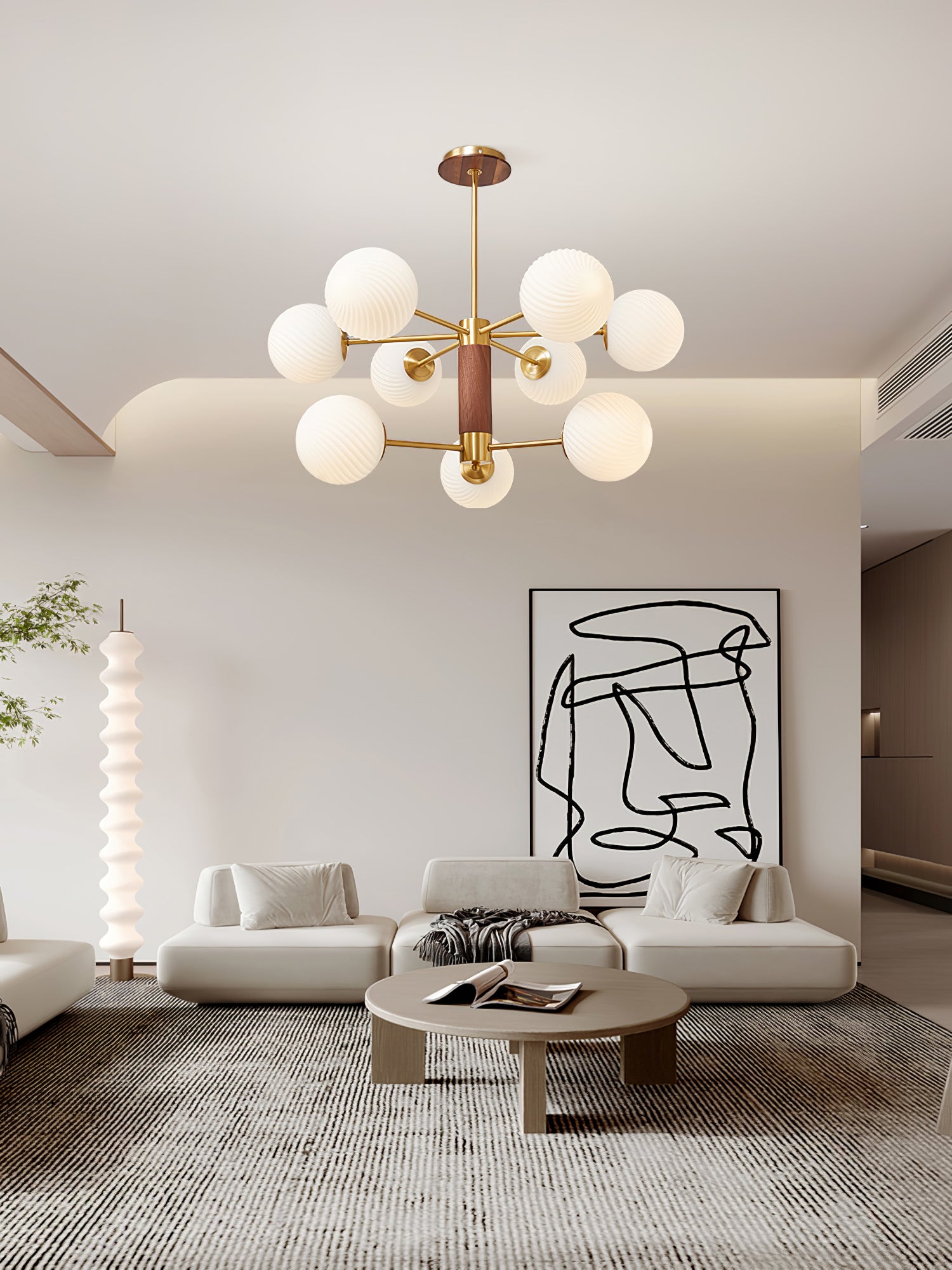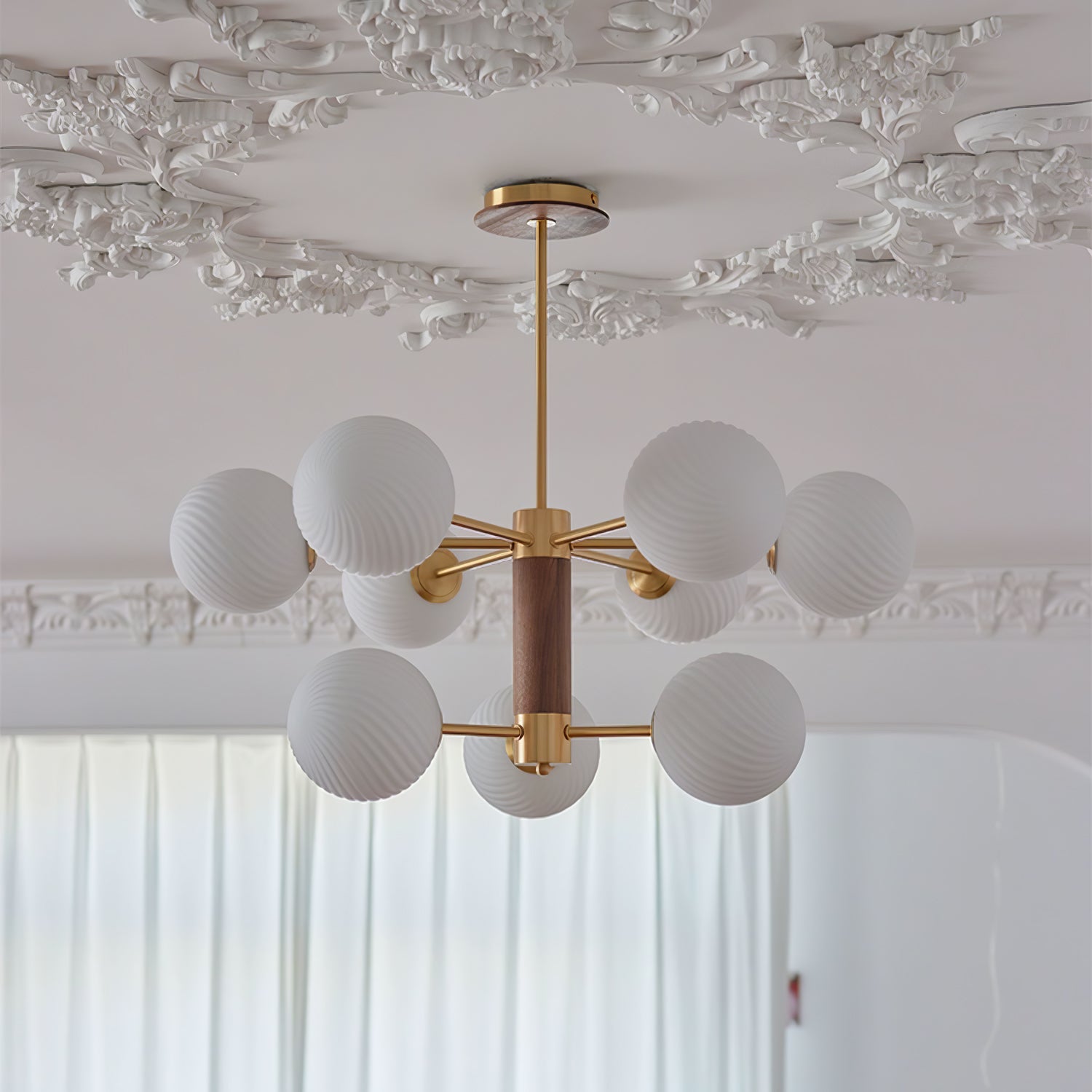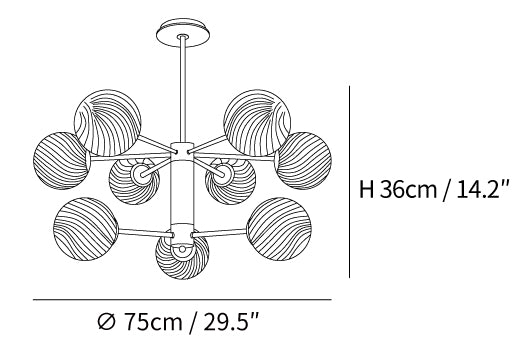 Tämä moderni ja ylellinen Babble Glass -kattokruunu valaisee tilasi hienostuneella ja tasapainoisella tavalla viinirypäleen muotoisilla uurretuilla lasipalloilla. Ribbotettu lasirakenne korostaa lumoavaa messinkiviimeistelyä, kun taas suuri haarautuva siluetti sopii täydellisesti nykyaikaisiin, avoimiin tiloihin.