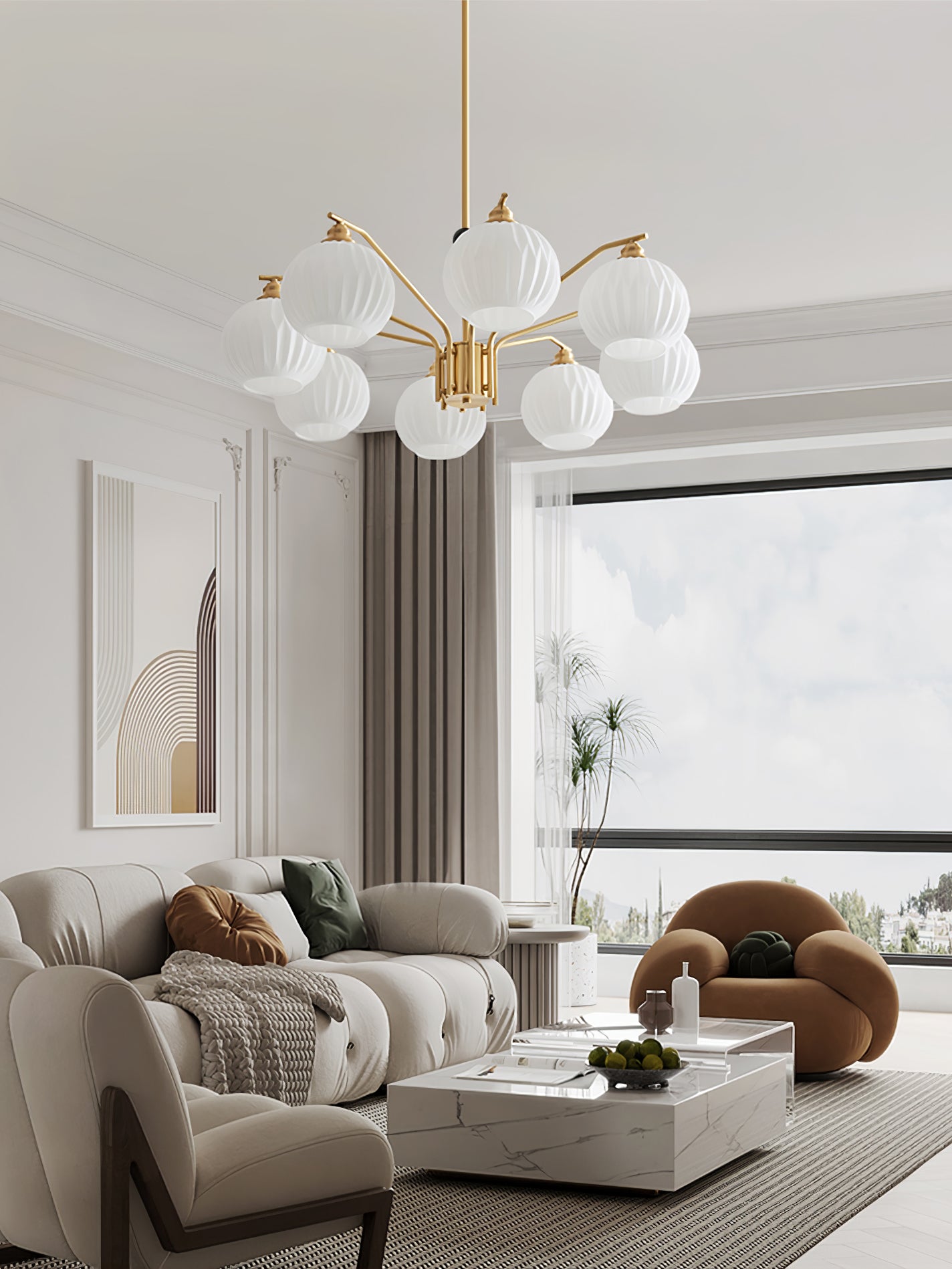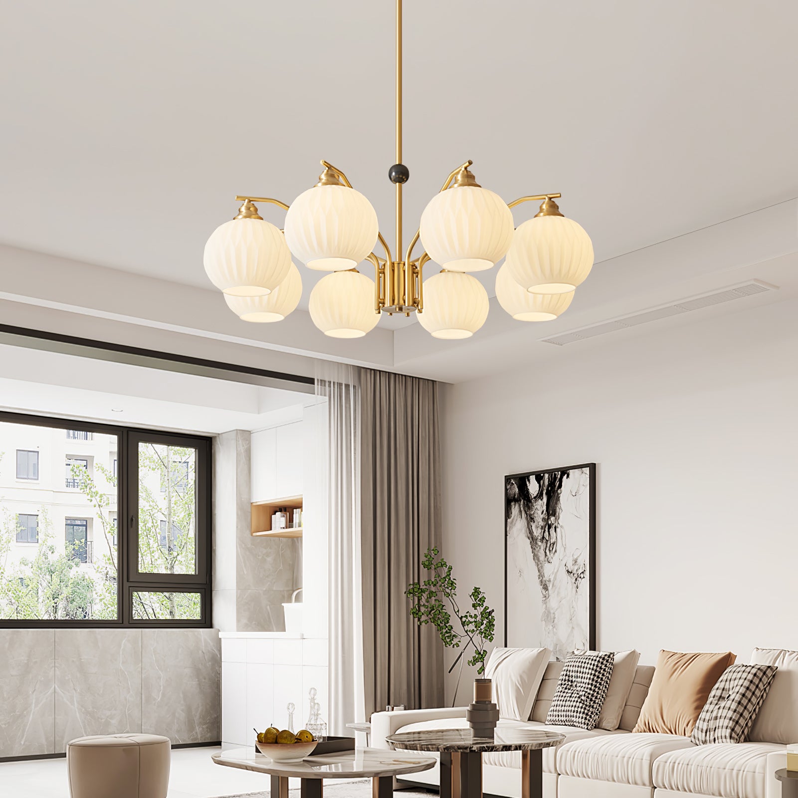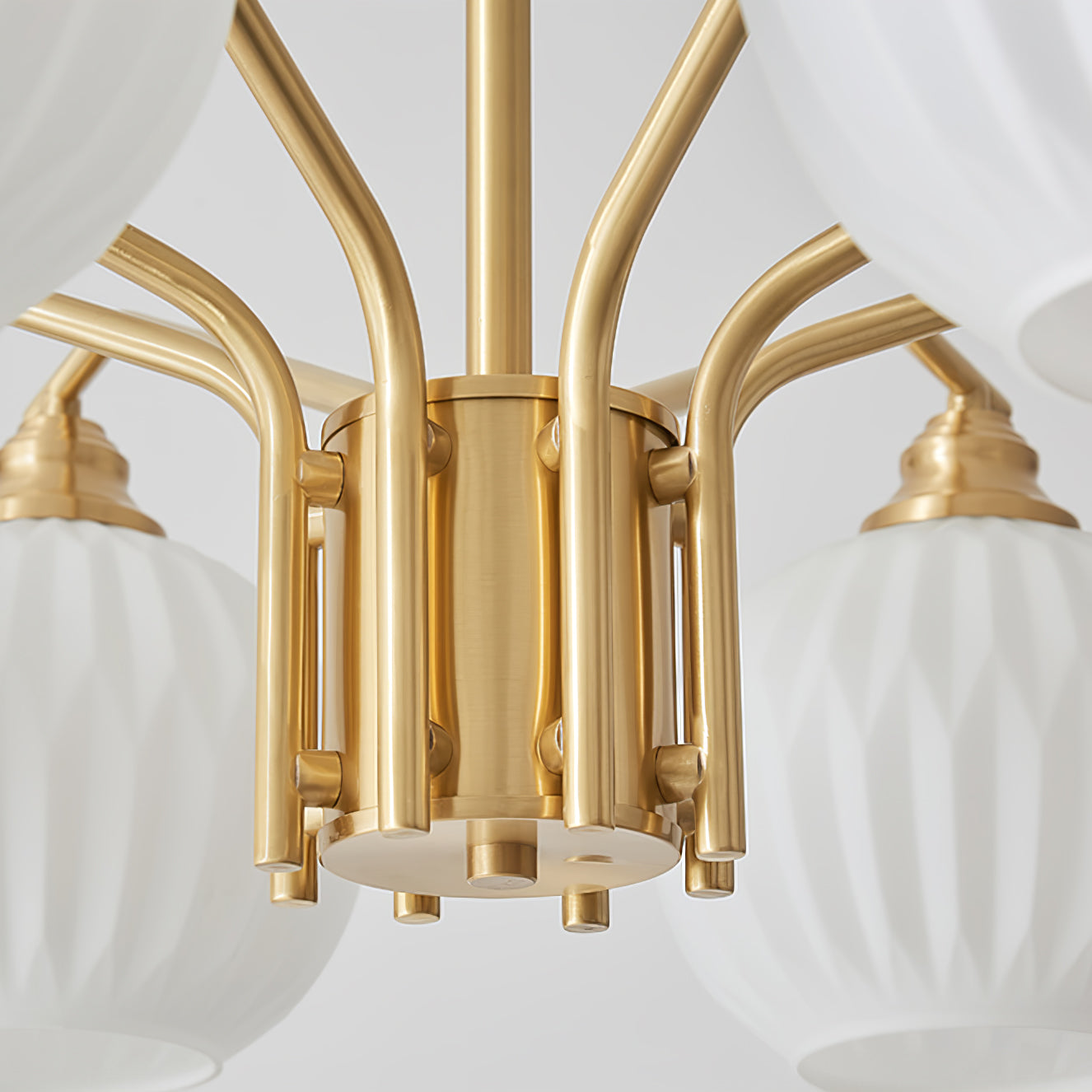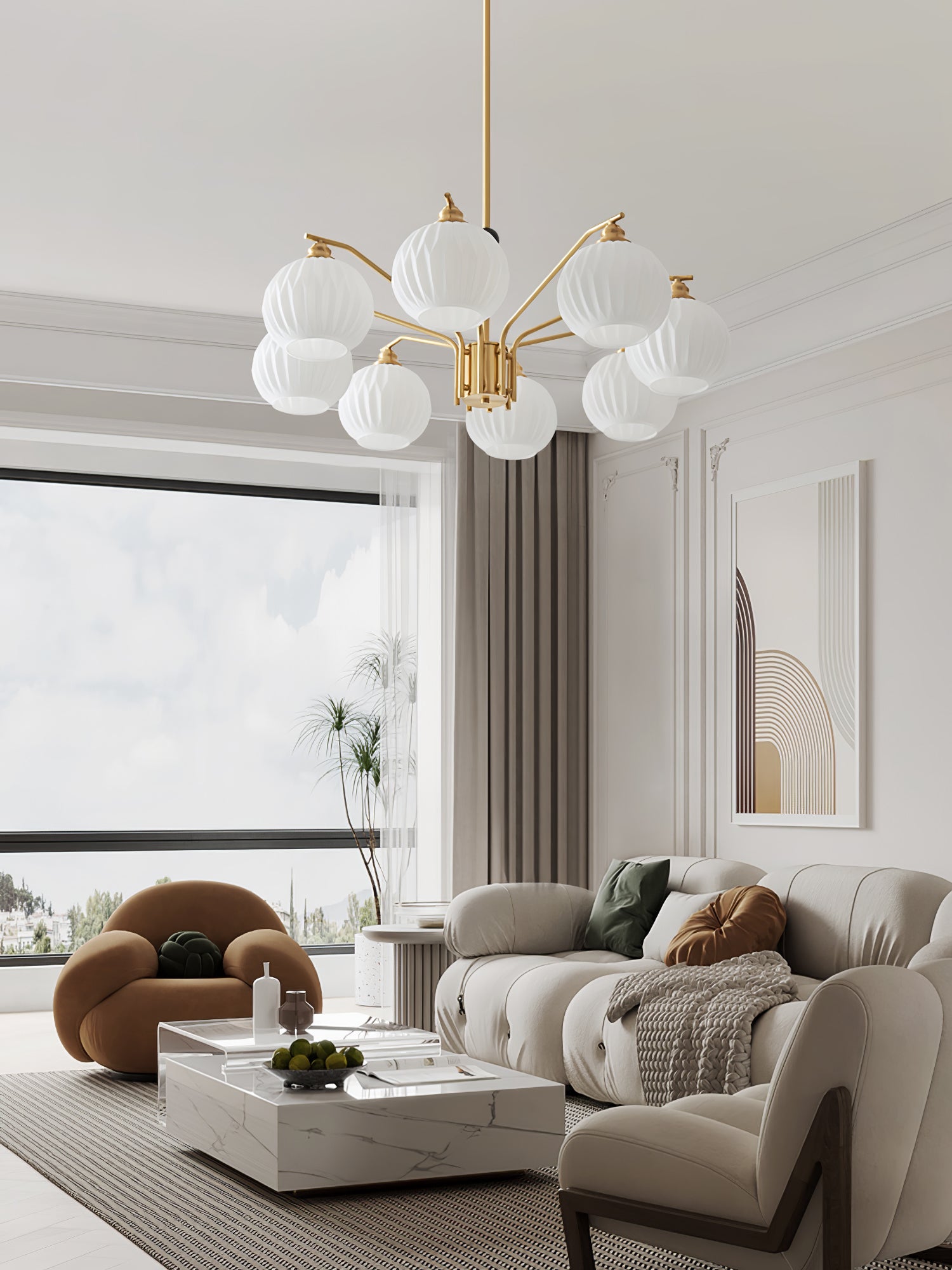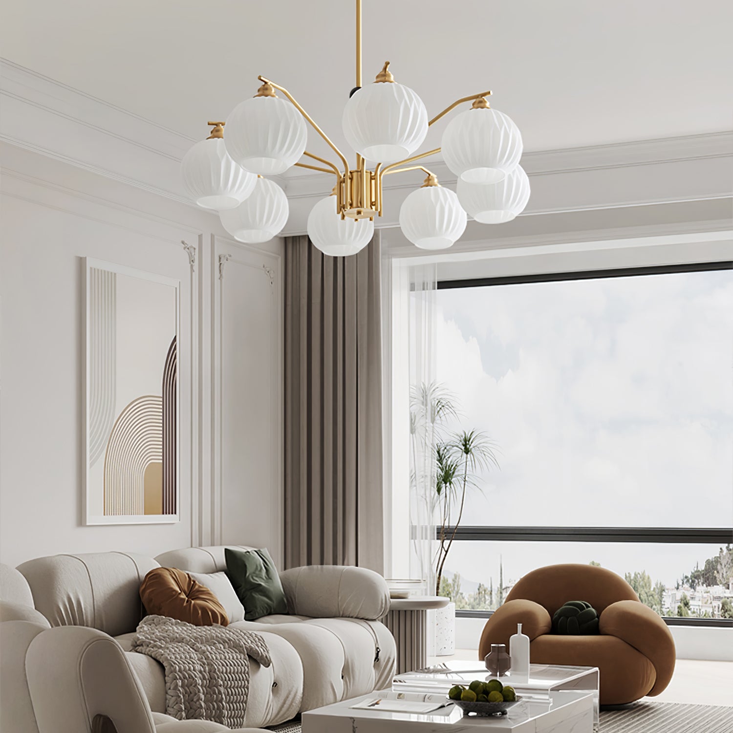 Tämä Ribbed Glass Gold -kattokruunu luo varmasti lämpimän ja kutsuvan tunnelman. Sen ainutlaatuisesti uurrettu lasivarjostin luo ylellisen ja herkän viehätyksen kermanvalkoisissa ja kultaisissa sävyissä. Sen upea estetiikka lisää hienostuneisuutta mihin tahansa huoneeseen.