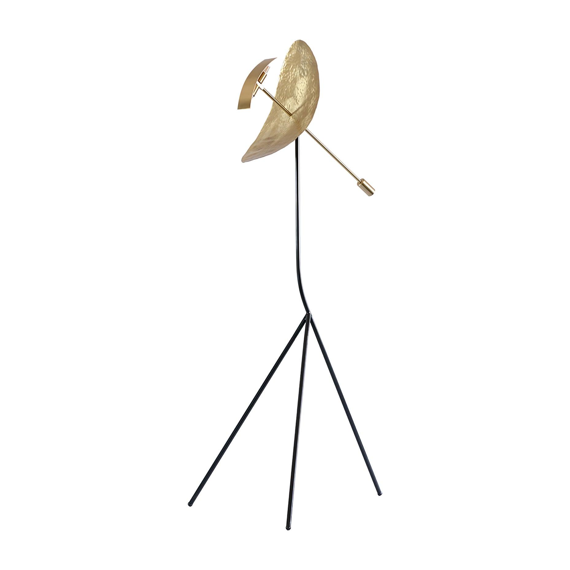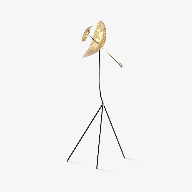 Veistoksellinen mutta herkkä, tässä upeassa lattiavalaisimessa on hohtava soikea diffuusori, joka on valmistettu käsin vasaroidusta messingistä ja tasapainotettu ruostumattomalla teräksellä viimeistellyllä jalustalla. Lampunvarjostimen keskiosan poikki leikkaavalle kapealle varrelle sijoitettu hieman kaareva suorakaiteen muotoinen kaistale sisältää valonlähteen, luoden eloisia, aaltoilevia heijastuksia, jotka tuovat mieleen vettä.