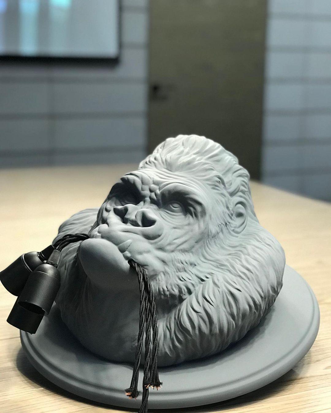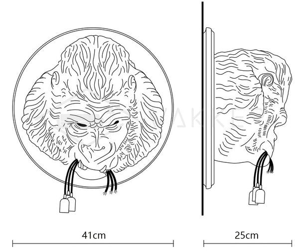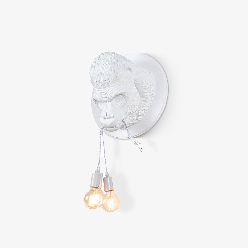 Epäkeskinen ja moderni, tämä gorillan pään muotoinen seinävalaisin lisää rohkean aksentin nykyaikaisiin sisustuksiin. Se tarjoaa erinomaisen valaistuksen kolmesta E27-polttimosta (ei sisälly toimitukseen), jotka riippuvat kaapeleista, jotka on vangittu eläimen leukojen väliin. Sen turkki ja somaattiset ominaisuudet on muotoiltu huolella, mikä saavuttaa harvinaisen viehätyksen, uhkaavan ja rajun hyperrealistisen vaikutuksen.