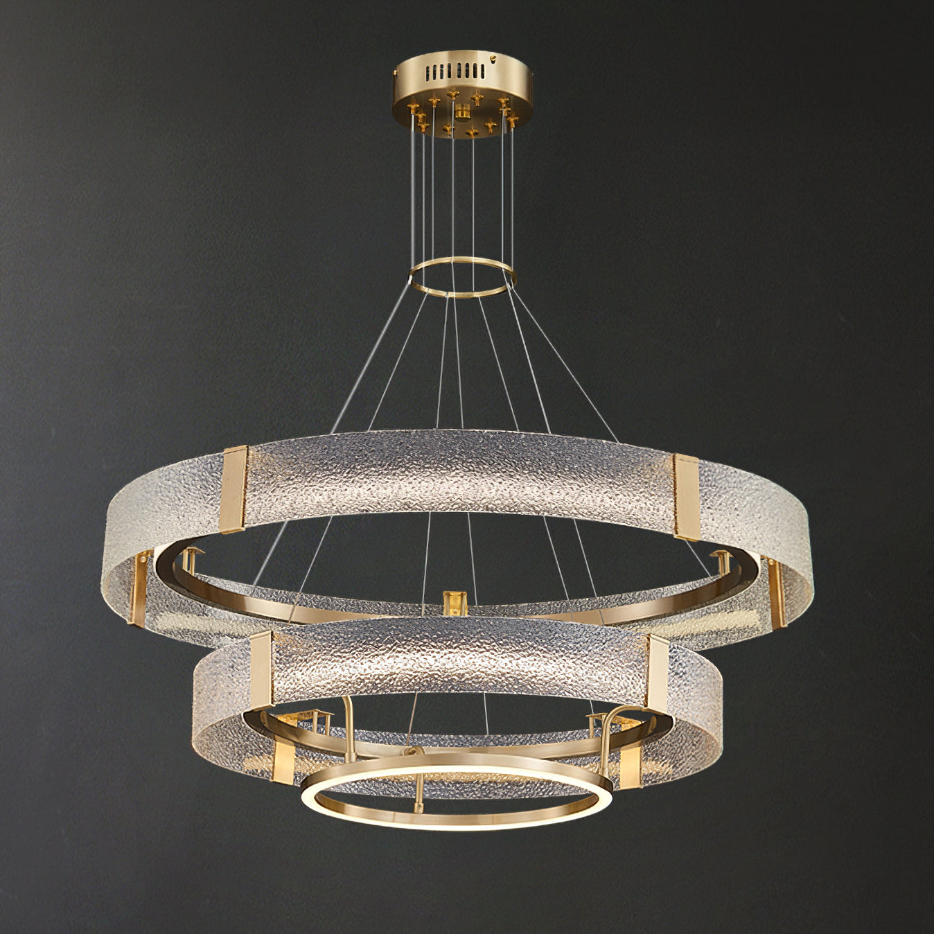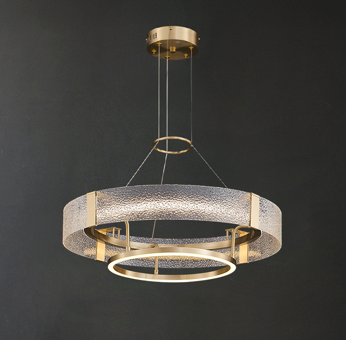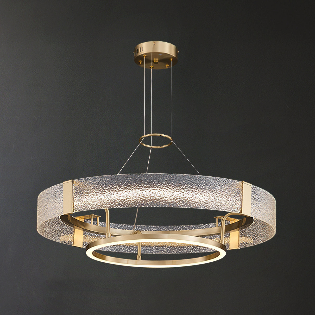 Kruunussa on ainutlaatuinen aallotettu lasiefekti, joka antaa pehmeän ja herkän valon, joten se sopii täydellisesti kodikkaan ja kutsuvan tunnelman luomiseen ruokasaleihin, olohuoneisiin tai makuuhuoneisiin. Messinkikehys on huolellisesti kiillotettu tyylikkääksi ja sileäksi, mikä lisää kattokruunuun ripaus modernia ja glamouria.