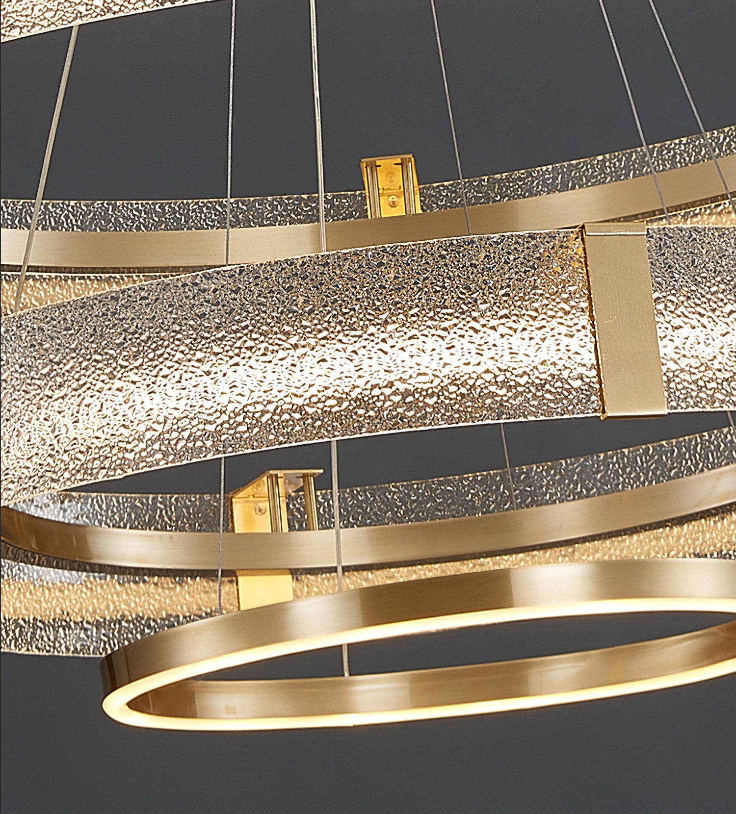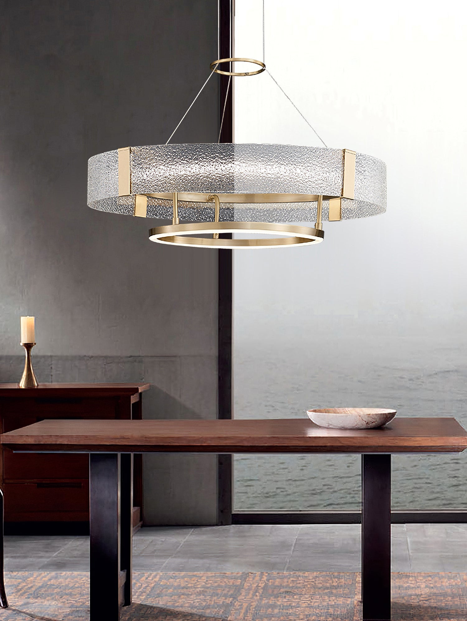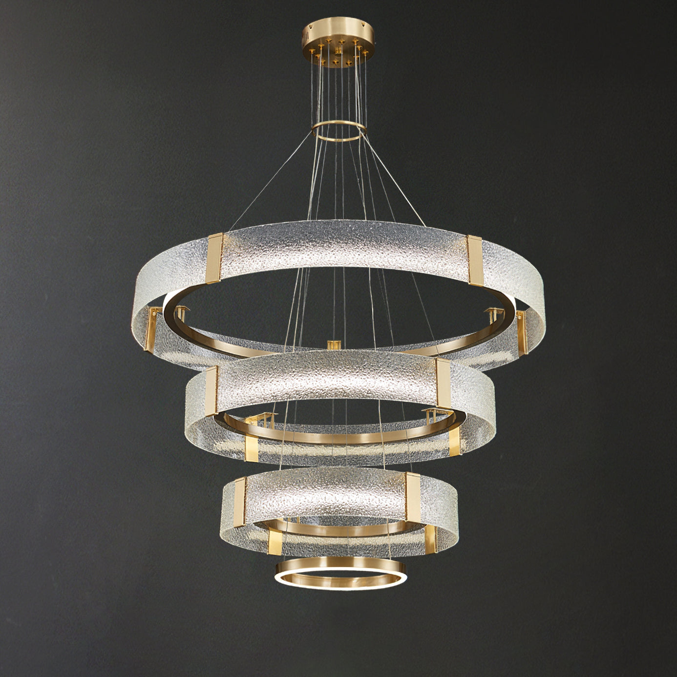 Kruunussa on ainutlaatuinen aallotettu lasiefekti, joka antaa pehmeän ja herkän valon, joten se sopii täydellisesti kodikkaan ja kutsuvan tunnelman luomiseen ruokasaleihin, olohuoneisiin tai makuuhuoneisiin. Messinkikehys on huolellisesti kiillotettu tyylikkääksi ja sileäksi, mikä lisää kattokruunuun ripaus modernia ja glamouria.