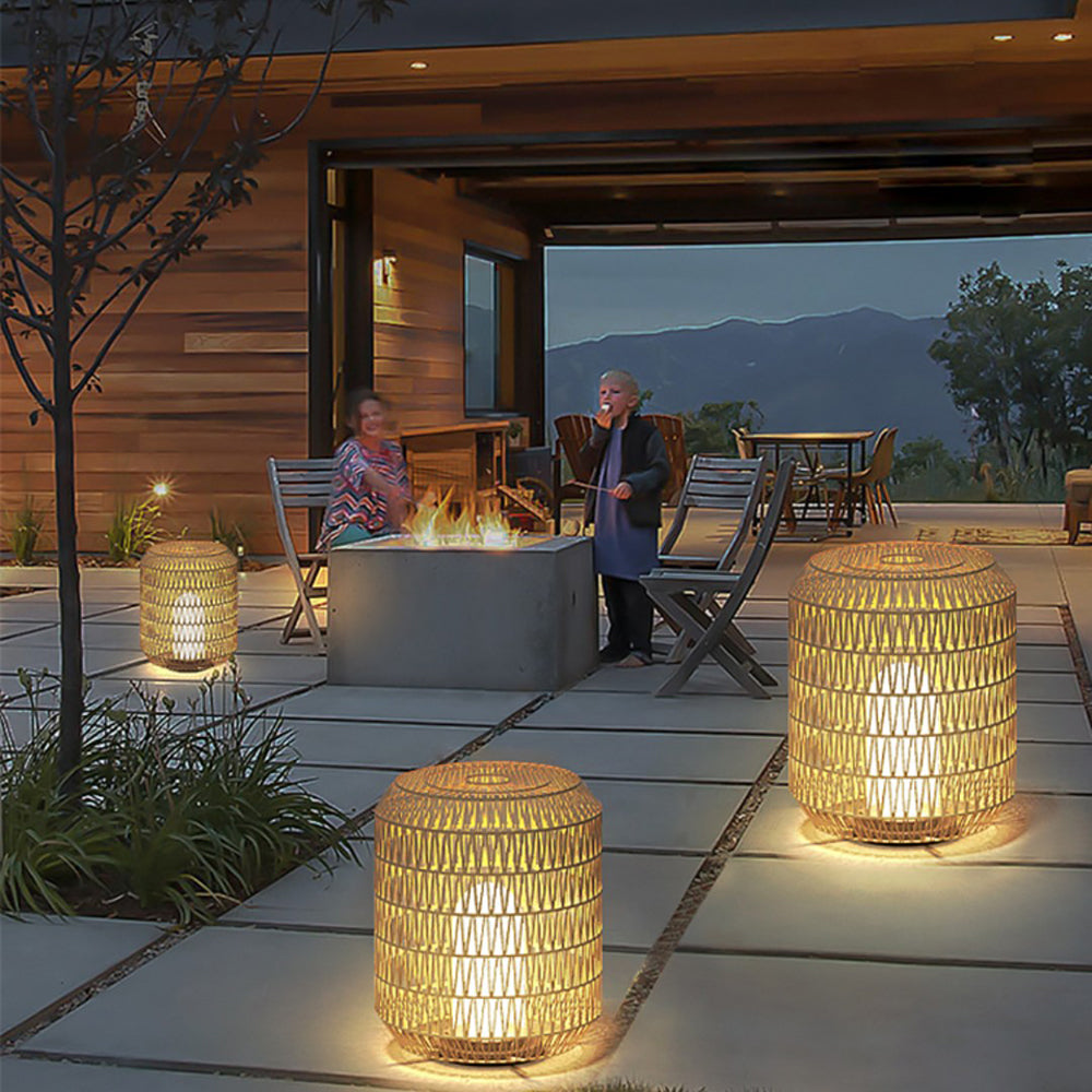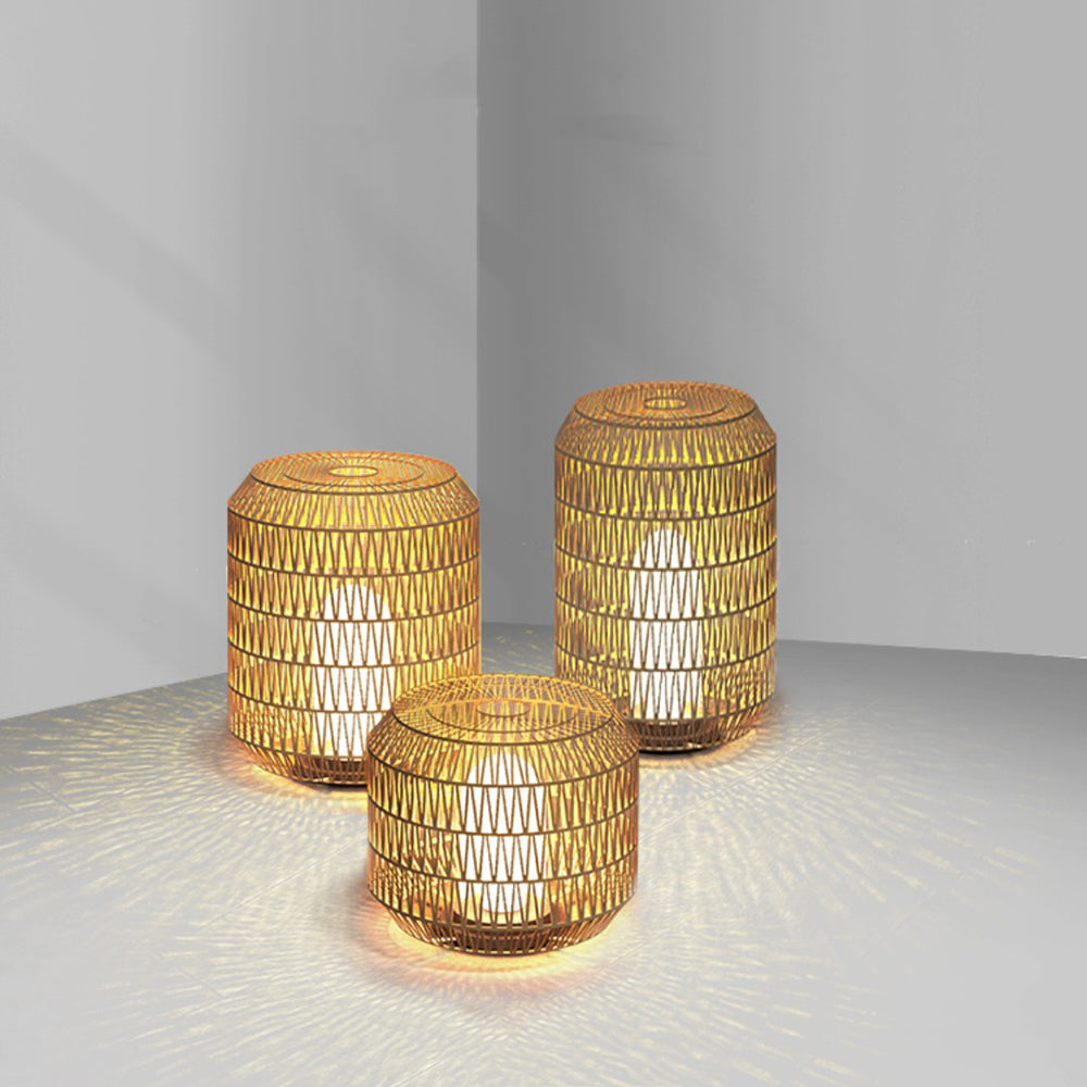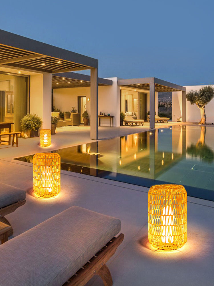 - Näiden lattiavalaisimien klassiset rummun muotoiset rottinkivarjostimet tarjoavat yksinkertaisen, orgaanisen ja ajattoman muodon hillitylle ulkonäölle.