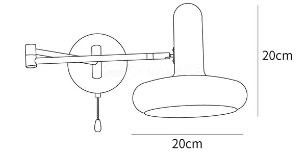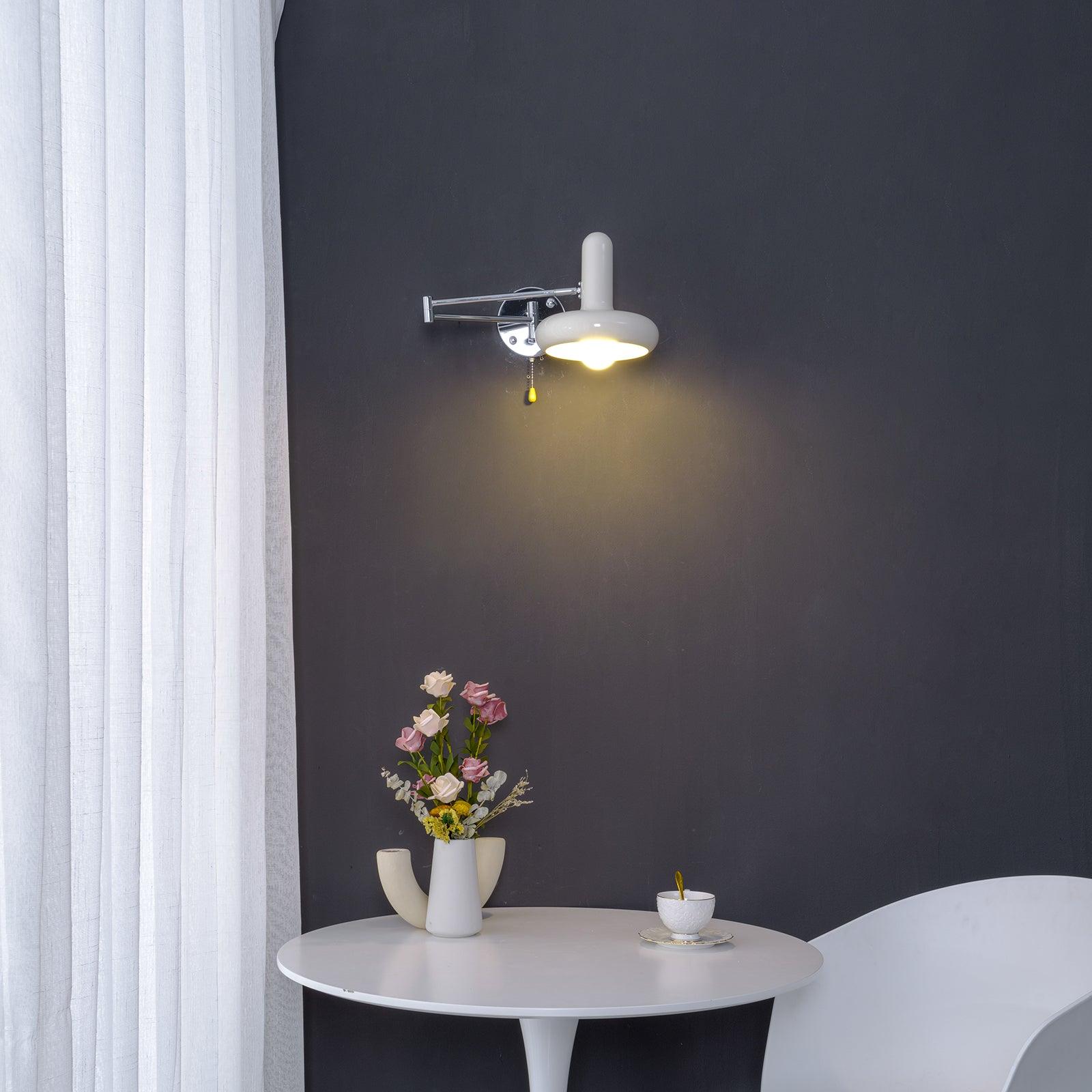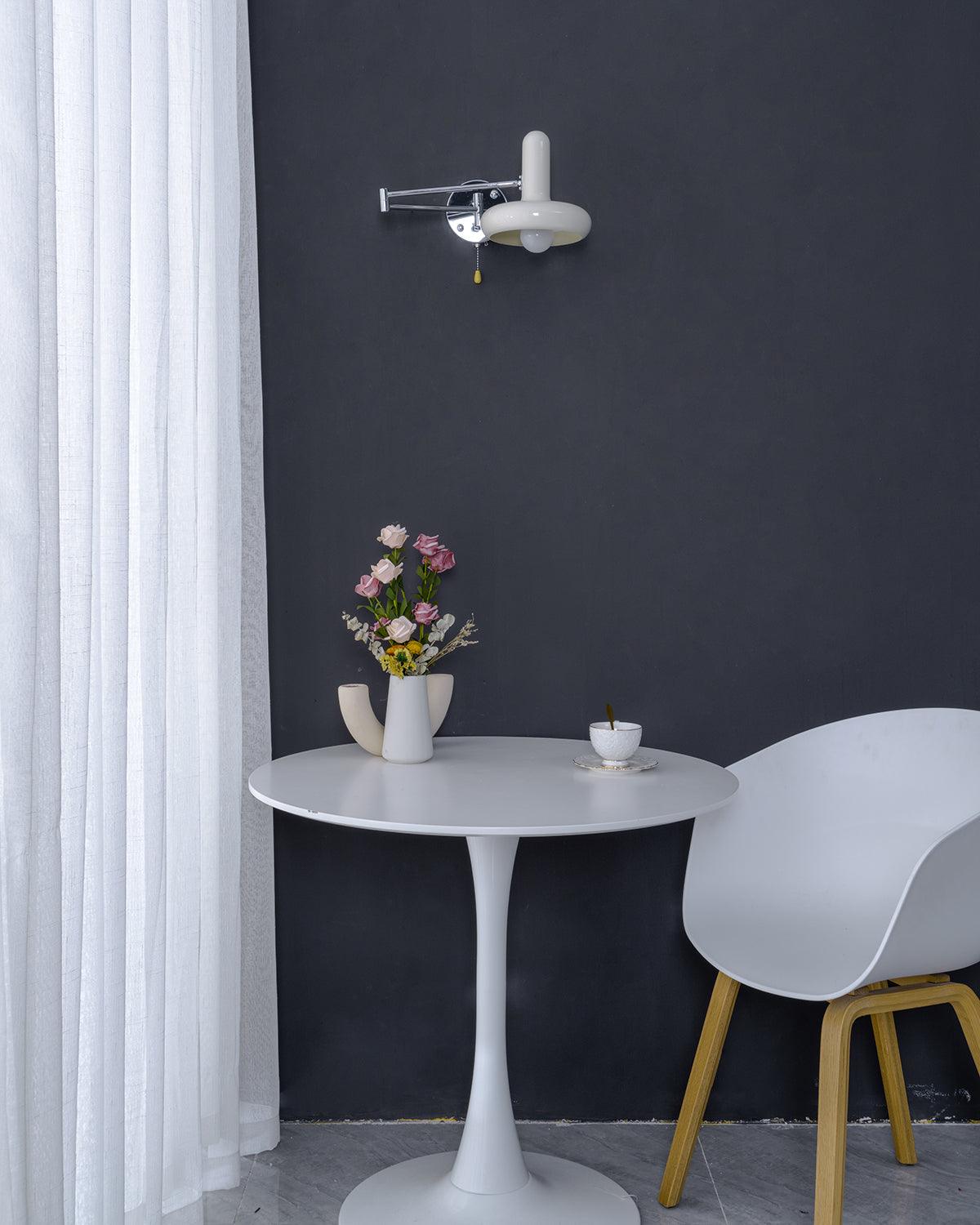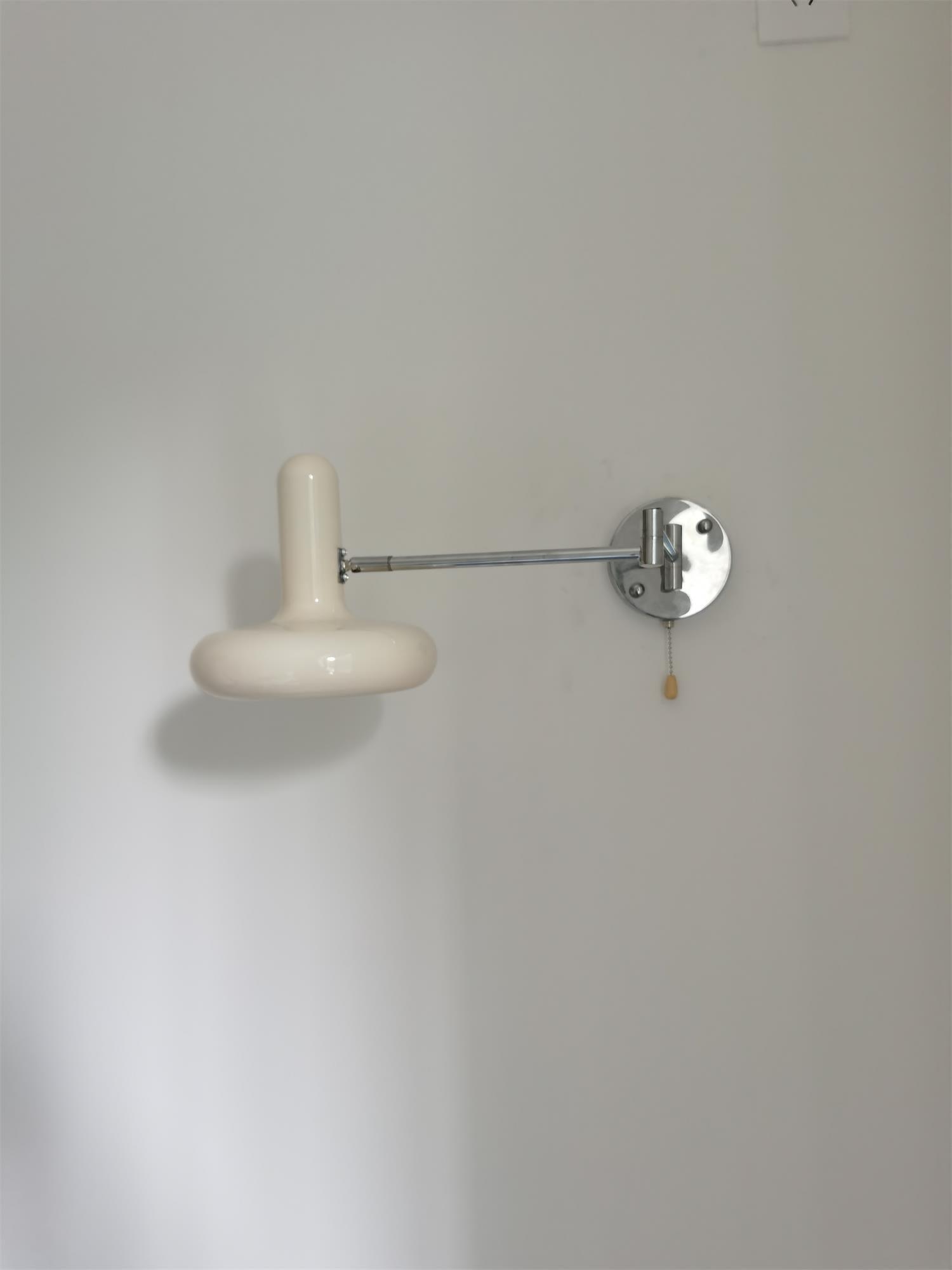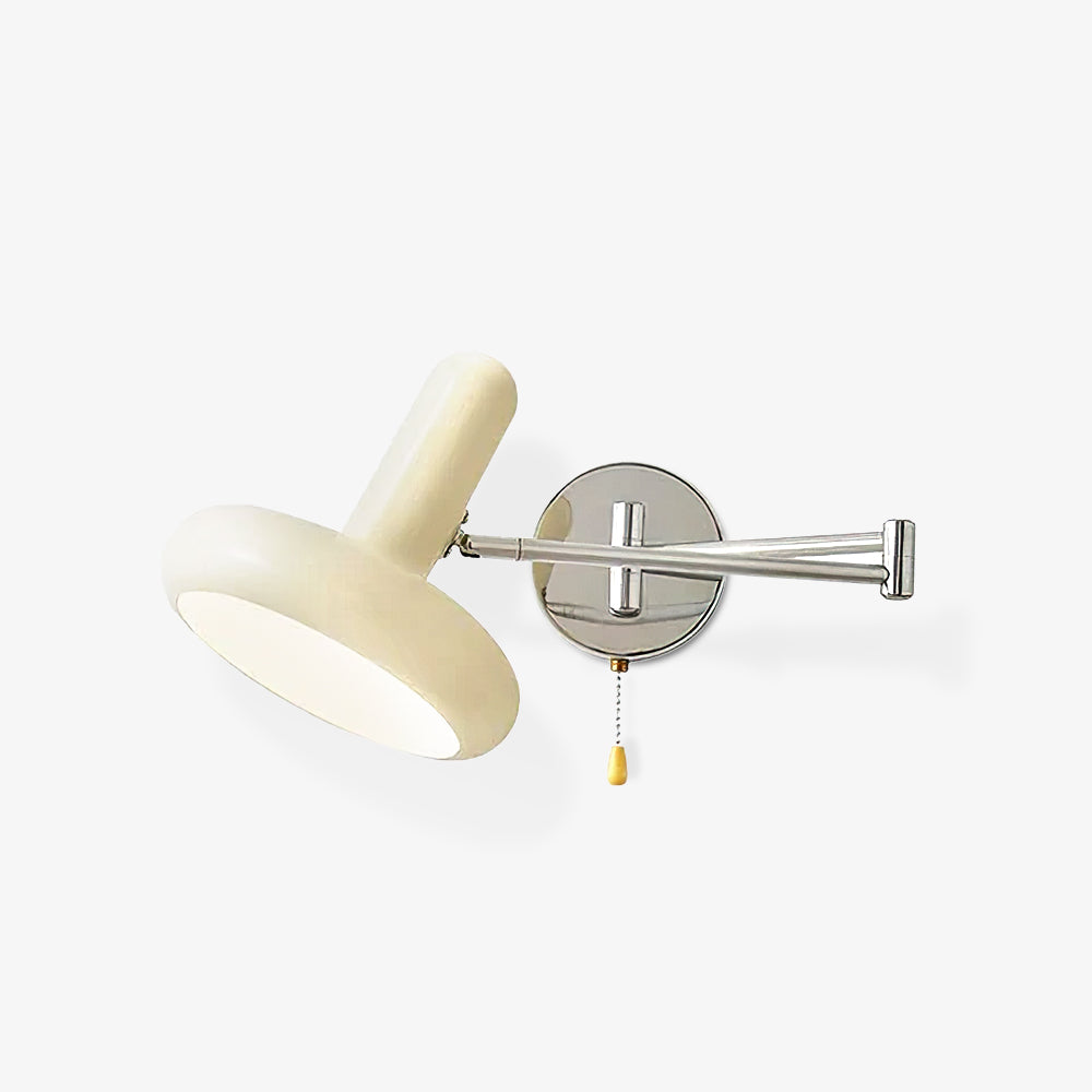 Se pitää kiinni pyöreästä seinätelineestä. Omien ideoiden mukaan E27-pistorasiaan sijoitettua valonlähdettä ympäröi varsivipu ja pyöreä lampunvarjostin, joka voidaan suunnata joustavasti ylös ja alas, jotta valaistus voidaan kytkeä päälle tarpeen mukaan. Tämä kermanvärinen seinävalaisin sopii mainiosti lukuvaloksi.