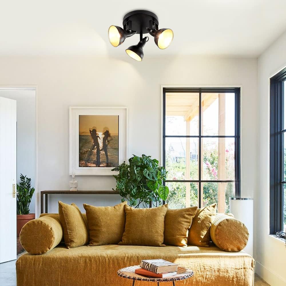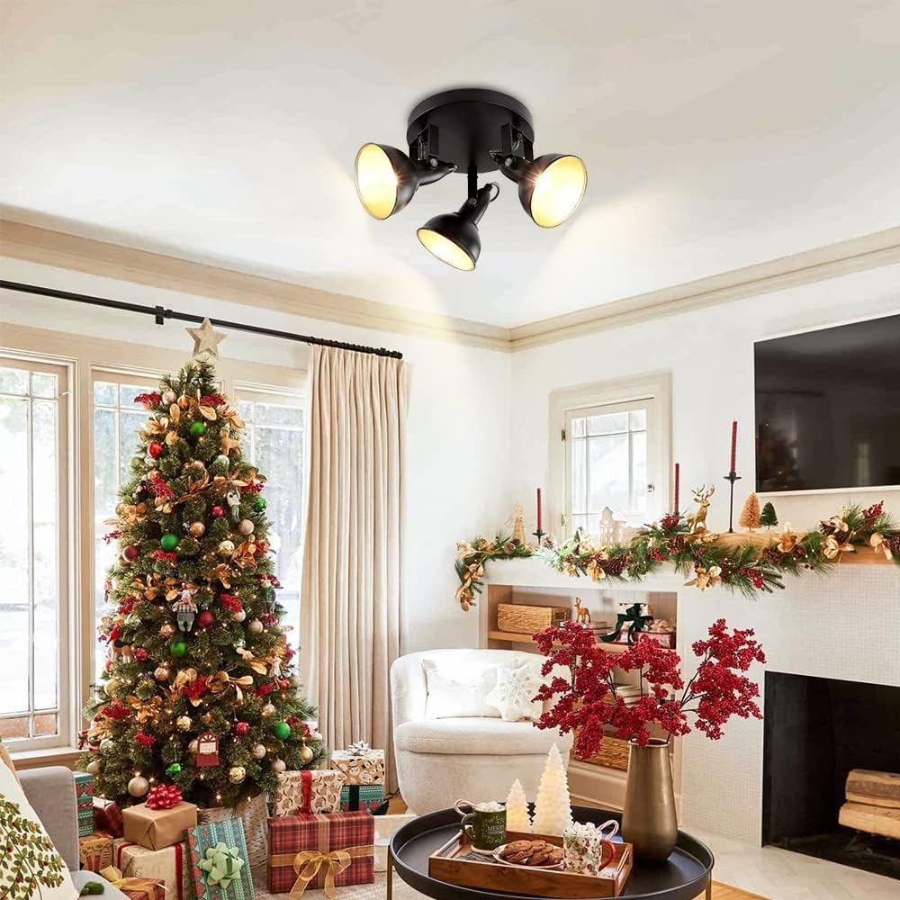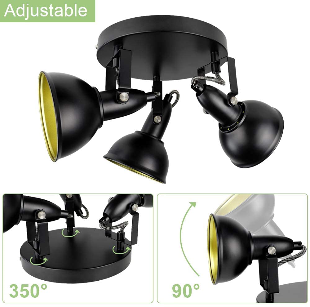 DINGLILIGHTING Retro 3-suuntaiset kattokohdevalot, pyöreä pohja, kääntyvä pää, musta kultainen kääntyvä kattovalaisin olohuoneeseen makuuhuoneeseen eteiseen kellari