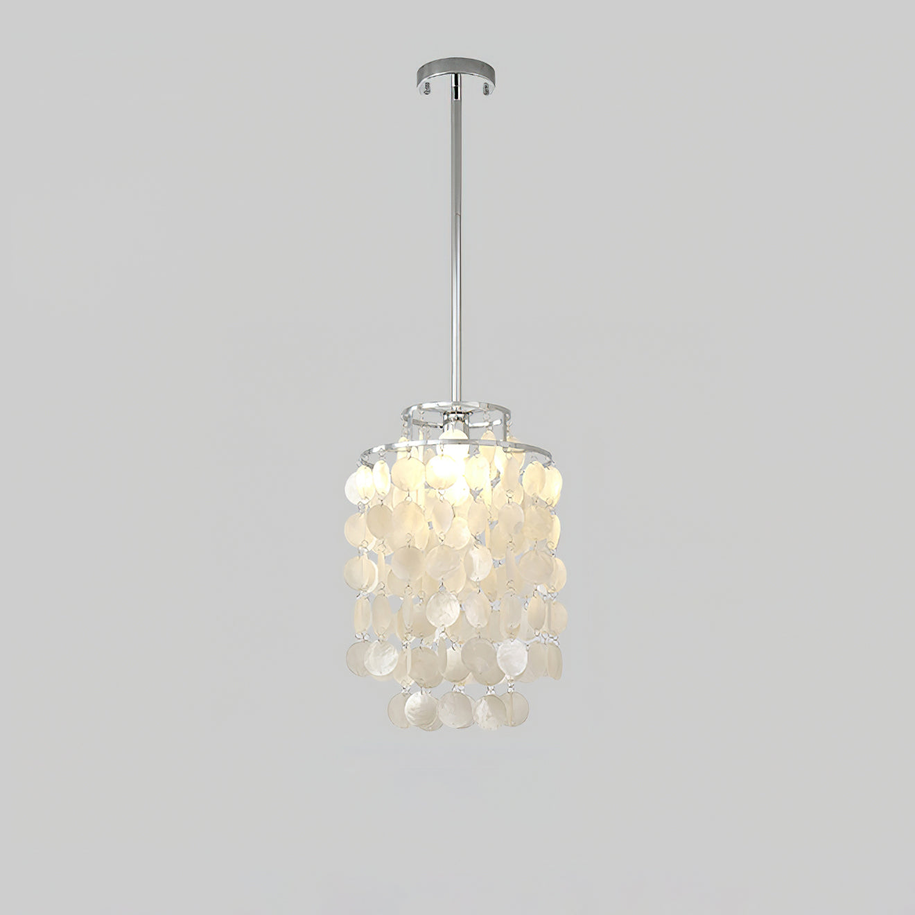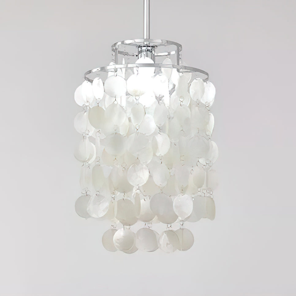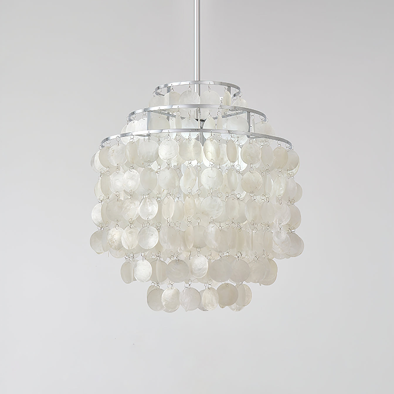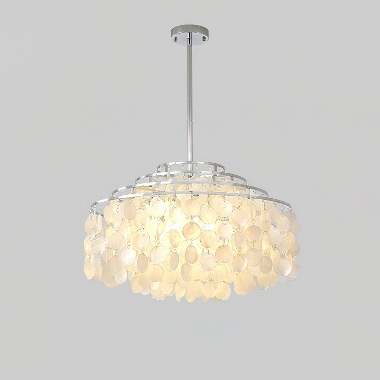 Tässä pyöreäkuorisessa kattokruunulampussa on kiiltävä kromattu runko, jossa on vähitellen kasvavia metallirenkaita, jotka on ripustettu ainutlaatuisen kokoisilla kuorilevyketjuilla. Kun valo on valaistu, kuorilevyjen läpikuultava pinta valaistuu, mikä luo upean valon ja varjon leikin. Täydellinen mihin tahansa tilaan, jossa tarvitaan tyylikäs ja lumoava valaisin.