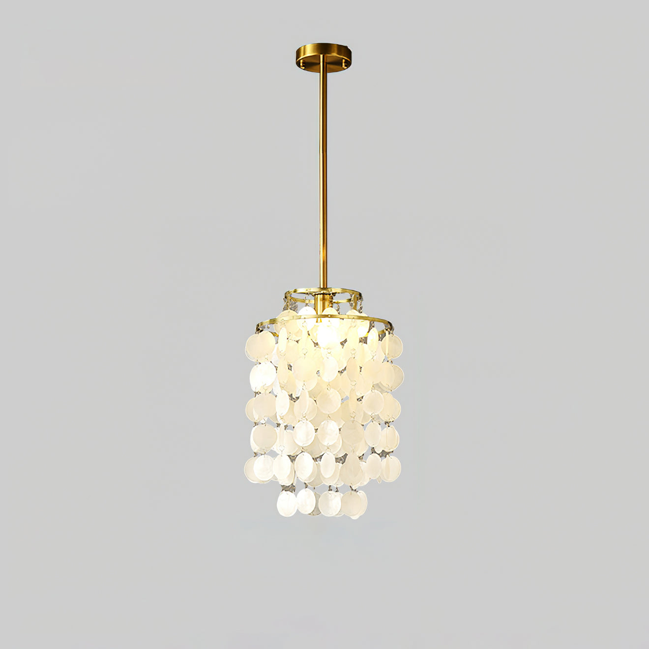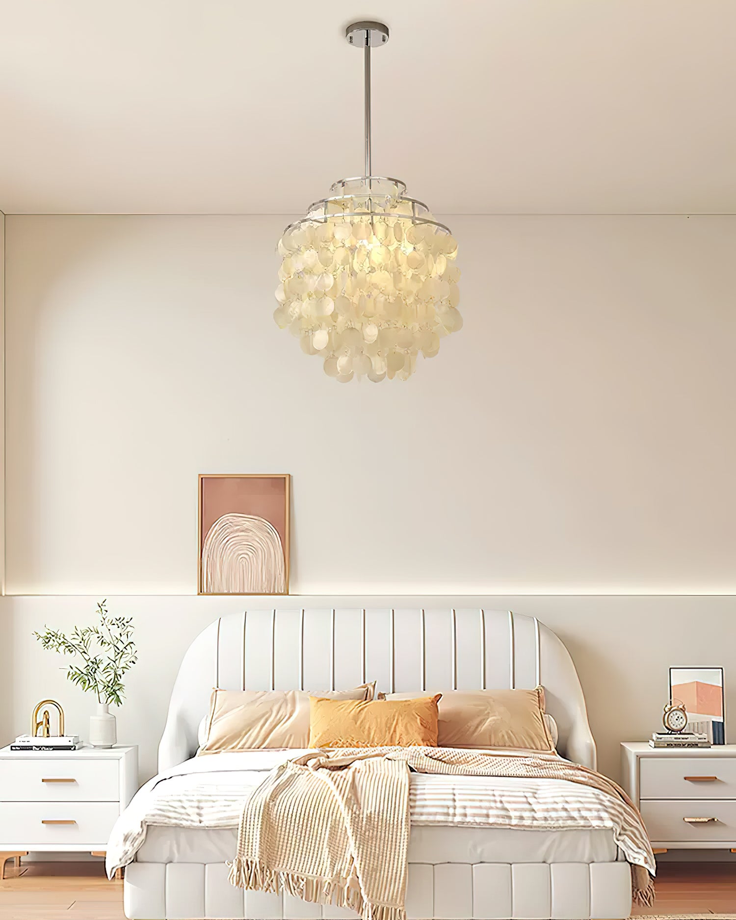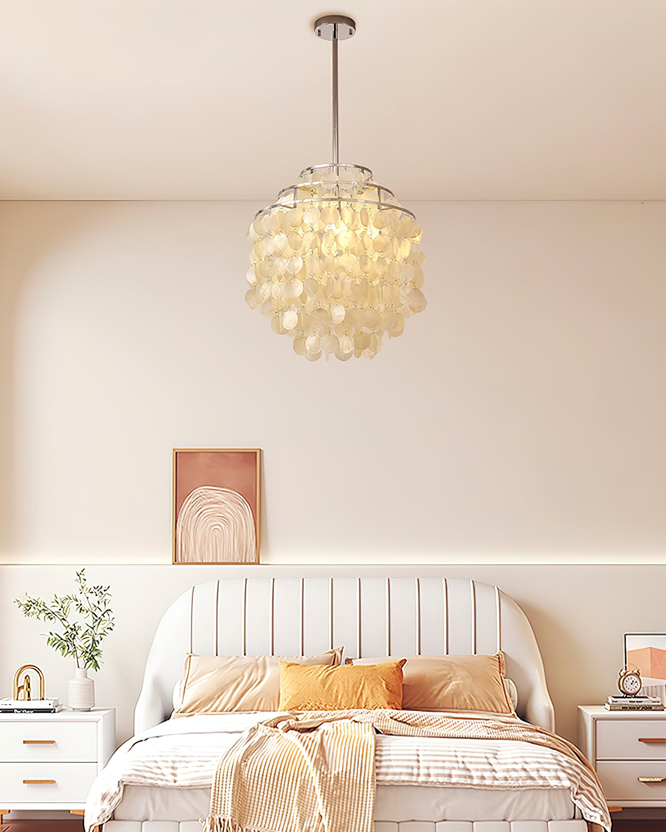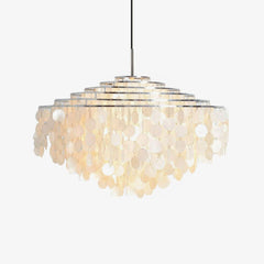 Tässä pyöreäkuorisessa kattokruunulampussa on kiiltävä kromattu runko, jossa on vähitellen kasvavia metallirenkaita, jotka on ripustettu ainutlaatuisen kokoisilla kuorilevyketjuilla. Kun valo on valaistu, kuorilevyjen läpikuultava pinta valaistuu, mikä luo upean valon ja varjon leikin. Täydellinen mihin tahansa tilaan, jossa tarvitaan tyylikäs ja lumoava valaisin.