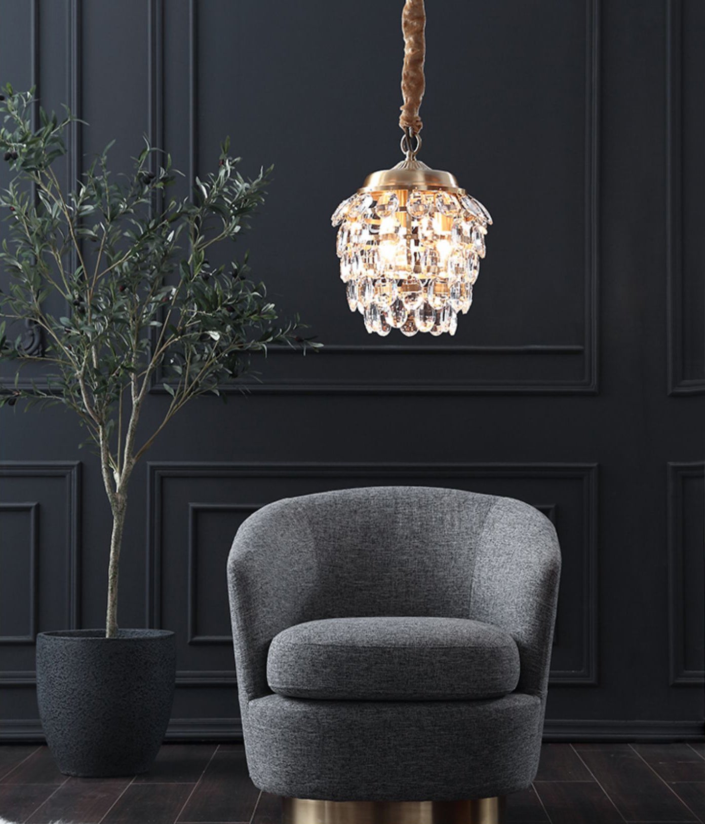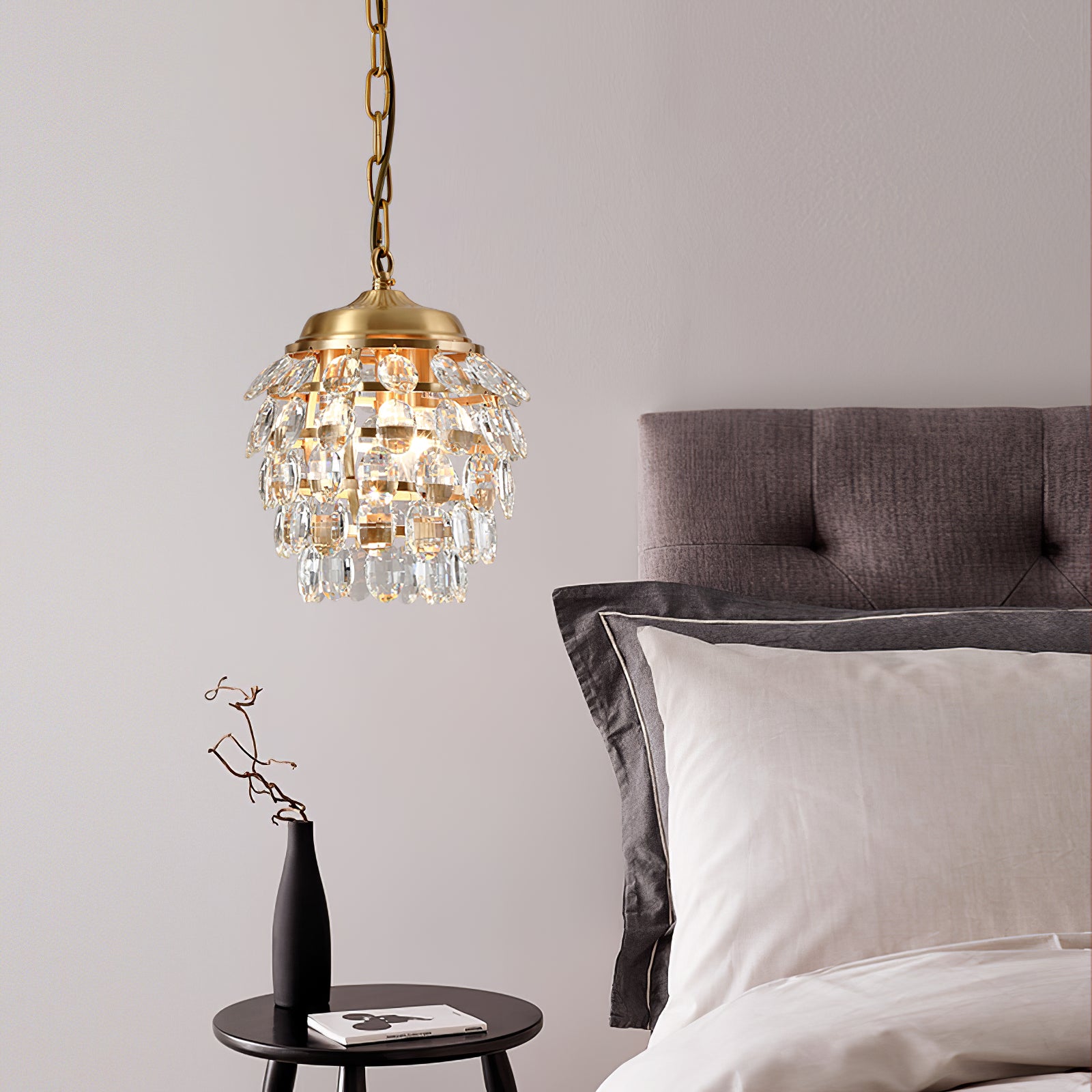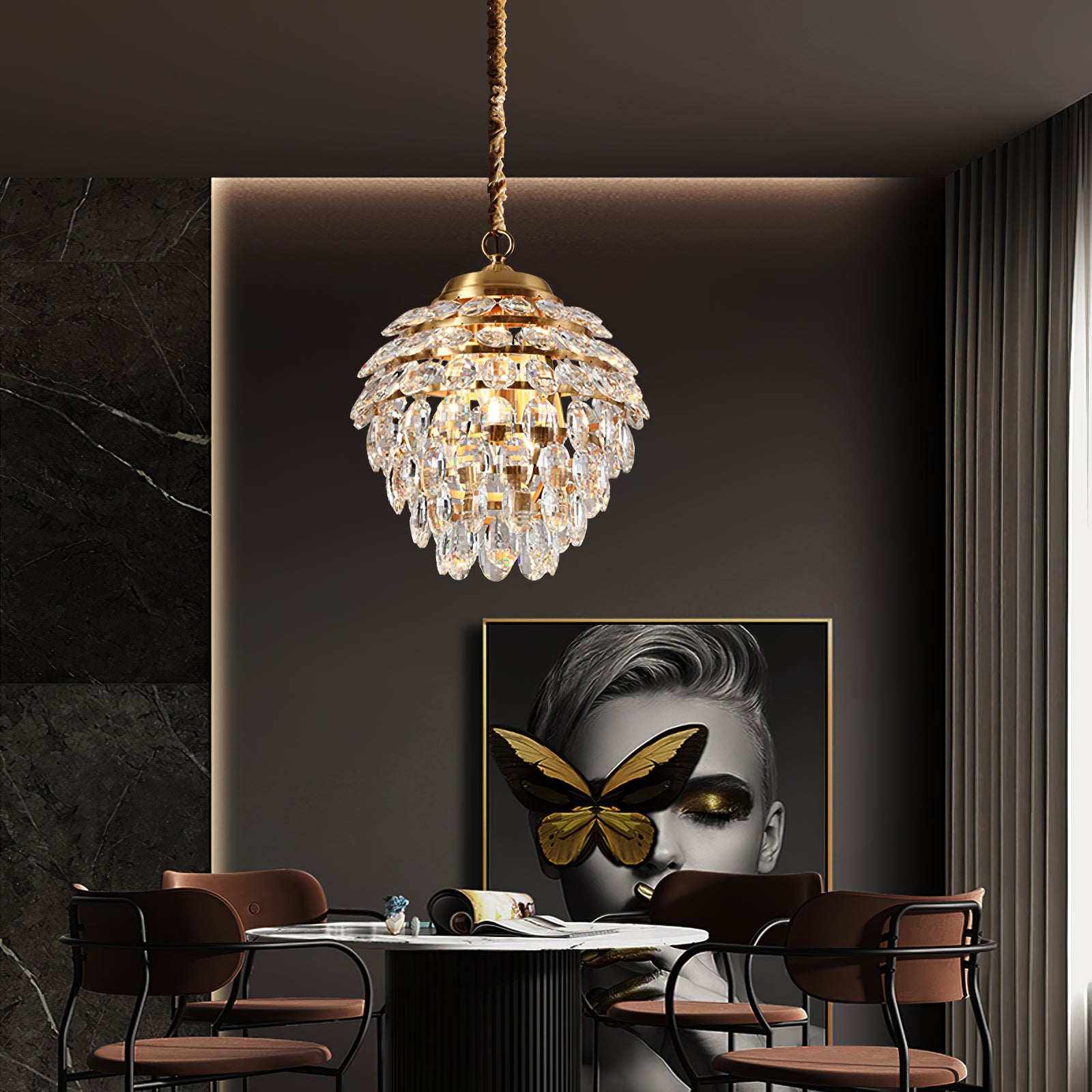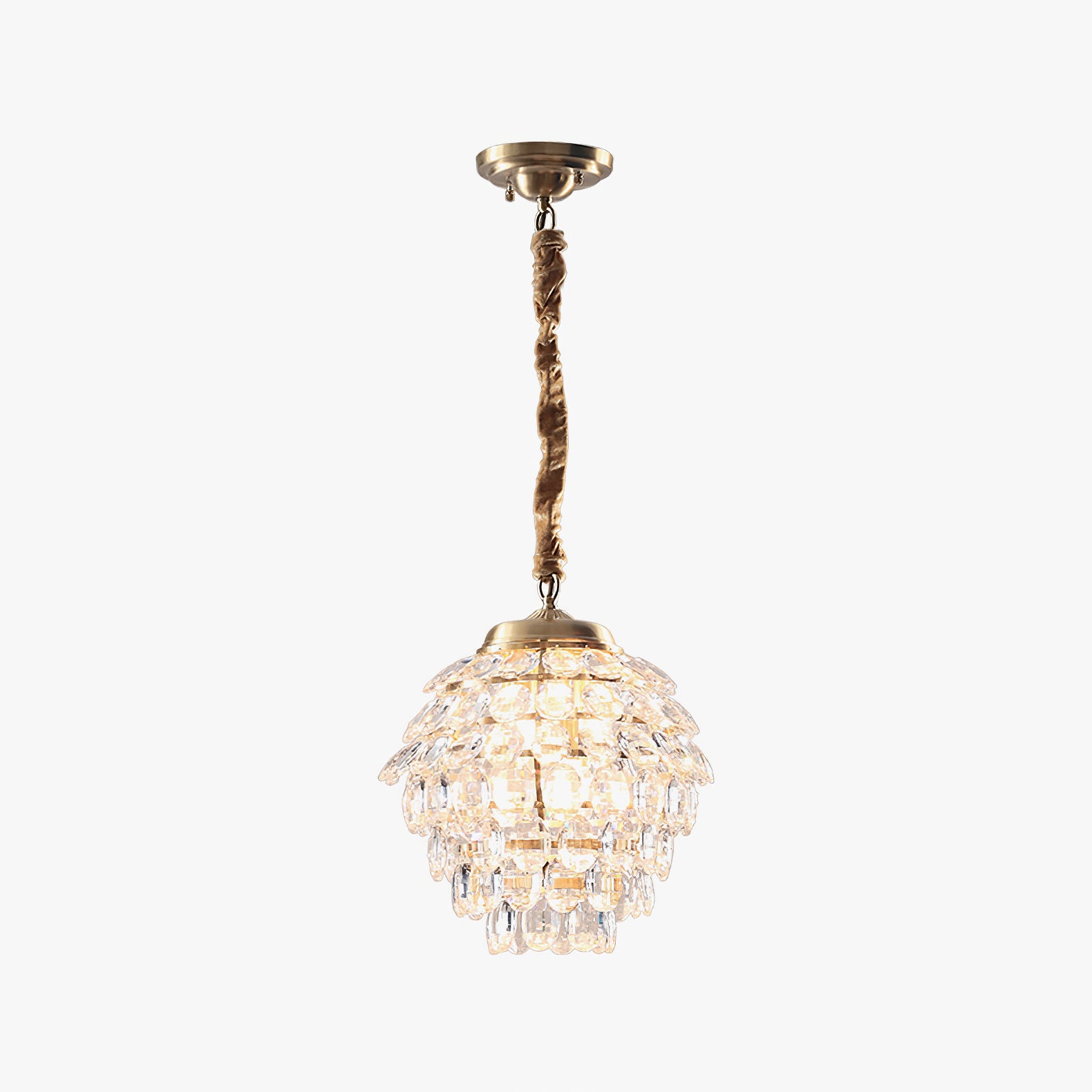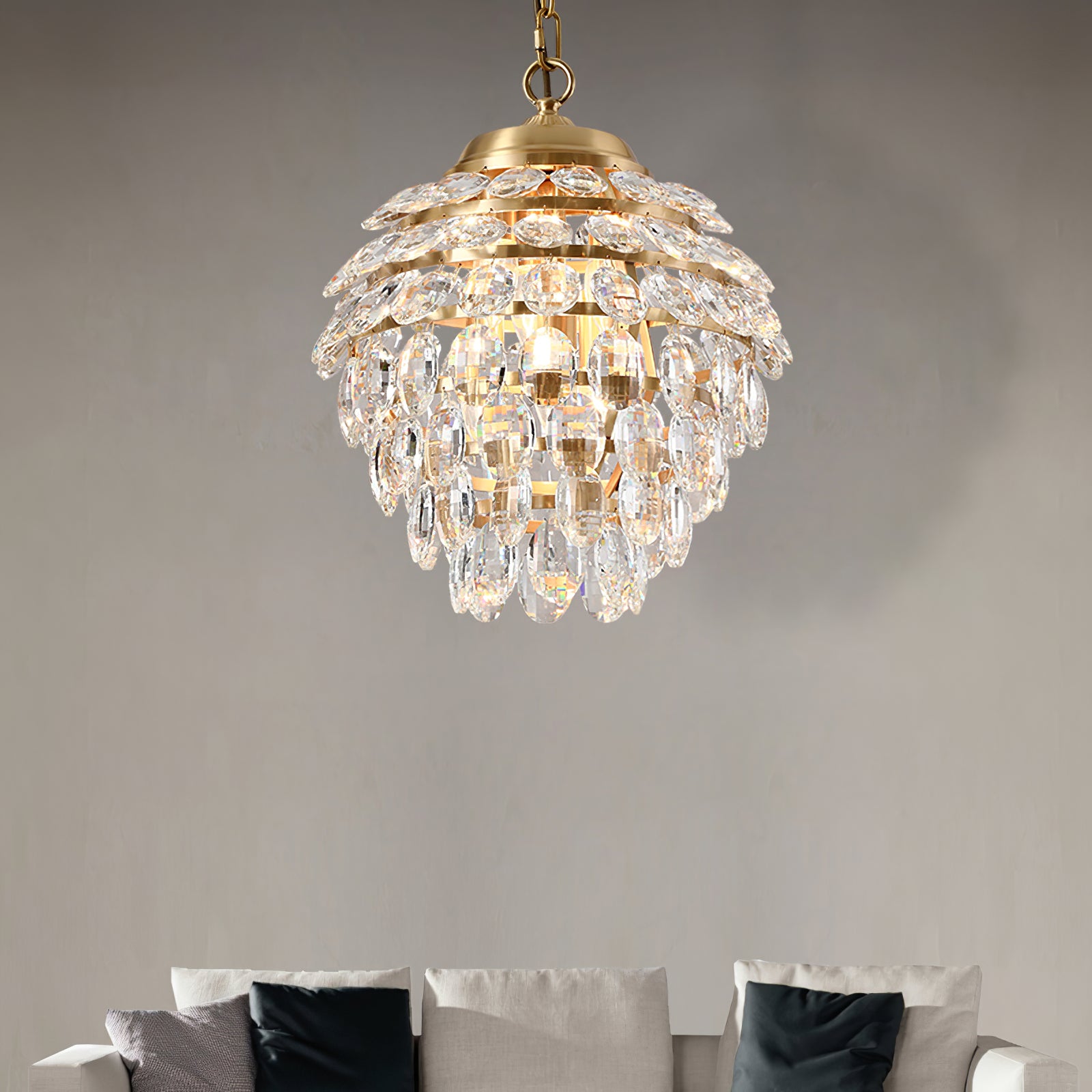 Tämä kristalliriippuvalaisin tuo katseenvangitsijaa, vintage-vaikutteista tyyliä eteiseen tai ruokailuhuoneeseen. Se on valmistettu messingistä, jossa on messinkiviimeistely, ja siinä on selkeät kristallikorostukset, jotka luovat kohonneen ilmeen. Tässä riippuvalaisimessa on kuomu ja yhdistetty ketjun alasauva ripustaen useita metallisia vaakarenkaita. Kirkas kristalli roikkuu sormuksista luoden kimaltelevaa porrastettua estetiikkaa.