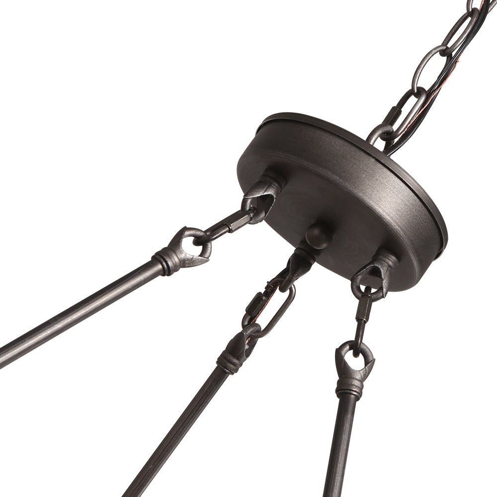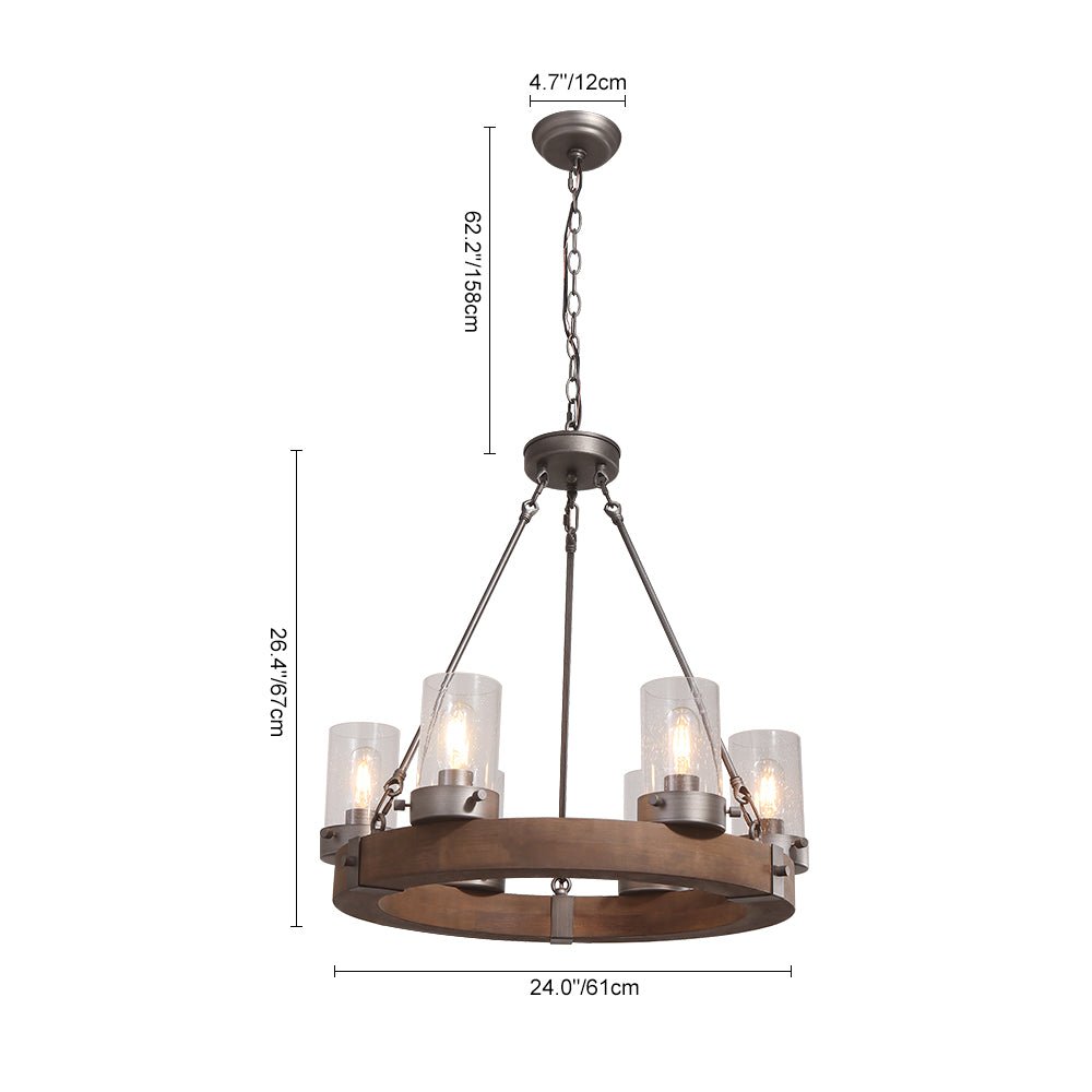 Kuusi lieriömäistä kylvetty lasivarjostin istuvat paksun luonnonpuurenkaan päällä rakentaakseen tämän maalaismaisen 6-kevyisen vaunun pyöräkruunun. Antiikkiharjatulla hopealla viimeistellyt metalliset ripustustangot ja ketju lisäävät teollisen korostuksen tähän maalaistalon pyöreään kattokruunuun. Tämä ruskea puupyöräkruunu, jossa on keskipitkät E26/E27-lamput (ei sisällä), tarjoaa ikonisen tavan tuottaa navetta tai mökkituloksia olohuoneessasi, ruokasalissa, makuuhuoneessa, keittiösaarekkeessa tai eteisessä.Tiedot