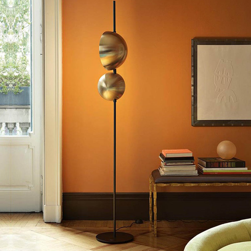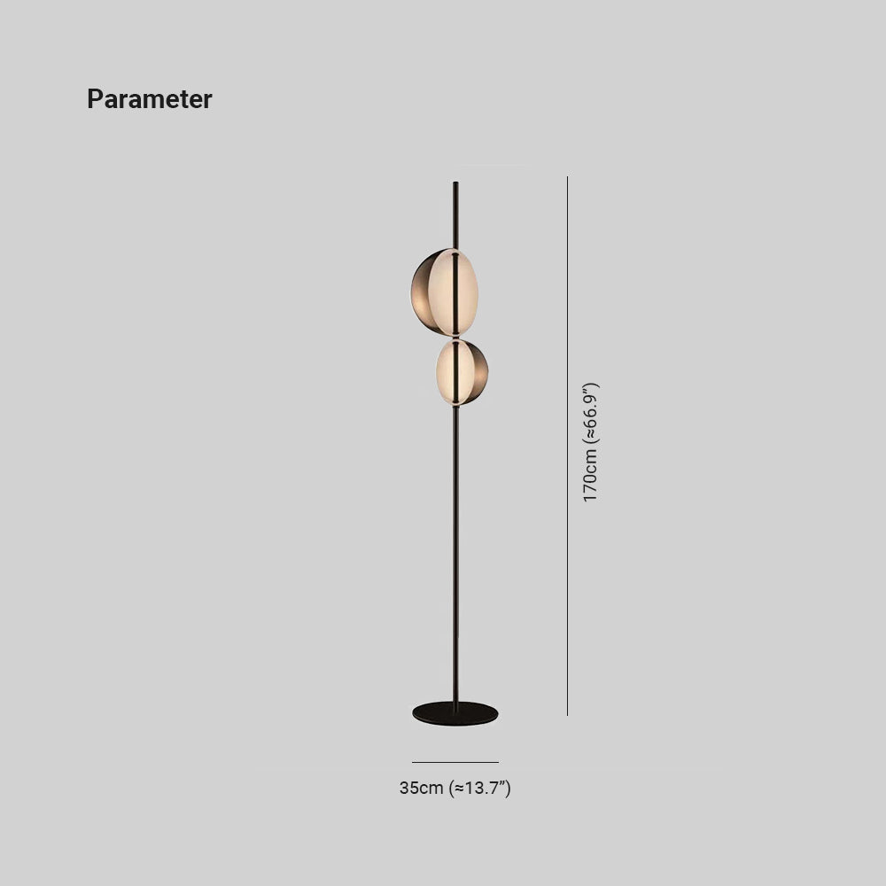 - Koko lattiavalaisin koostuu lampunpitimestä ja kahdesta eri pyöreästä metallivarjostimesta, joissa on pyöristetyt reunat ja ilman kulmia turvallisuuden vuoksi.