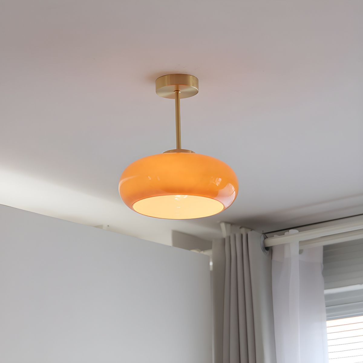 - Se on väriltään eloisa oranssi, joka tuo annoksen lämpöä ja elinvoimaa mihin tahansa asuintiloihin. Lasin varjostimen oranssi sävy suodattaa valoa luoden lämpimän ja kutsuvan hehkun, joka saa olohuoneesi tuntumaan kodikkaalta.