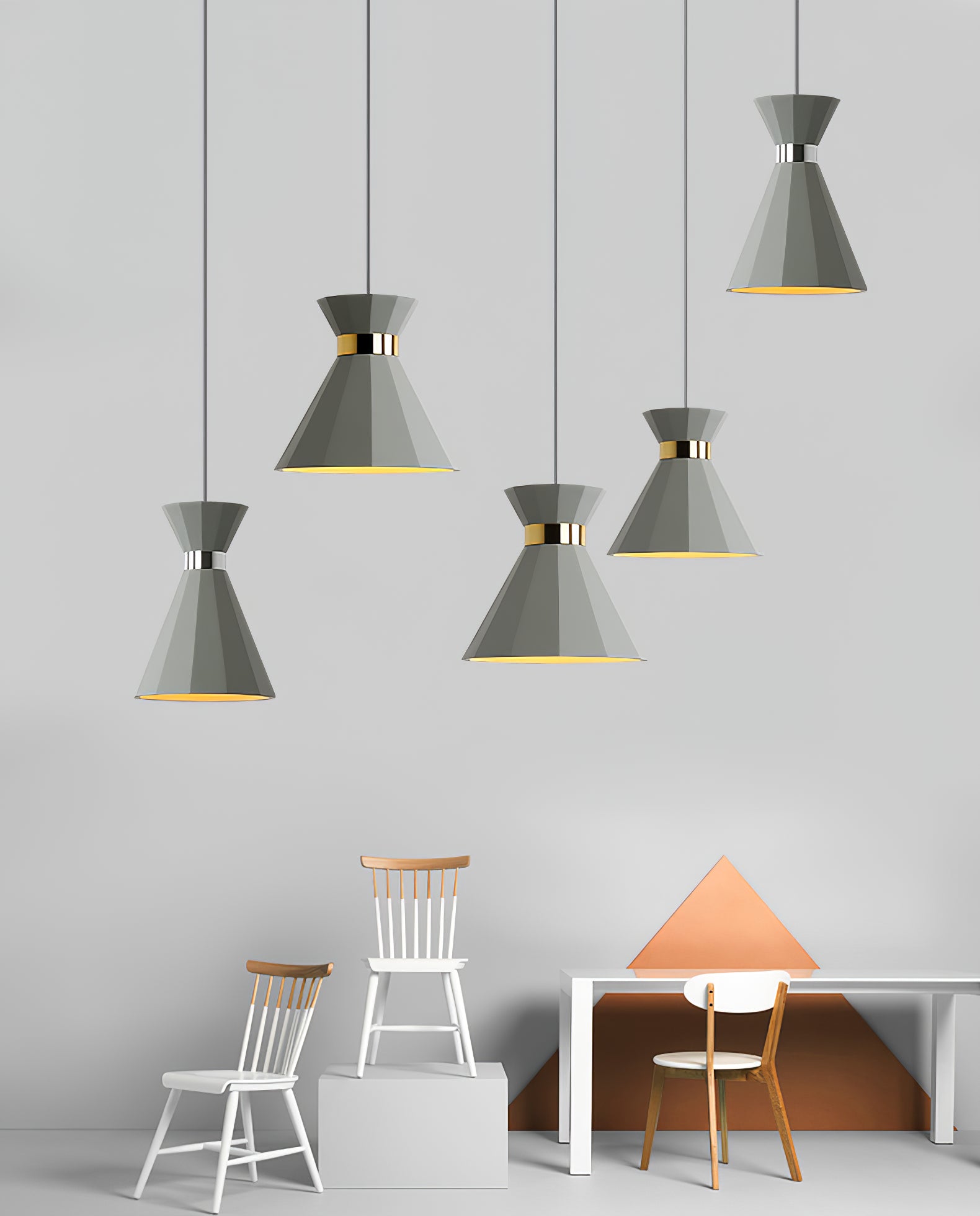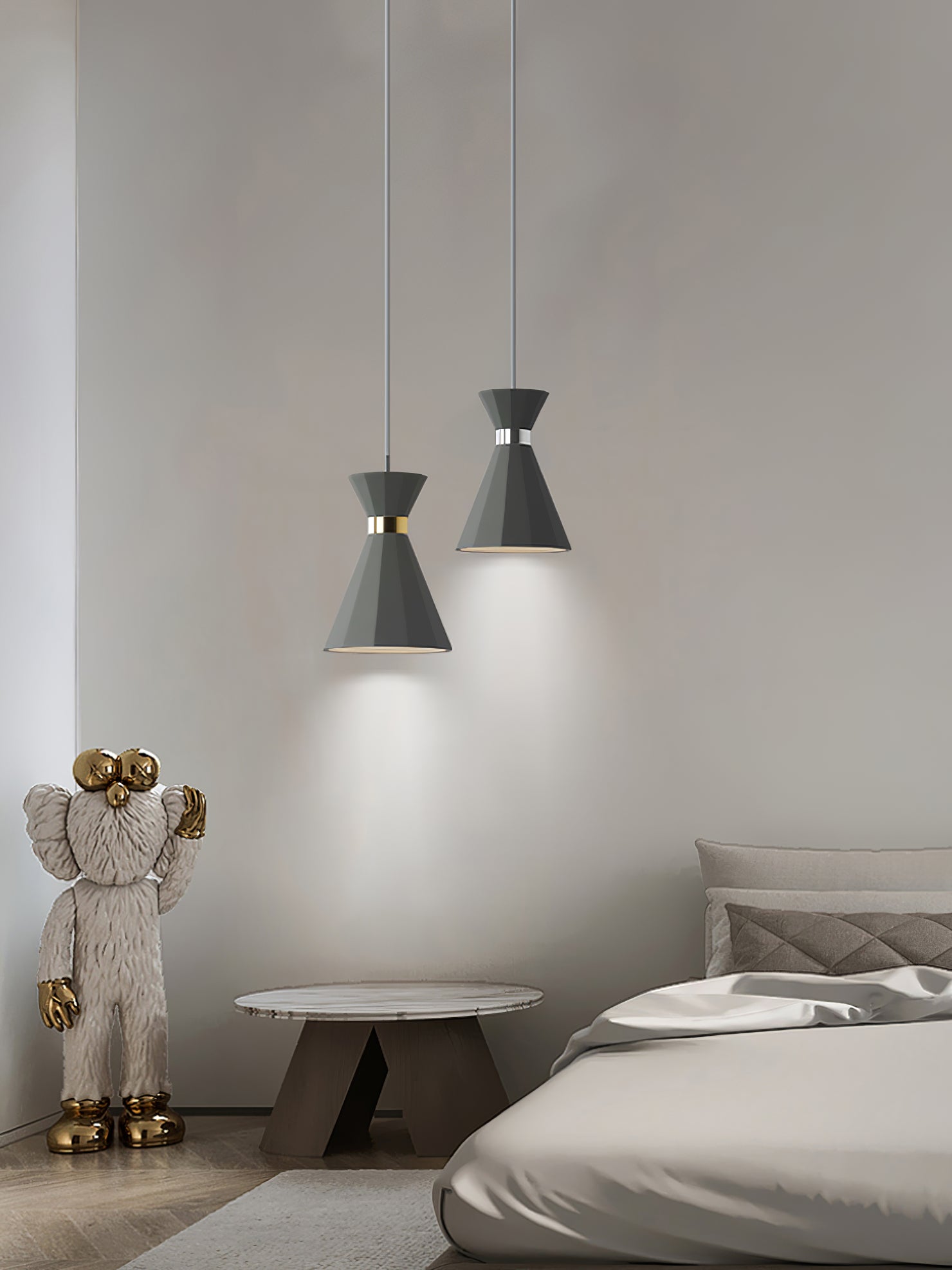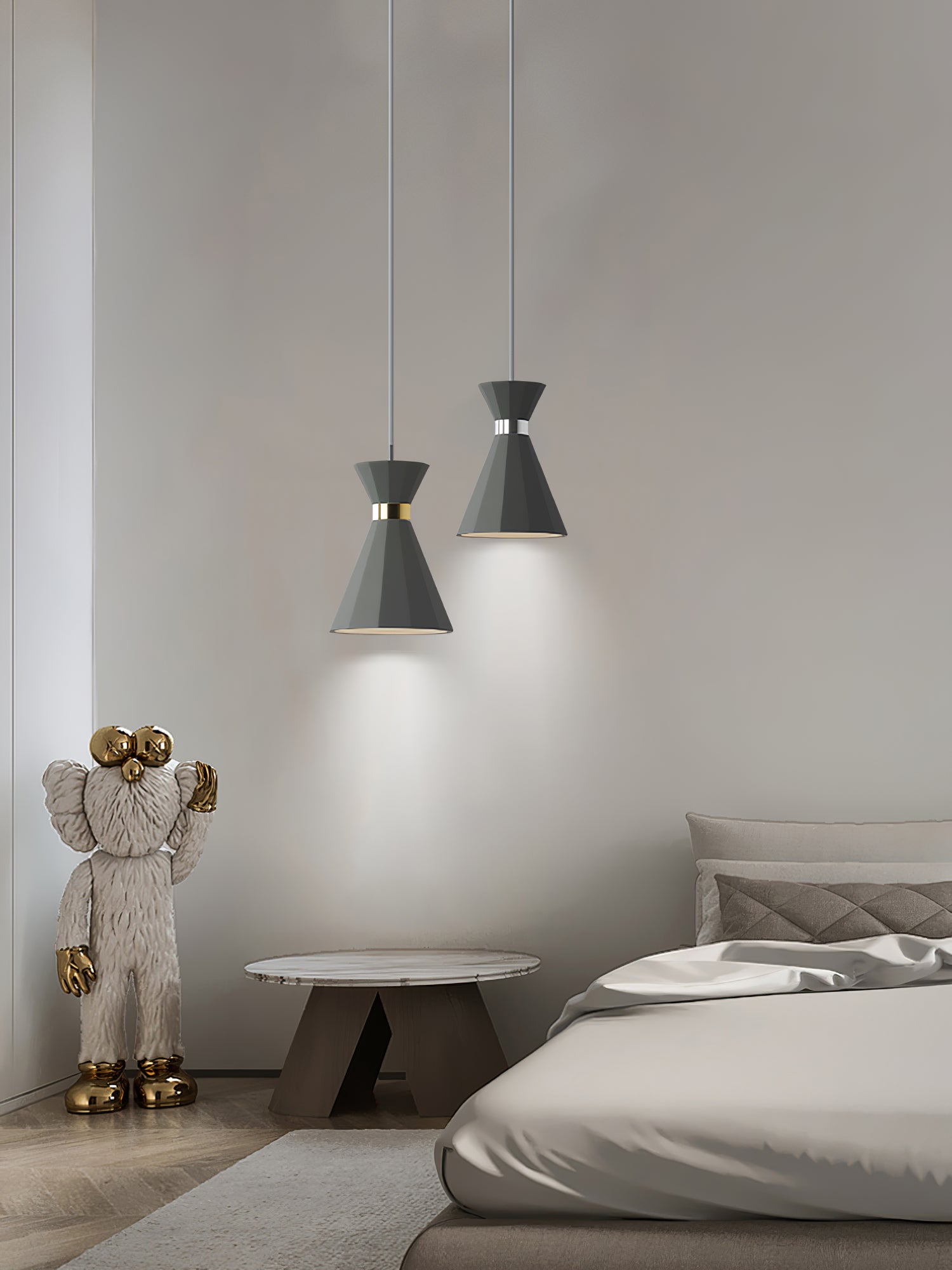 Raskaat kartiomaiset riipukset harmaasta betonista, joissa molemmissa on kiillotettu kromi/kultakoristeet, heijastavat runsaasti valoa alaspäin mukana toimitettujen E27-lamppulamppujen avulla.