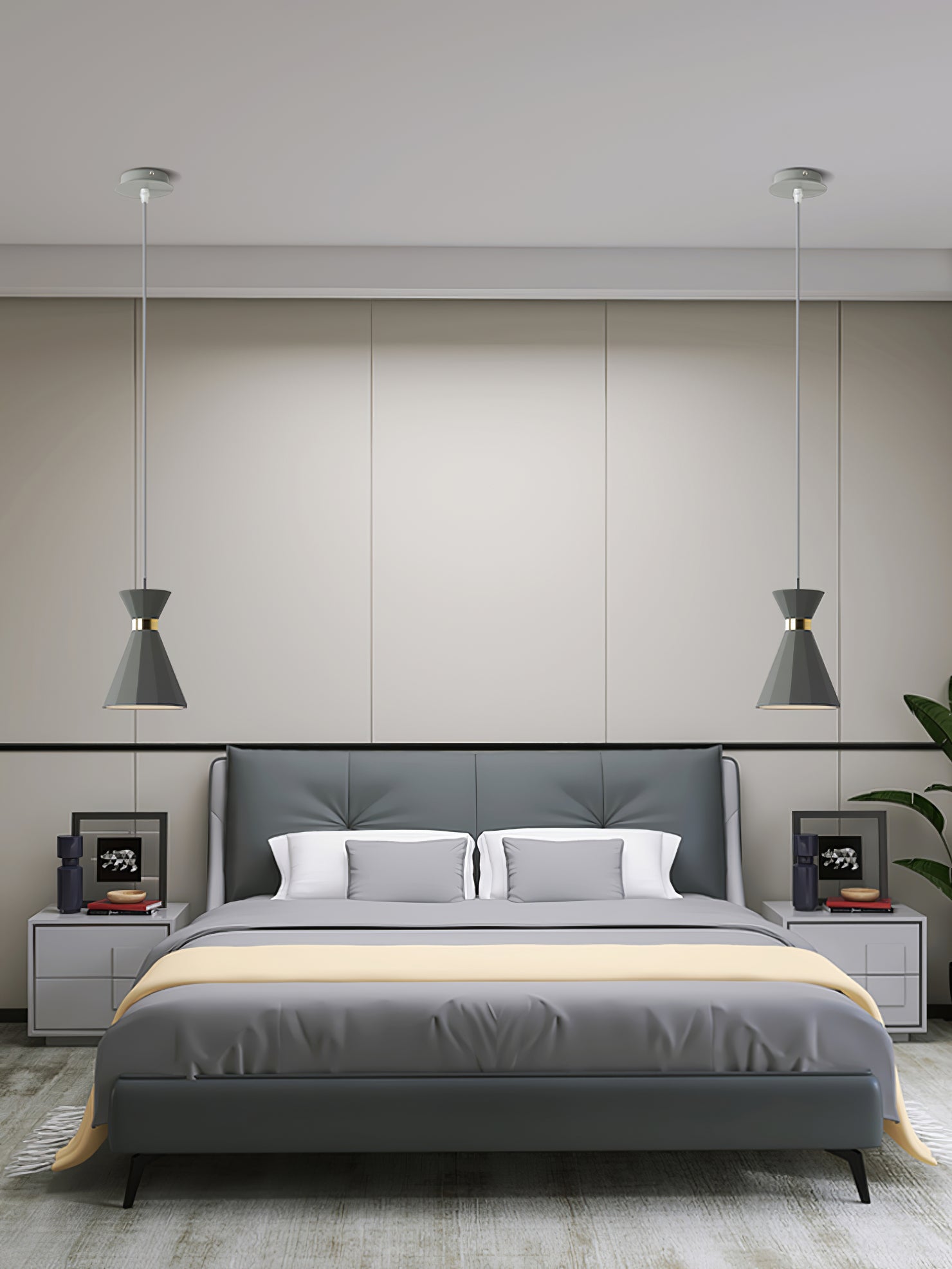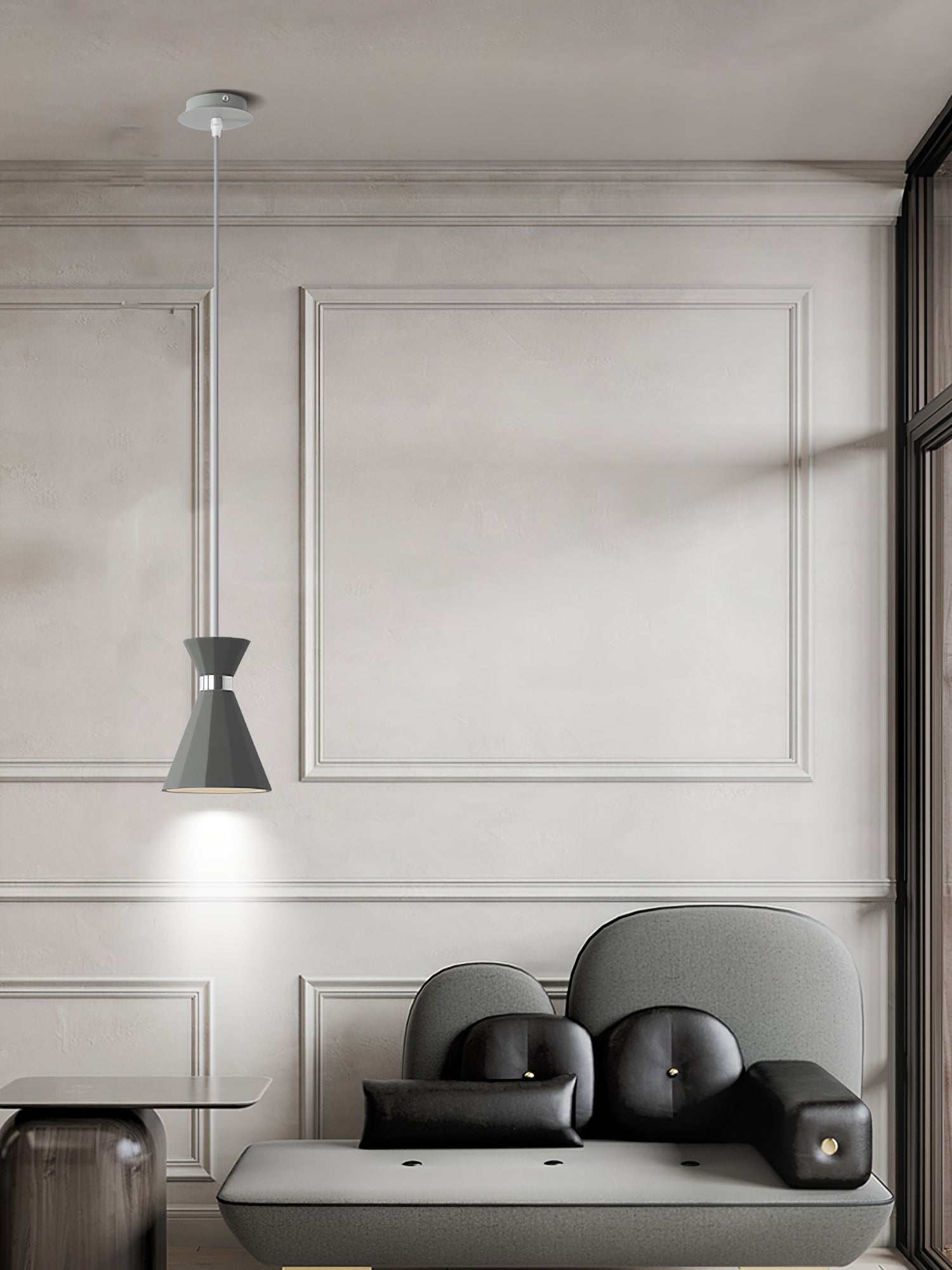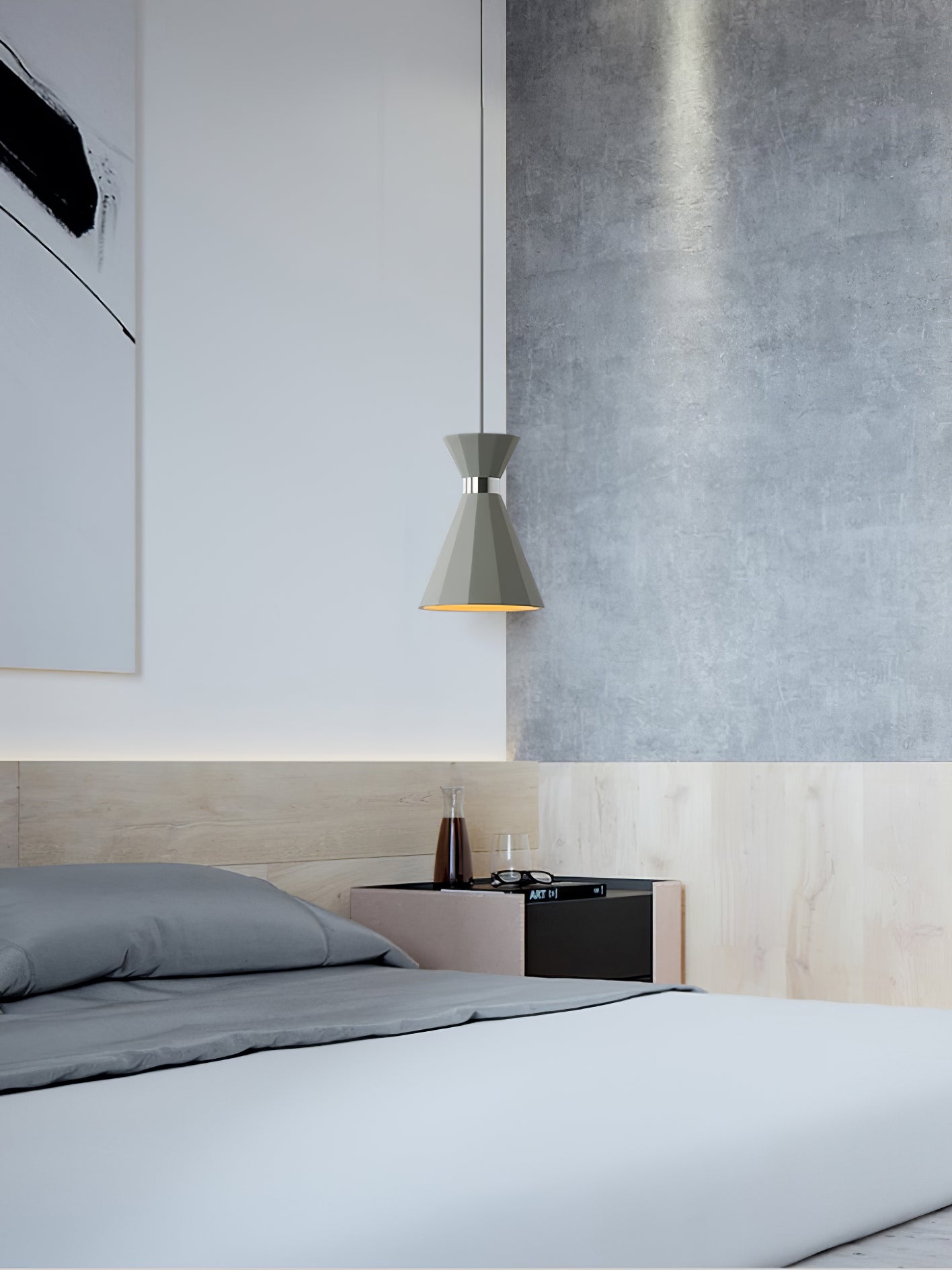 Raskaat kartiomaiset riipukset harmaasta betonista, joissa molemmissa on kiillotettu kromi/kultakoristeet, heijastavat runsaasti valoa alaspäin mukana toimitettujen E27-lamppulamppujen avulla.