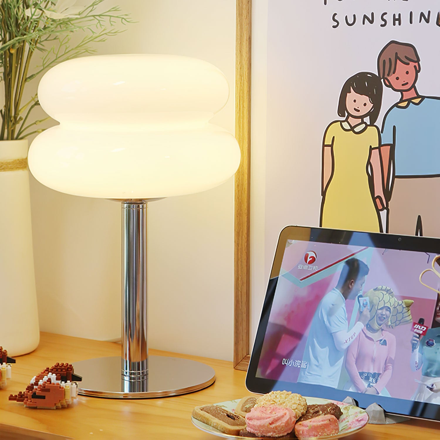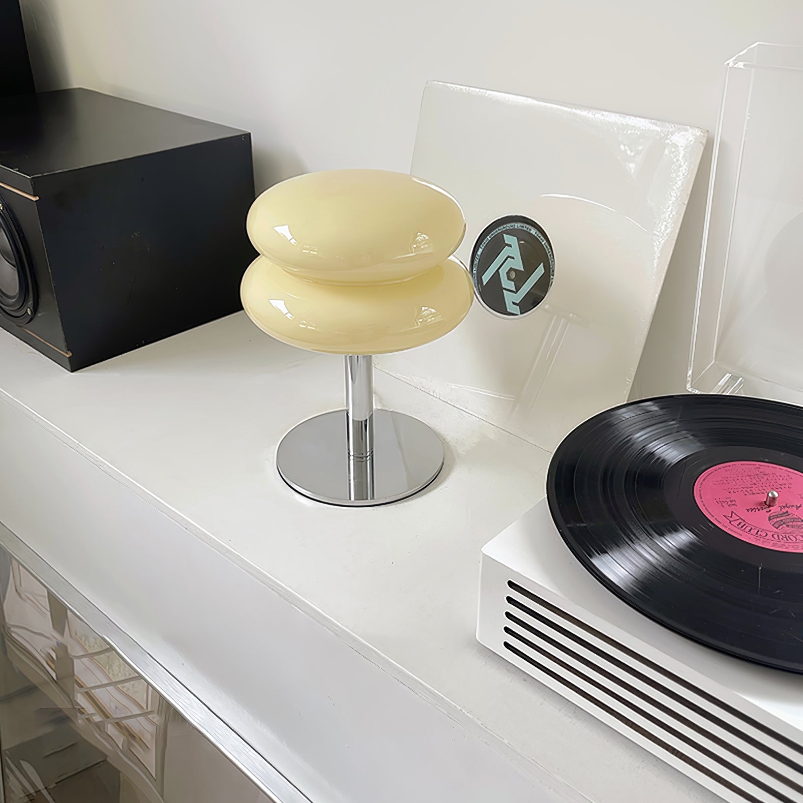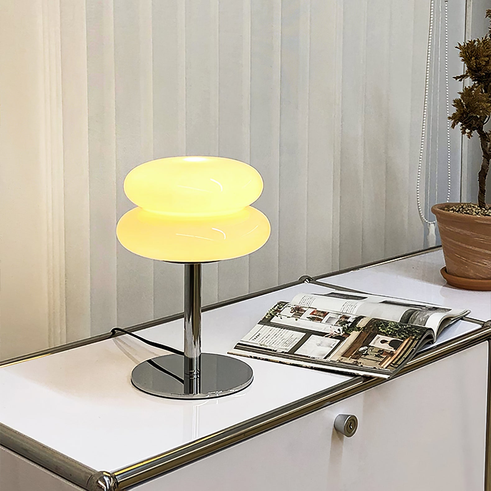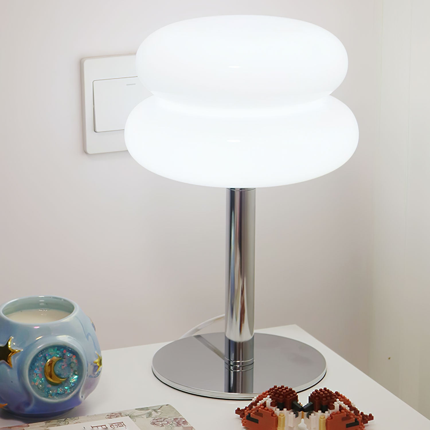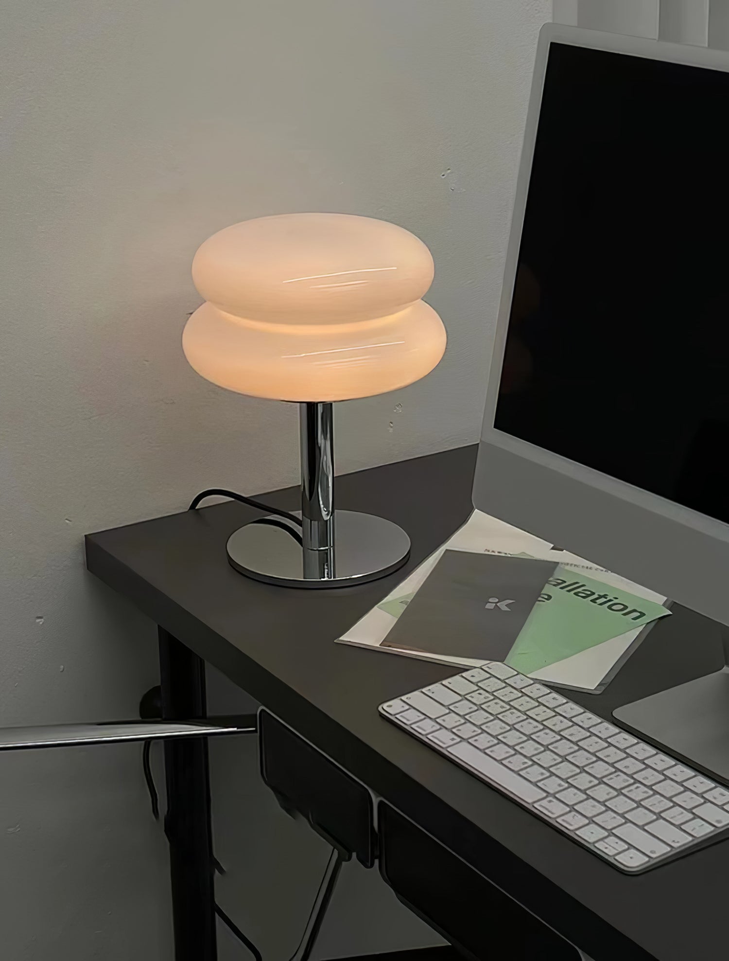 Tämä lamppu tuo esiin Saturnuksen kuvan erottuvilla renkailla, ja siinä yhdistyvät kiiltävä metallijalusta ja kaunis lasivarjostin, joka vangitsee kuudennen planeetan olemuksen auringosta. Lasikomponentti on ammattitaidolla muotoiltu muodostamaan sileän, rengasmaisen siluetin, joka hajottaa valoa luoden pehmeän, tunnelmallisen hehkun. Tyylikäs, kromipinnoitettu varsi ja jalusta tukevat valaisin on harmoninen sekoitus moderneja materiaaleja ja ajatonta muotoilua. Täydellinen niille, jotka etsivät ripaus tähtitieteellistä ihmettä kodin sisustukseen, Saturn Glide Glass -pöytävalaisin on tyylikäs ja toimiva valaisin, joka tarjoaa lämpimän ja kutsuvan valon kaikkiin tiloihinsa.
