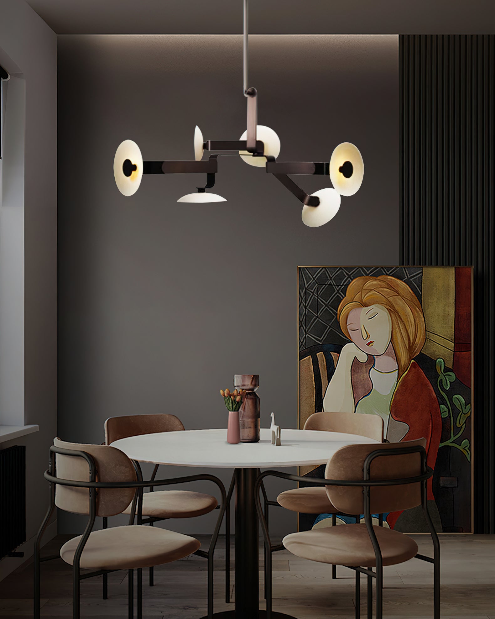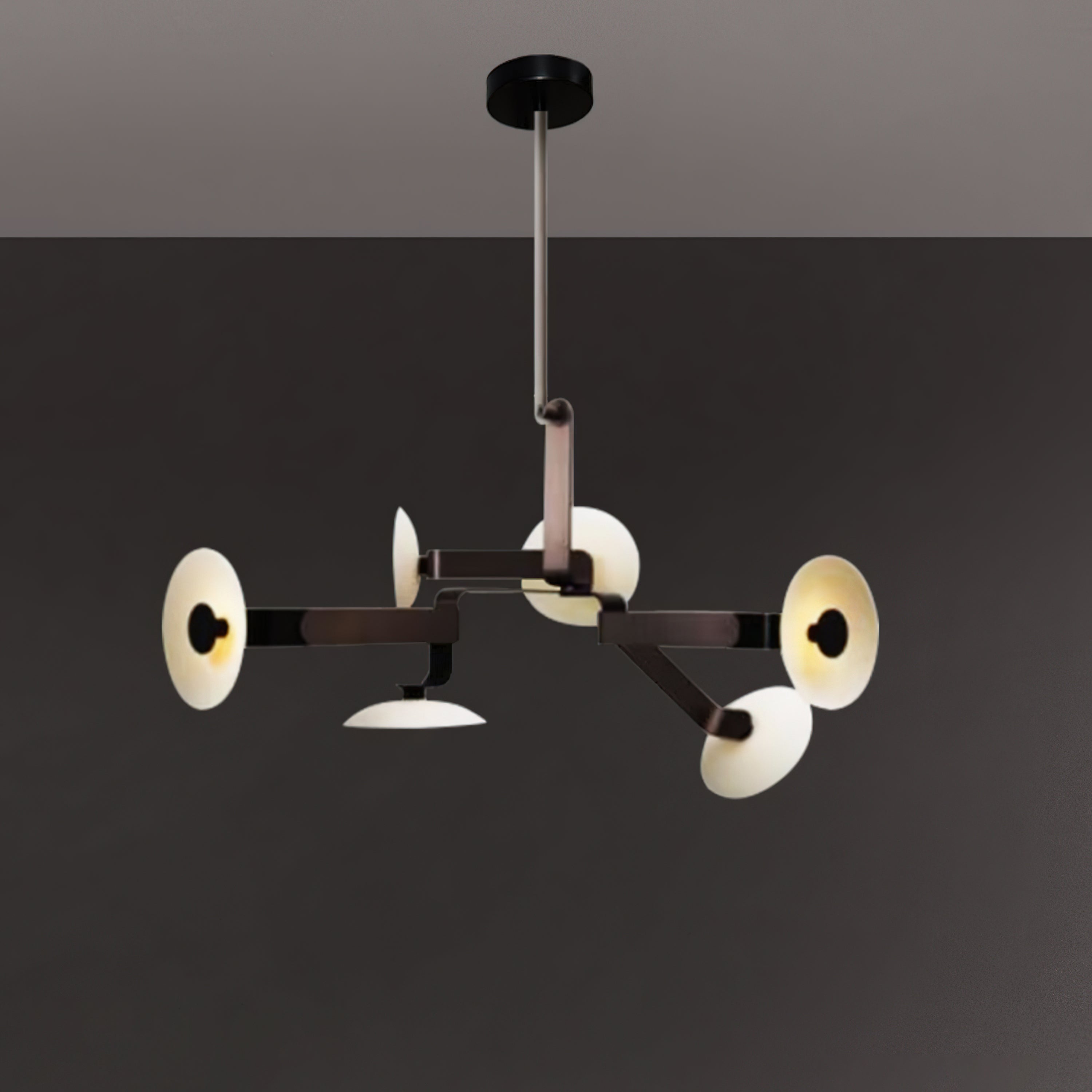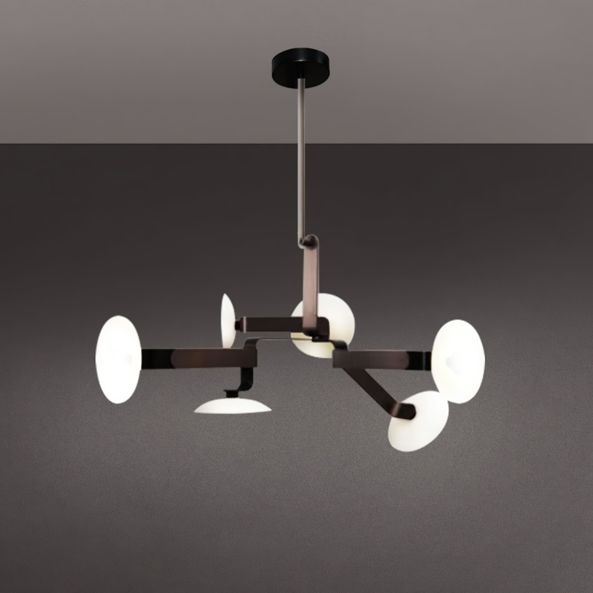 Tämä kattokruunu tarjoaa yksinkertaisen mutta modernin muotoilunsa ansiosta tyylikkään ja toimivan valaistusratkaisun mihin tahansa tilaan. Hienosti muotoiltu takorautarunko ja sen mattamusta pinta antavat tälle lampulle hienostuneen mutta kestävän tunteen. Neljä ulospäin ulottuvaa vartta on jaettu symmetrisesti, ja ne lähettävät lämmintä ja tasaista valoa. Tämä kattokruunu ei ainoastaan valaise huonettasi, vaan se toimii myös osana modernia kotisi sisustusta ja sulautuu täydellisesti erilaisiin sisustustyyleihin.