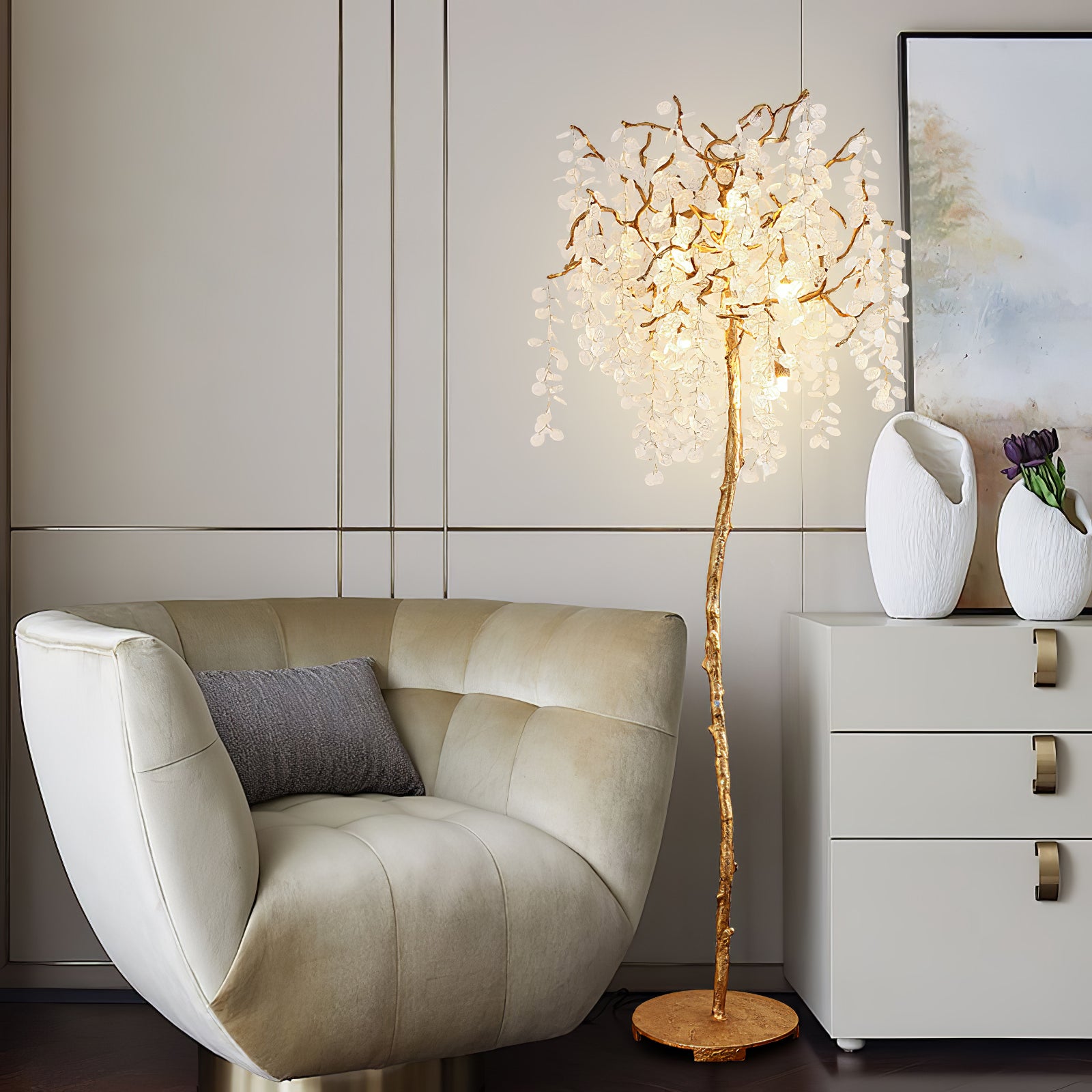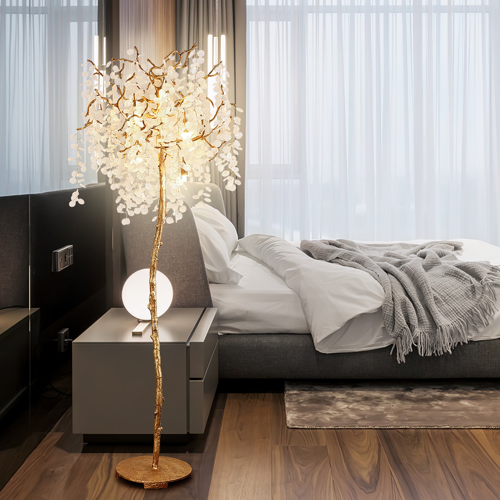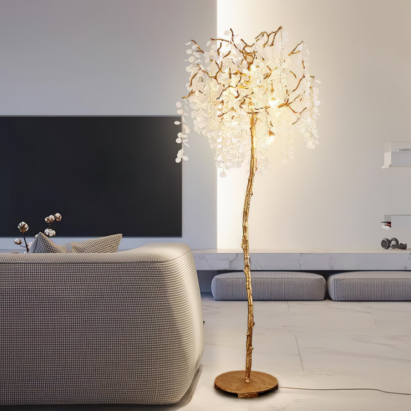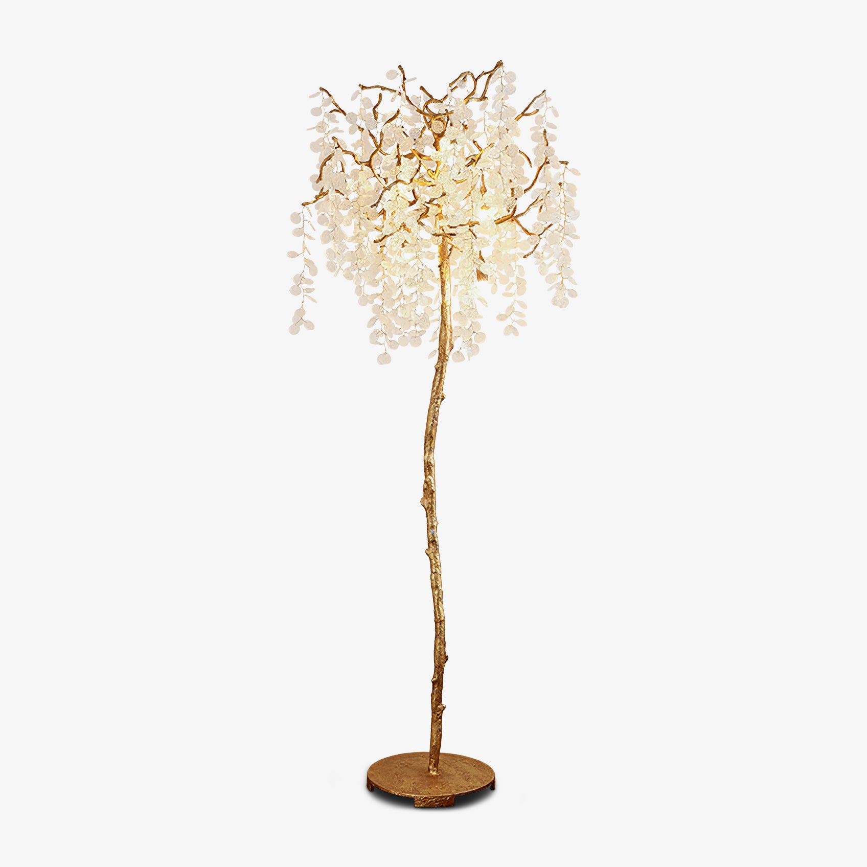 Shiro Noda Floor Light on henkeäsalpaava yhdistelmä modernia eleganssia ja luonnon kauneutta. Sen orgaaniset lehdet ja oksat luovat siron rakenteen, jota kehystävät hienovaraisesti kimaltelevat lasikolikot, jotka putoavat sen pinnalle. Ihanteellinen tilaviin huoneisiin, joissa on korkea katto, Shiro Noda Floor Light huokuu hienostuneisuutta ja hienostuneisuutta.