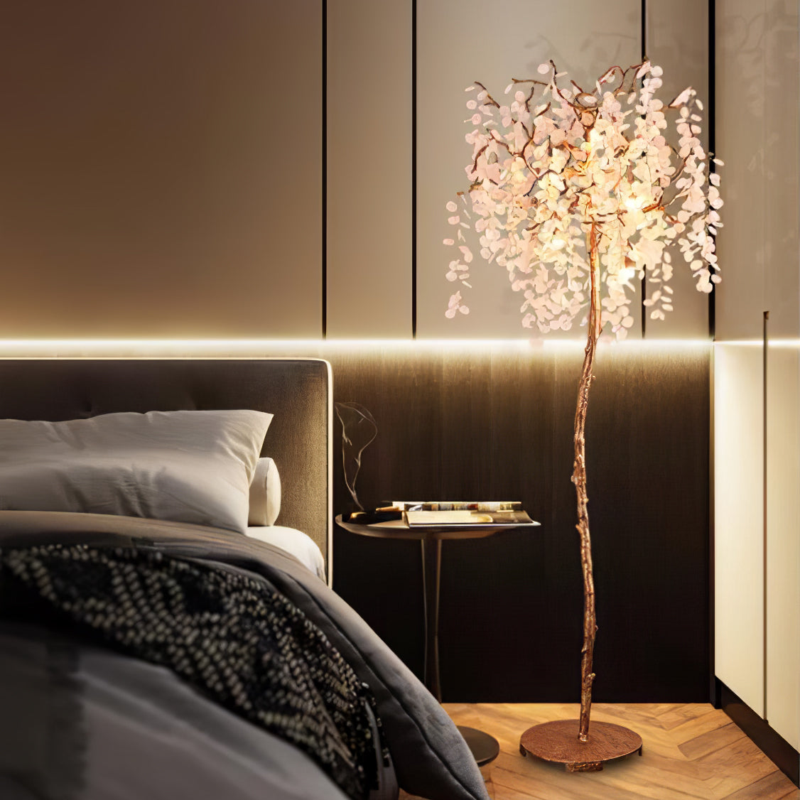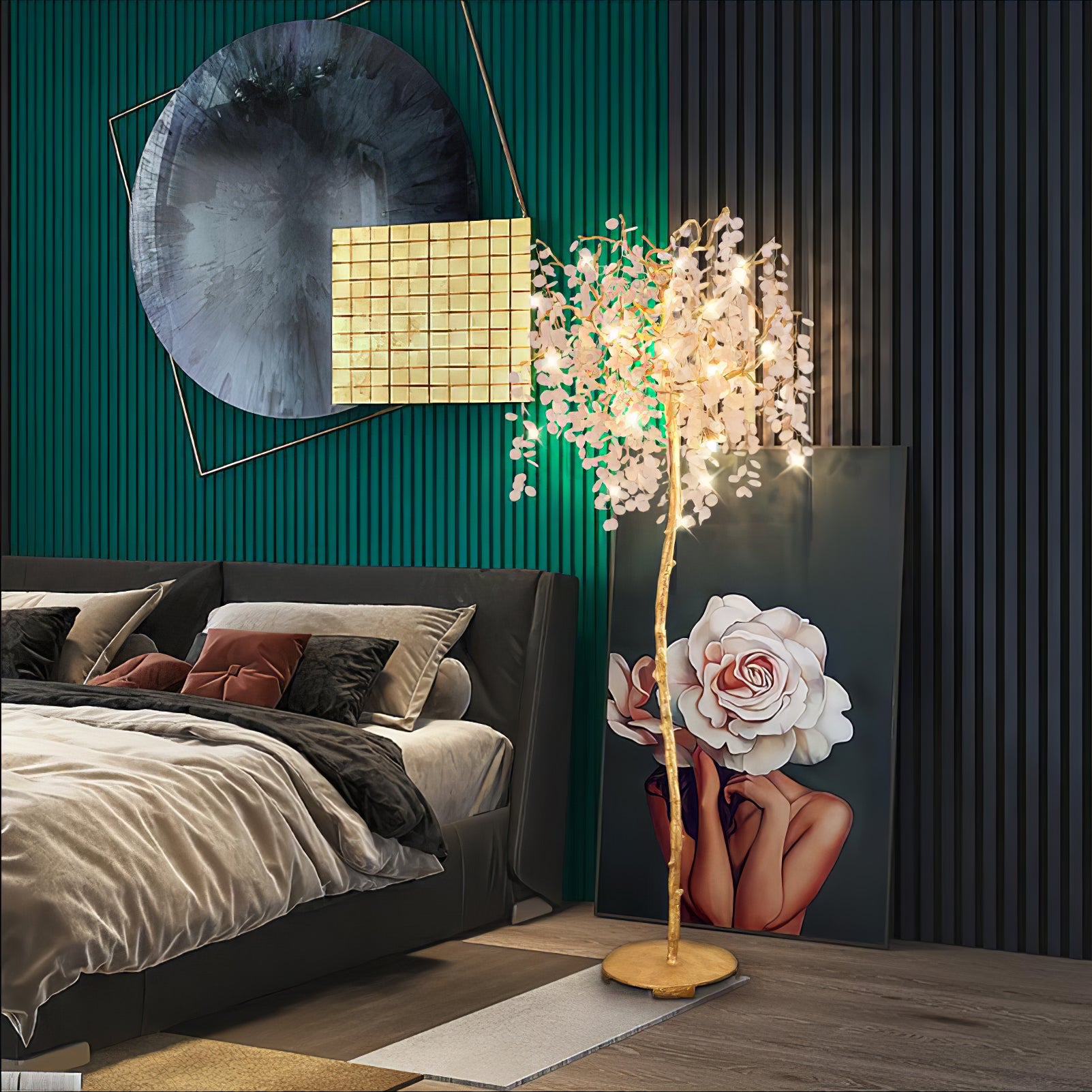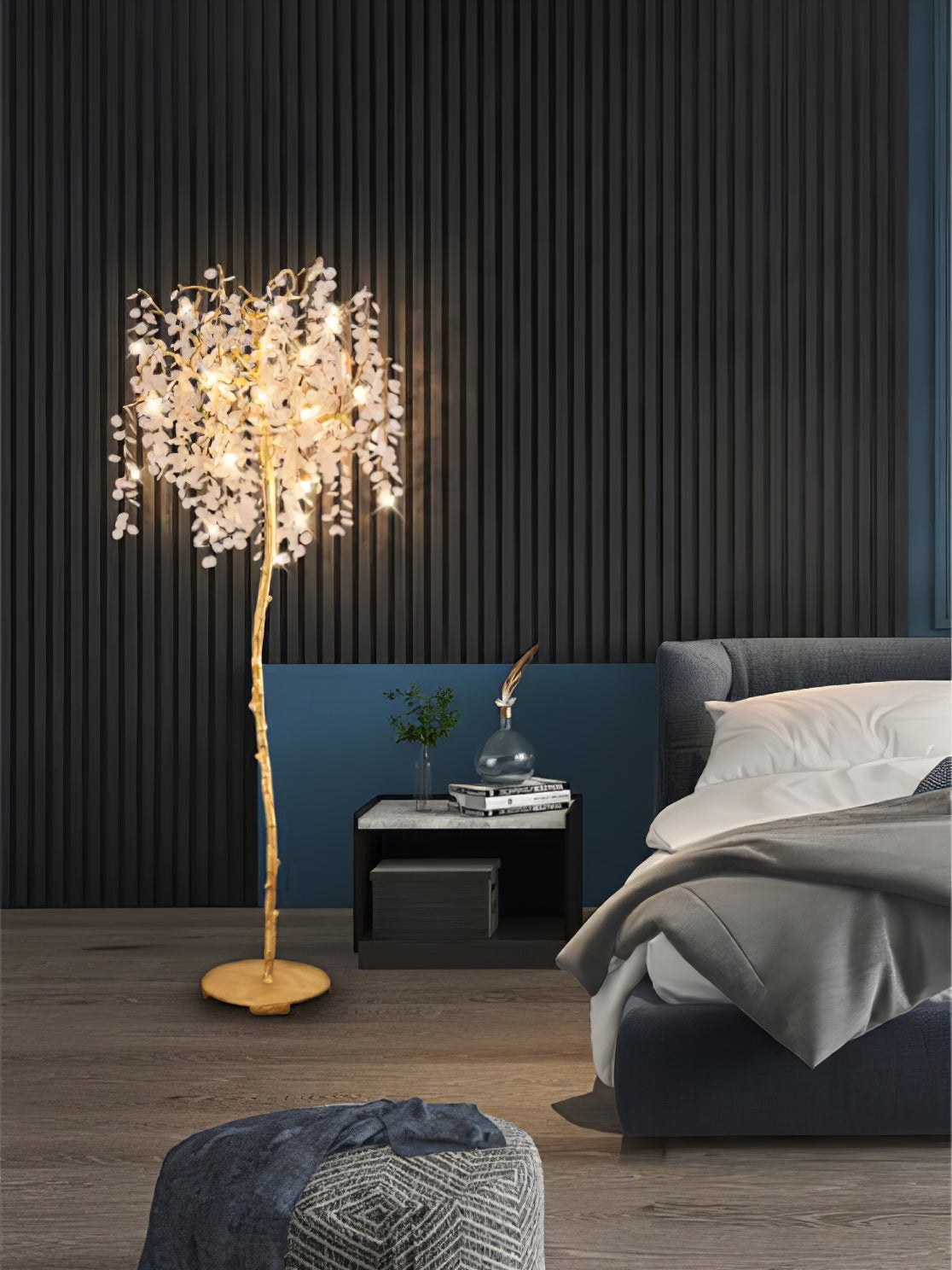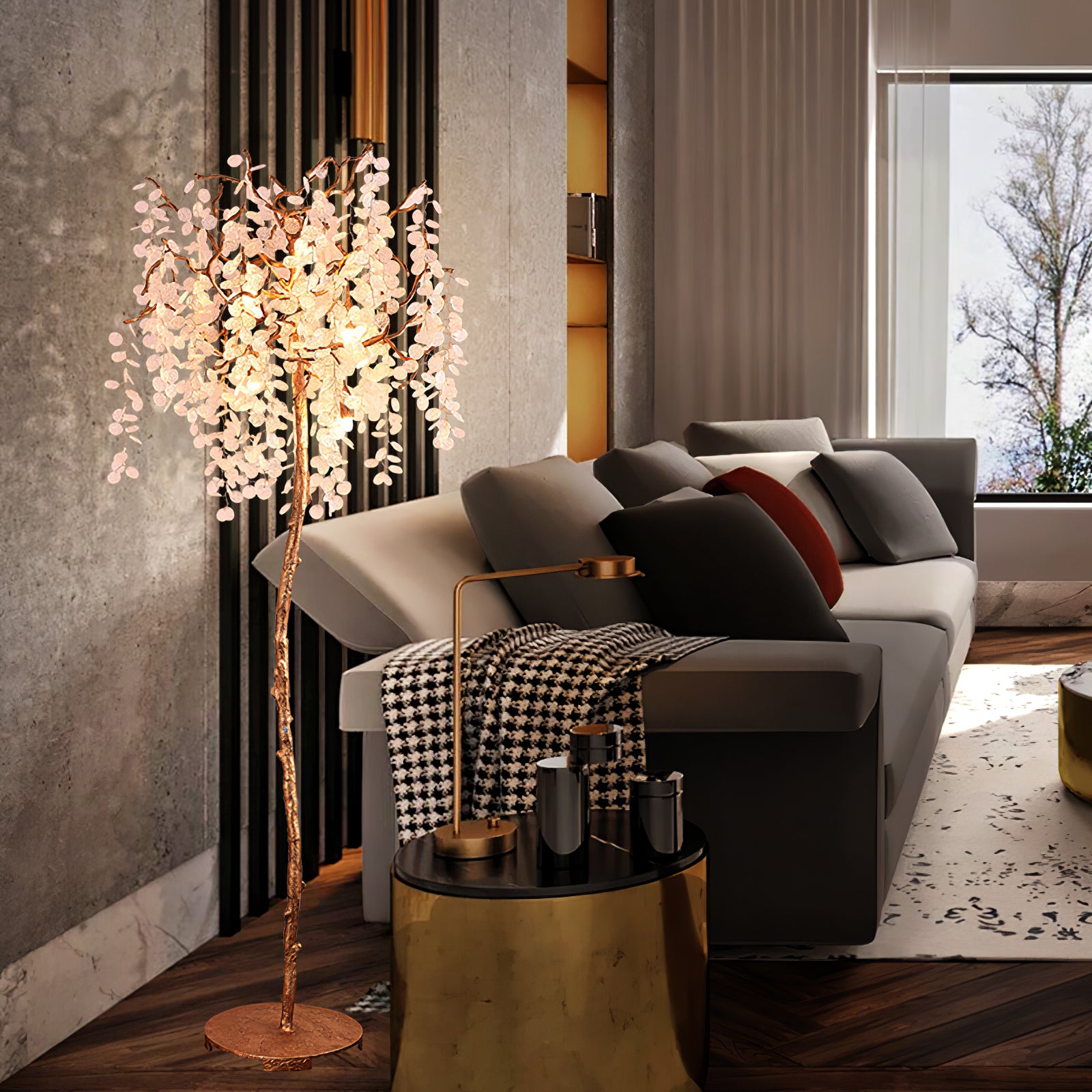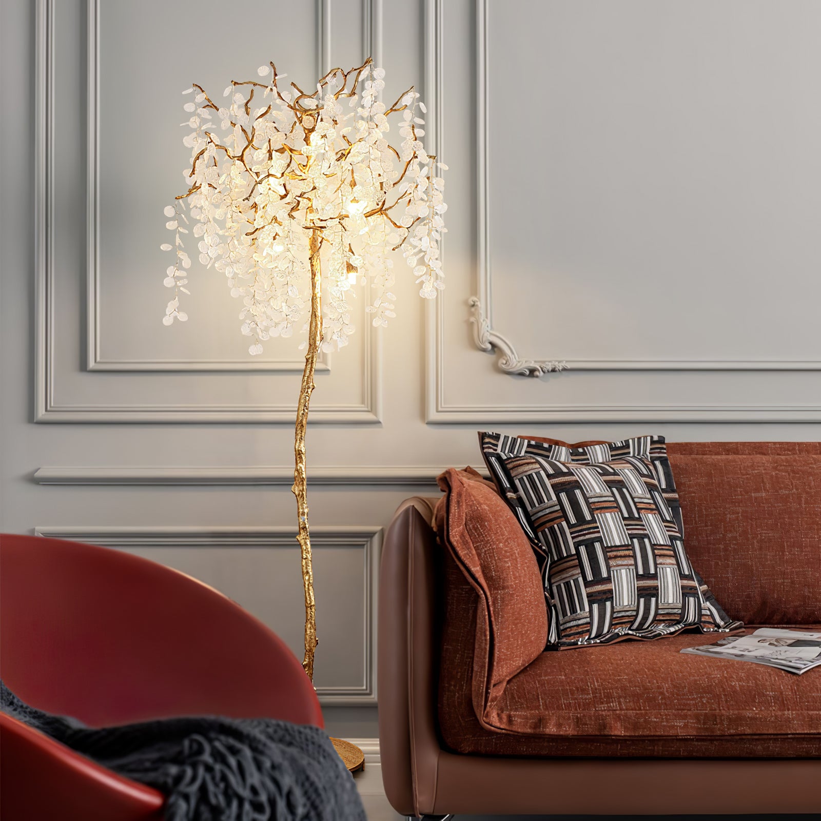 Shiro Noda Floor Light on henkeäsalpaava yhdistelmä modernia eleganssia ja luonnon kauneutta. Sen orgaaniset lehdet ja oksat luovat siron rakenteen, jota kehystävät hienovaraisesti kimaltelevat lasikolikot, jotka putoavat sen pinnalle. Ihanteellinen tilaviin huoneisiin, joissa on korkea katto, Shiro Noda Floor Light huokuu hienostuneisuutta ja hienostuneisuutta.